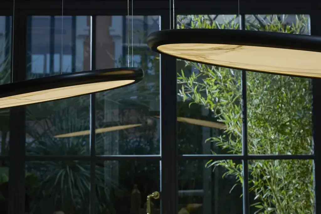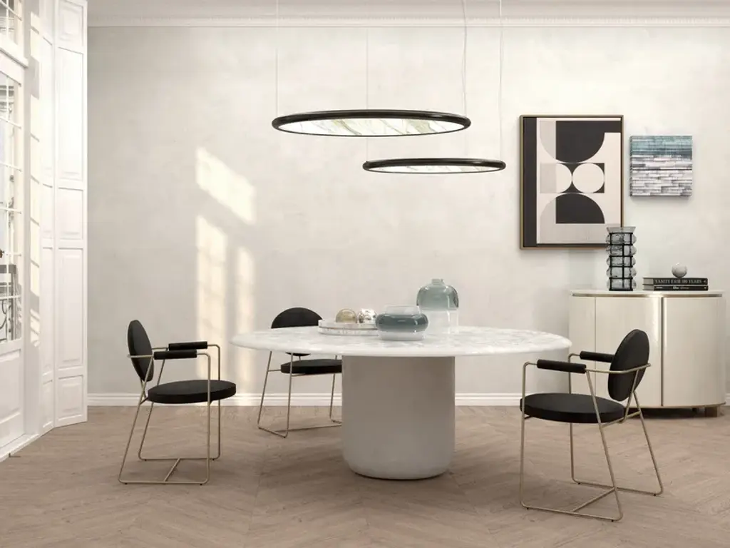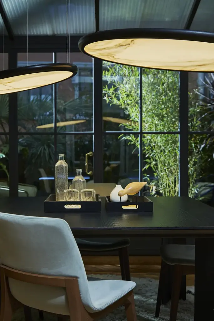 A light element that is fluid, like an object thrown upwards and which remains suspended. The idea of lightness is expressed, using a material that declares its contemporaneity, and which fits into our interiors with decisiveness and elegance. The luminous part, covered in Viennese straw set within a black lacquered oval, has a vintage yet very modern flavour – a style that reminds us of Brazilian and South American modernist interiors of the 1960s and 70s.The version with the central section covered in marble-print fabric is more striking, but always distinctive and current. Also available in white cotton shade. Bogotà is a round, soft-sounding name that perfectly represents this lamp.Light source:Small1 x 35WPanel LEDEmission: 3100 LmLarge1 x 43WPanel LEDEmission: 4100 Lm*DALI/Push dimmable*Compatibility with other dimming systems available on demand