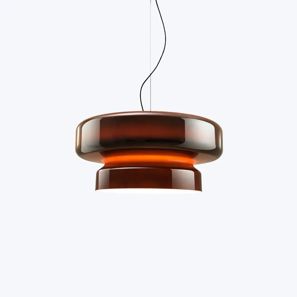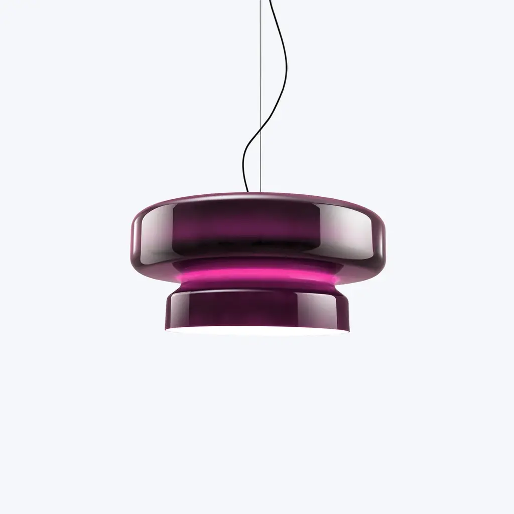 At first glance, the Bohemia Pendant Lamp resembles a blown glass fixture, but its grand scale required a different approach. Crafted from polycarbonate, this striking pendant light offers a dynamic, organic silhouette that seamlessly integrates two volumes into a single form. The translucent shade is available in four rich colors — Green, Violet, Smoke and Amber — with a white interior designed to enhance light reflection, creating a warm yet vibrant glow. The unique material choice allows for an impressive size while maintaining a lightweight structure, making it an ideal statement piece for modern interiors. Designed by Marset, the Bohemia Pendant Lamp embodies a commitment to nuanced lighting and innovative craftsmanship. This elegant fixture not only illuminates but also captivates, transforming any space with unexpected depth and luminous beauty.