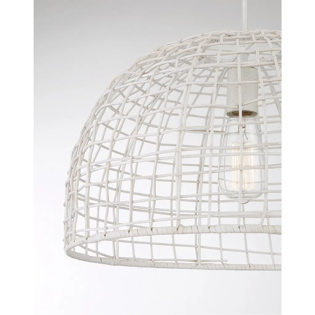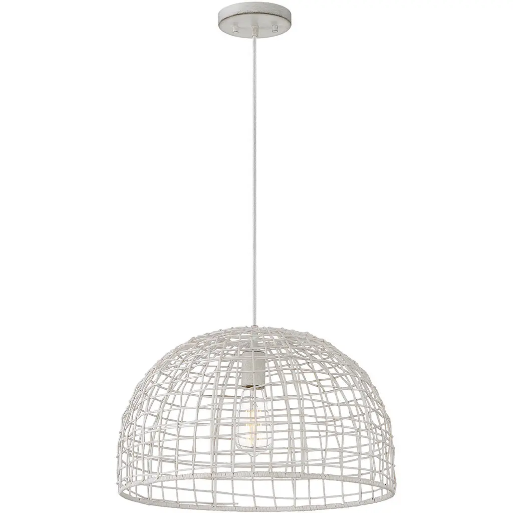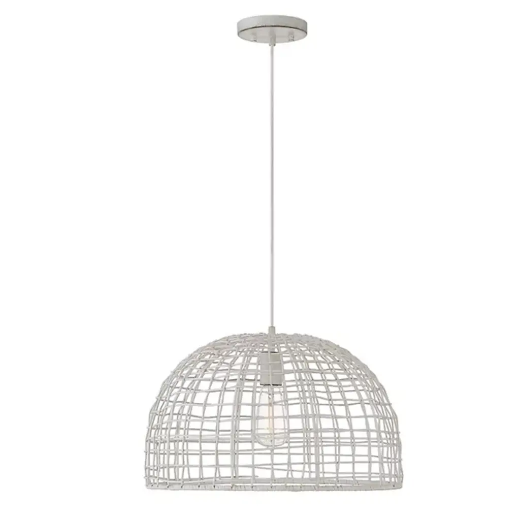 Bring a nature-inspired lighting look to your home with this 1-light pendant from Meridian. It flaunts a dome-shaped shade of white rattan for an intriguing and highly textured look. The light and the white-finished socket shine through this shade, bringing in two-tone appeal. It is great for brightening up rooms with bohemian, farmhouse and rustic decor styles. This pendant is 12" in height and 18" in width, plus it comes with 120" of cord to let you adjust the hanging height. This pendant uses 1 standard size bulb of up to 60 watts, is LED compatible and is dimmable.