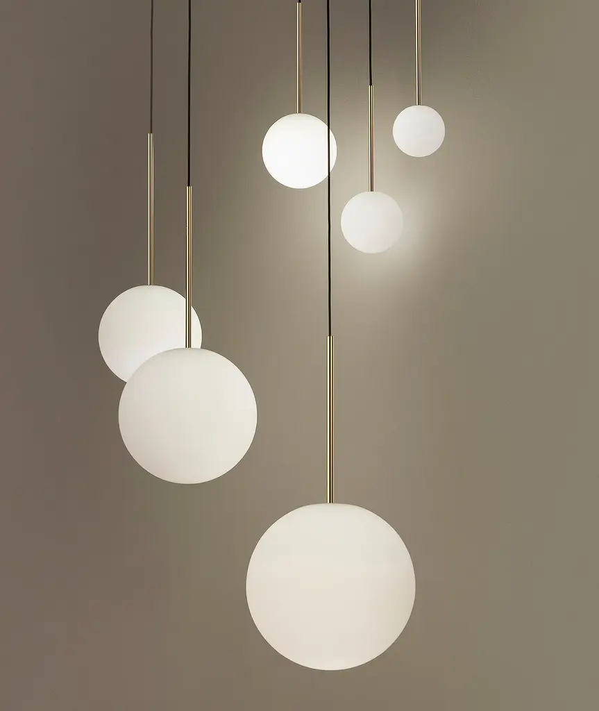 The Bola Sphere pendant is the basic foundation of the Bola Collection, featuring an elemental interplay between post and sphere. Its seductive opal blown glass shade is available 6 distinct sizes, paired with a stainless steel post with mating canopies. Bola Sphere is also available in exquisite Chandelier groupings that allow mixing of globe sizes for stunning displays in any residential, contract or hospitality setting, alike.