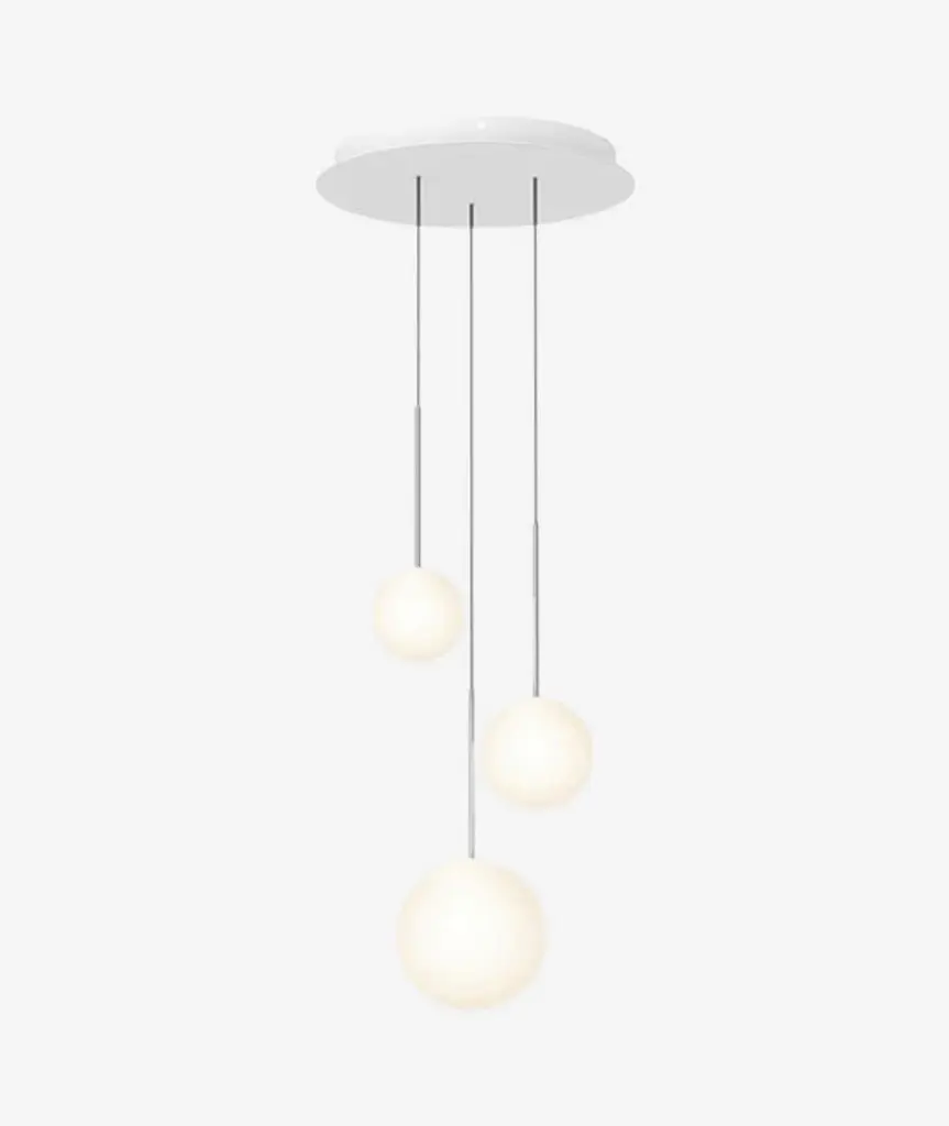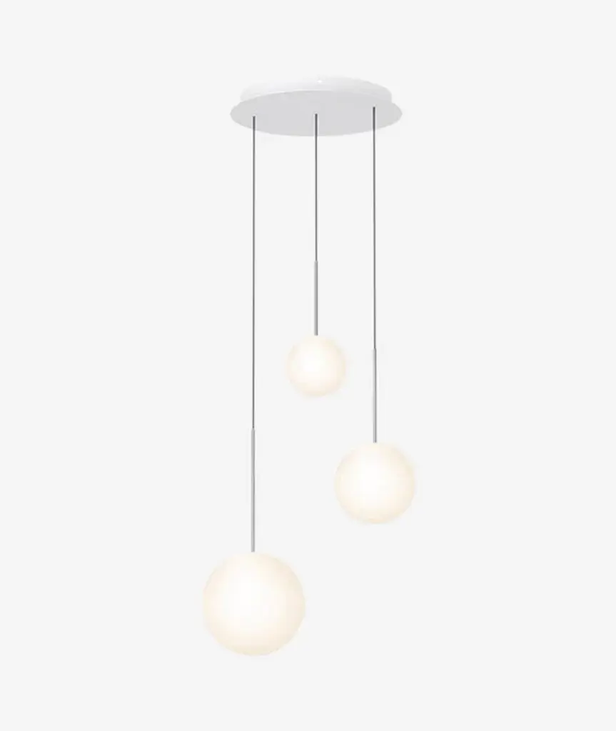The Bola Sphere pendant is the basic foundation of the Bola Collection, featuring an elemental interplay between post and sphere. Its seductive opal blown glass shade is available 6 distinct sizes, paired with a stainless steel post with mating canopies. Bola Sphere is also available in exquisite Chandelier groupings that allow mixing of globe sizes for stunning displays in any residential, contract or hospitality setting, alike.