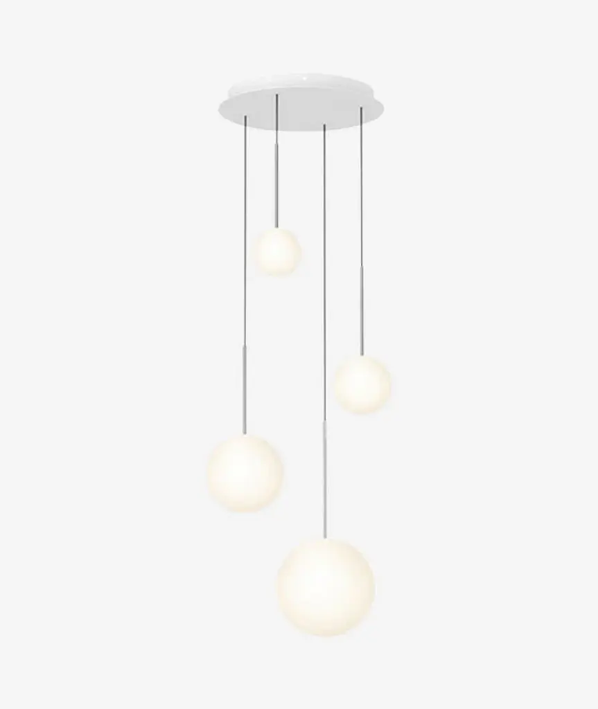 The Bola Sphere pendant is the basic foundation of the Bola Collection, featuring an elemental interplay between post and sphere. Its seductive opal blown glass shade is available 6 distinct sizes, paired with a stainless steel post with mating canopies. Bola Sphere is also available in exquisite Chandelier groupings that allow mixing of globe sizes for stunning displays in any residential, contract or hospitality setting, alike.