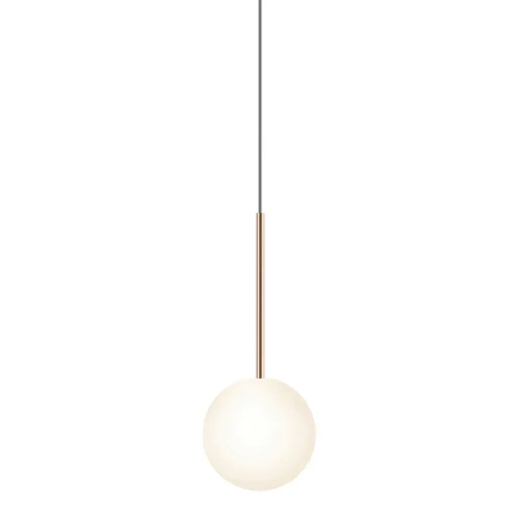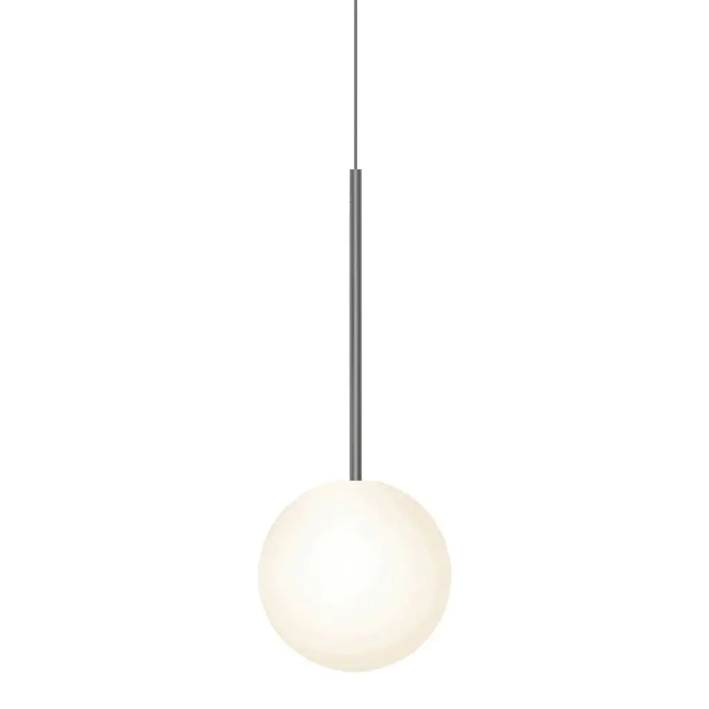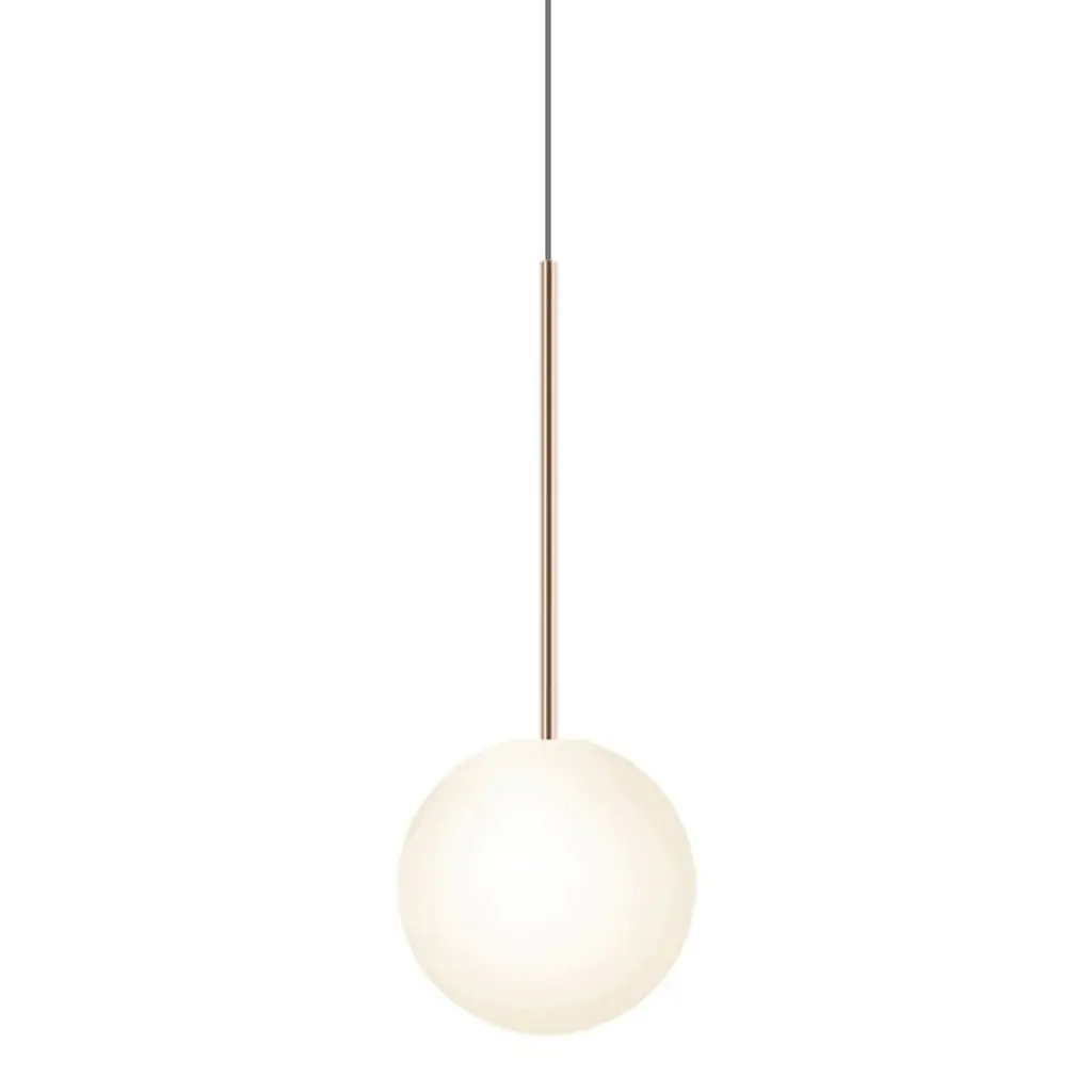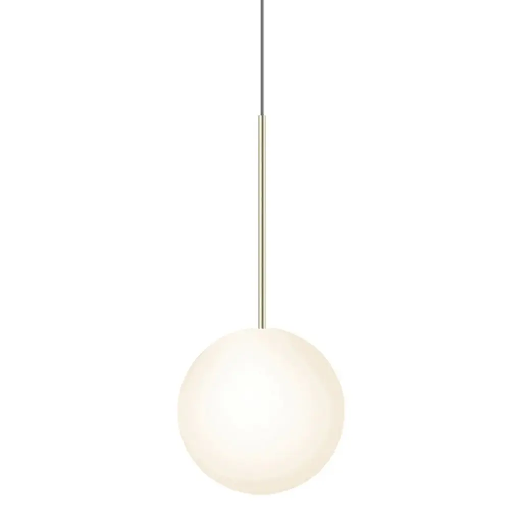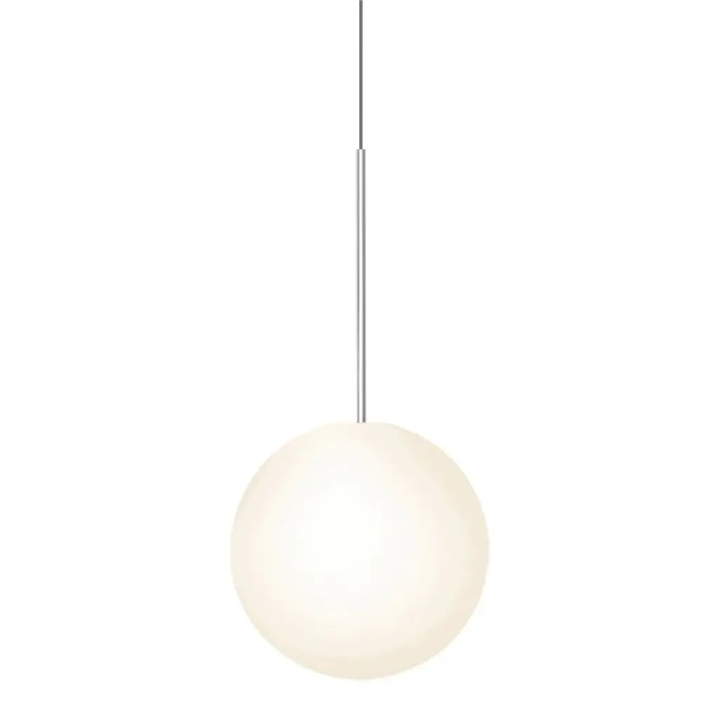 The Bola Sphere pendant is the basic foundation of the Bola Collection, featuring an elemental interplay between post and sphere. Its seductive opal blow glass shade is available in 6 distinct sizes, paired with a chromated stainless steel post in chrome, brass or rose gold finishes with mating canopies.
