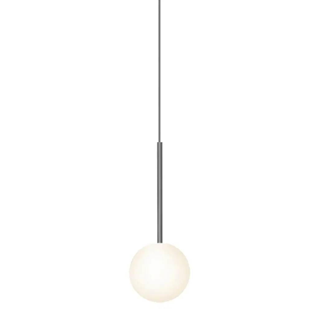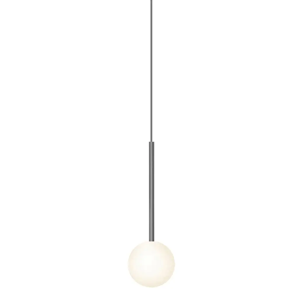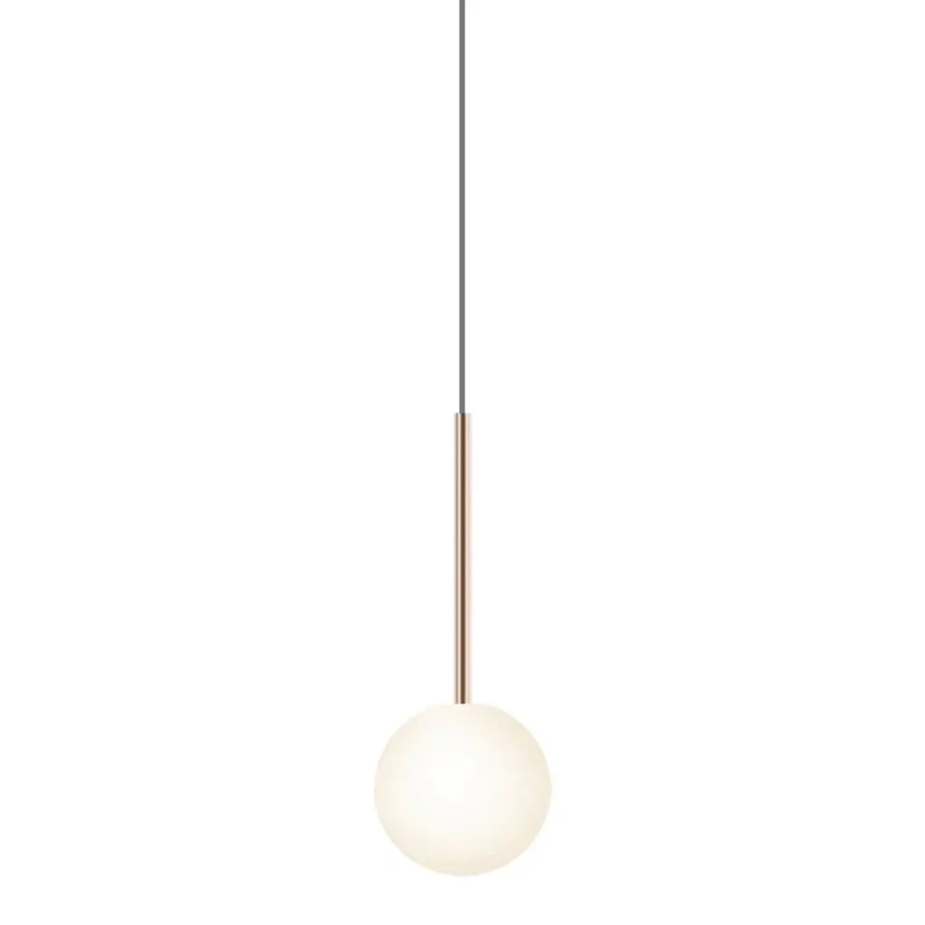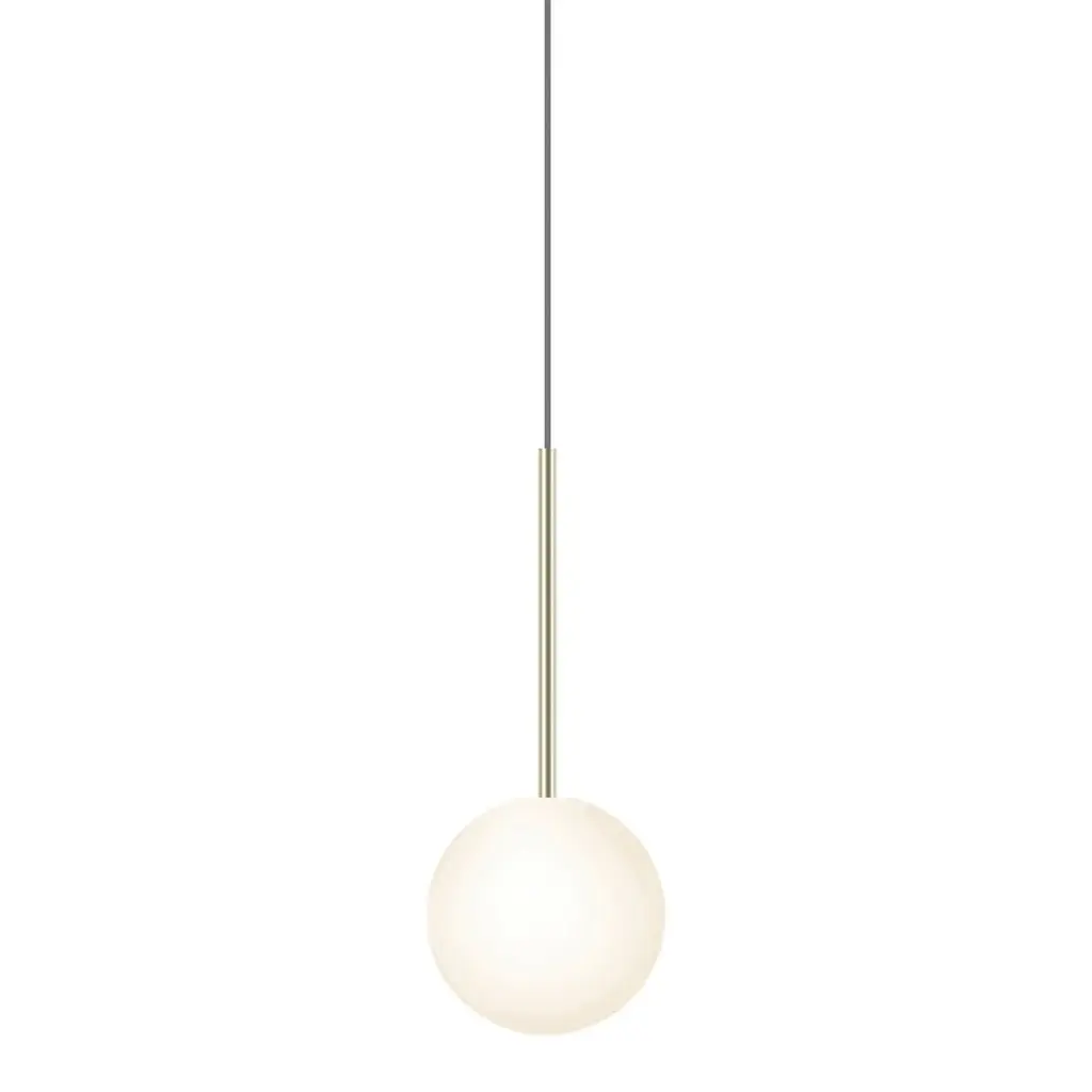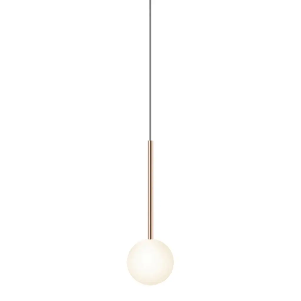 The Bola Sphere pendant is the basic foundation of the Bola Collection, featuring an elemental interplay between post and sphere. Its seductive opal blow glass shade is available in 6 distinct sizes, paired with a chromated stainless steel post in chrome, brass or rose gold finishes with mating canopies.