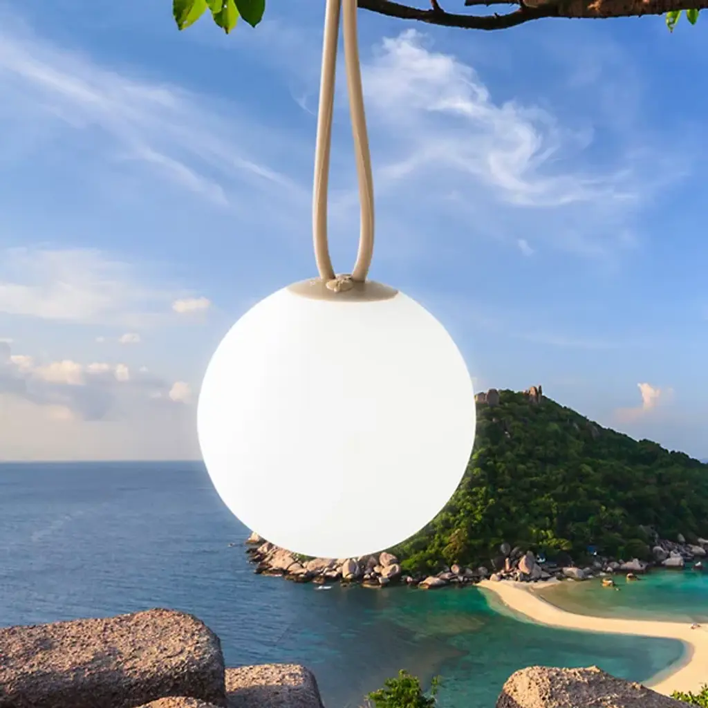 Light up wherever you go with Bolleke Rechargeable Hanging Outdoor LED Pendant cordless, portable and rechargeable light. Carry or tie to whatever object you wish to add light with the attached elastic loop. Has silicon integrated buttons for a simple and clean design look. Bonus points, the round shape mirrors a pearl when lit up.