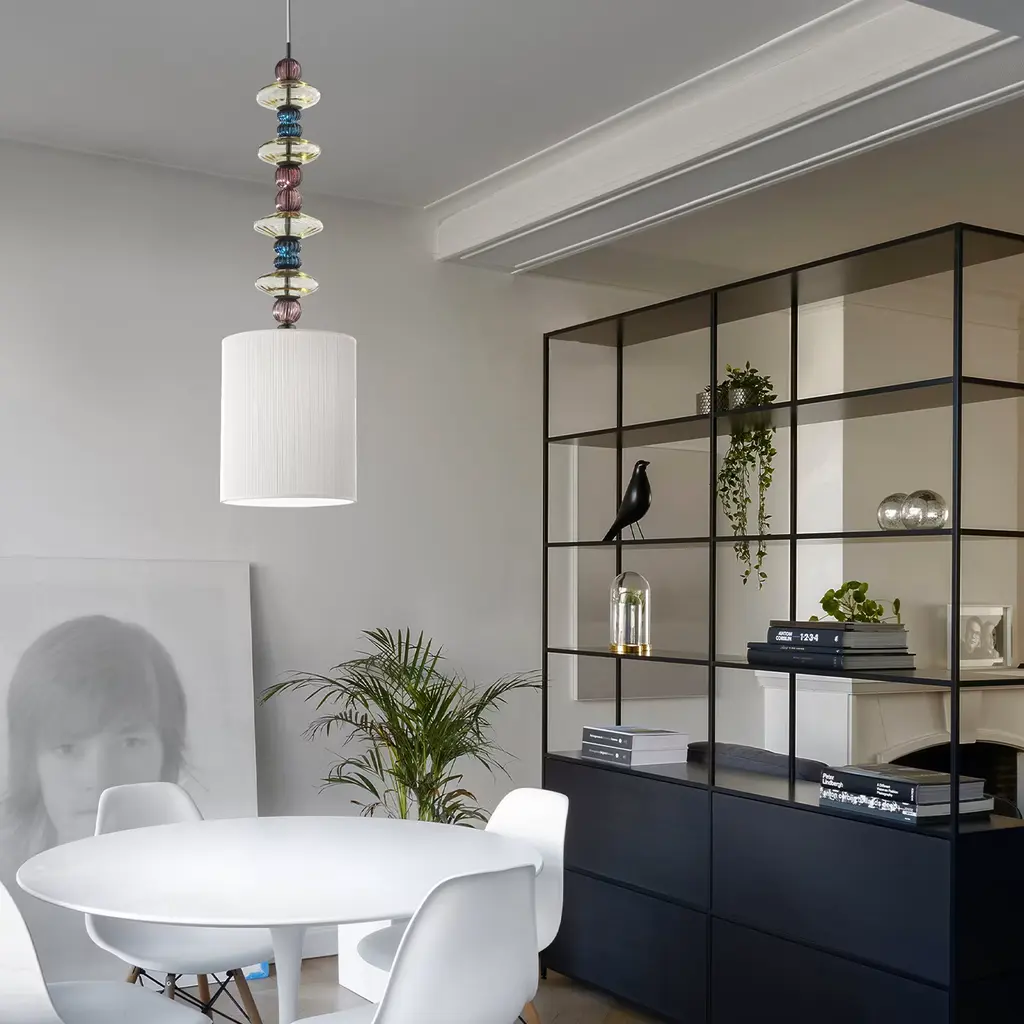 An authentic glass jewel to be suspended over dining tables in refined modern homes, this pendant lamp combines the grace of a cylindrical shade in hand-woven ivory fabric with the opulence of the topaz, amethyst, and denim-toned artistic glass elements piled above it. It fits a single E27 max 70W bulb. Please inquire with the Concierge for more finishing options.