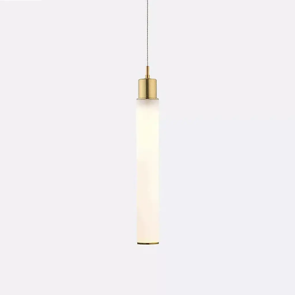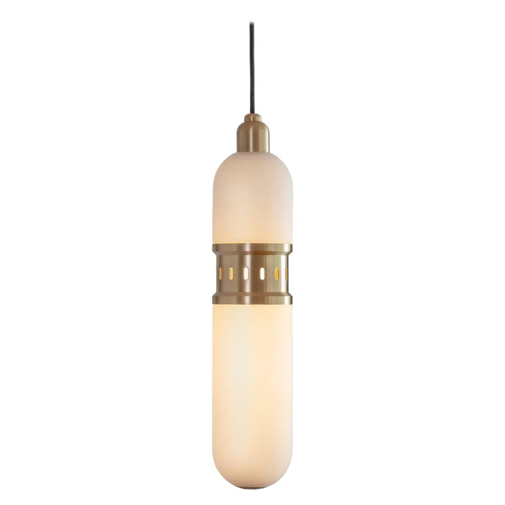 LED pendant featuring illuminated cylinders formed by handcrafted glass set within a silhouette, beautifully lit from within, spanning space vertically or horizontally. Shown in our standard Gold Leaf finish with Bahama Sand opaline white glass capturi