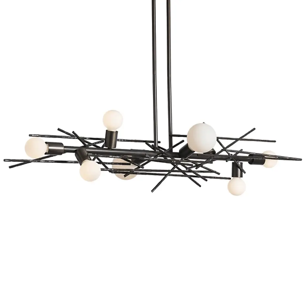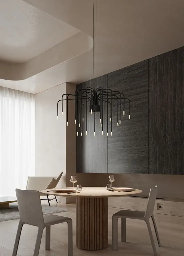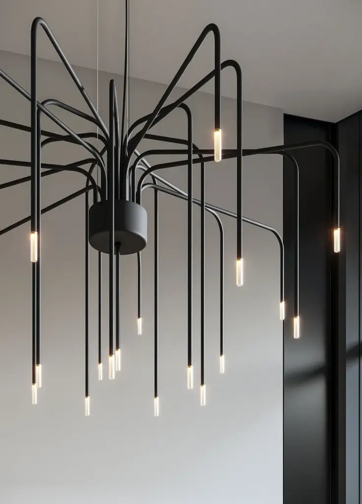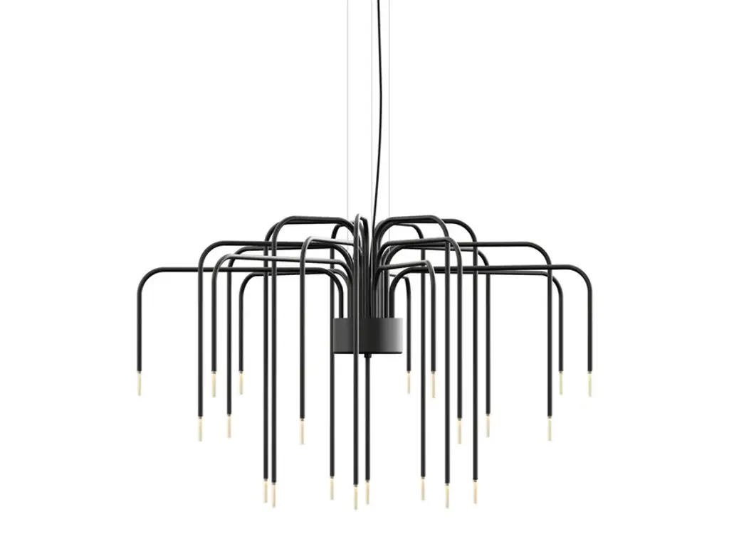 Boom is a pendant lamp with a matte black aluminium structure and white satin-finished Pyrex lampshades.An explosion of style and originality, the Boom suspension lamp reinterprets the concept of a chandelier with a contemporary and dynamic design.Its 22 painted aluminum arms create a structure that is both lightweight and imposing, reminiscent of fireworks as they slowly descend from the sky, tracing luminous trails that gently fade into the air. Each element extends gracefully into space, giving the lamp a suspended and elegant motion, like a luminous dance frozen in time.Boom is a true statement piece, capable of transforming any space into a sophisticated and theatrical setting, thanks to its balance between structural complexity and visual lightness.Specifications:Optional: power supply includedElectrical device: 22 x max 1W, 350mA, 3454lm, 3000KIP Rate: IP20Certification: IEC 60598-1:2020, EN 60598-1:20210-10V dimmable
