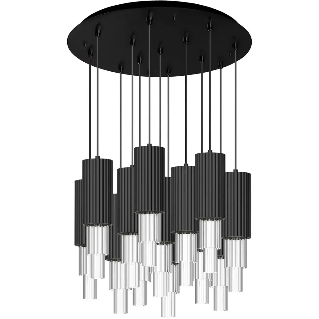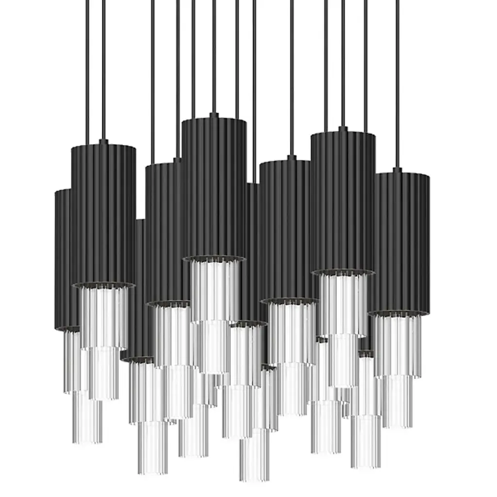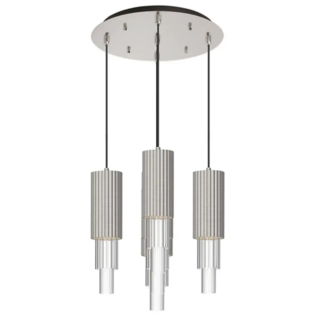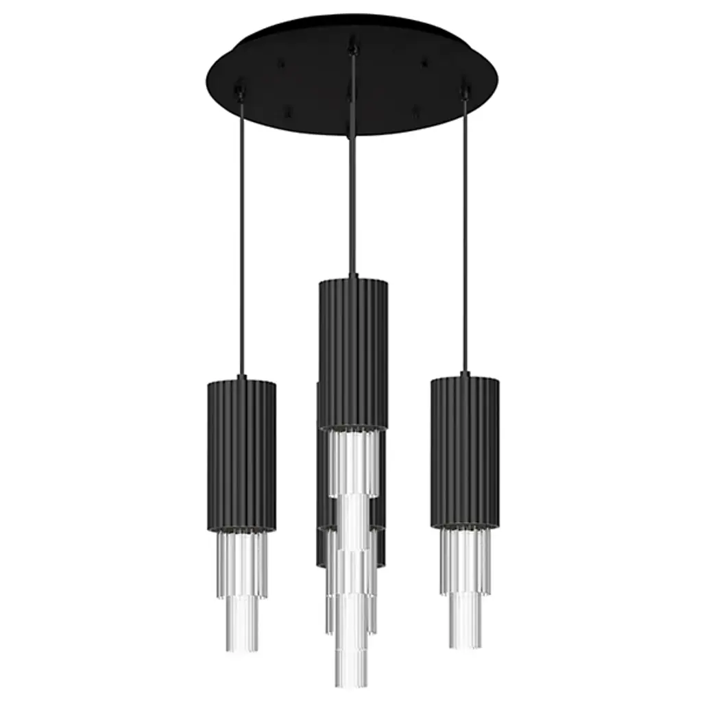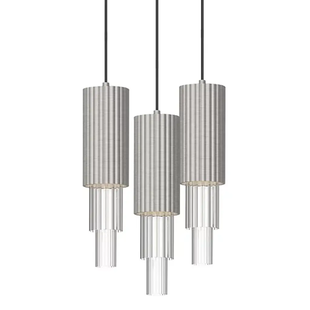 The Bordeaux LED Multi-Light Pendant from Alora Mood draws on the elegance of Art Deco, reinterpreted with a modern sensibility. Designed by Kuzco NYC Studio, this arrangement features layered, clear, ribbed glass shades that float from slender cables, each paired with textured metal accents for added refinement. A durable steel ceiling mount and shade structure construction balances Parisian inspiration with contemporary clarity, bringing lively atmosphere to indoor settings. Integrated LEDs cast a 3000K glow through the layered glass, highlighting the ridged details while providing efficient ambiance.
