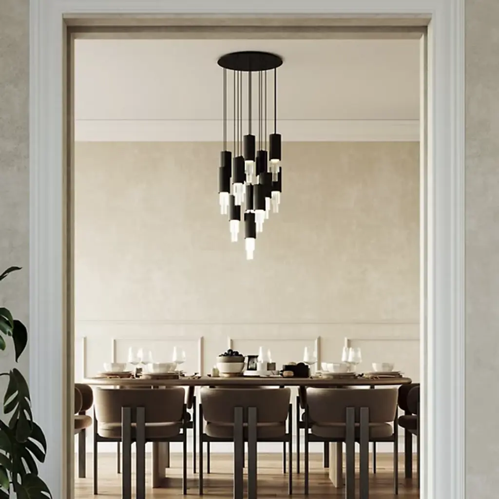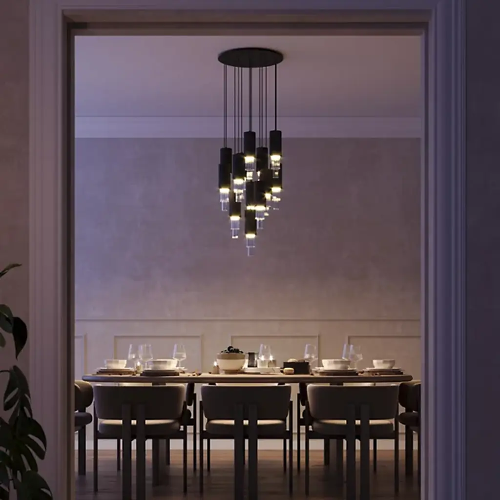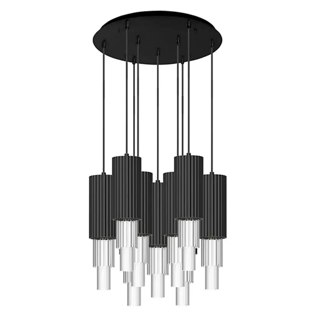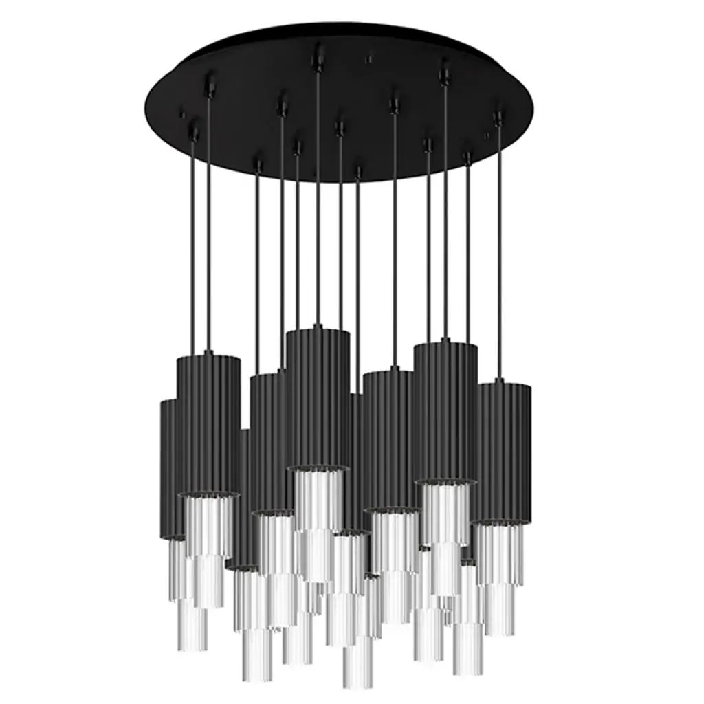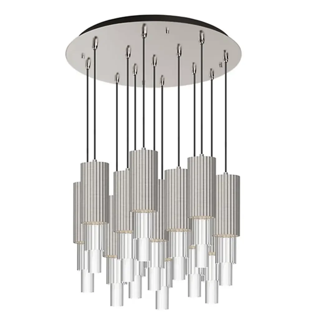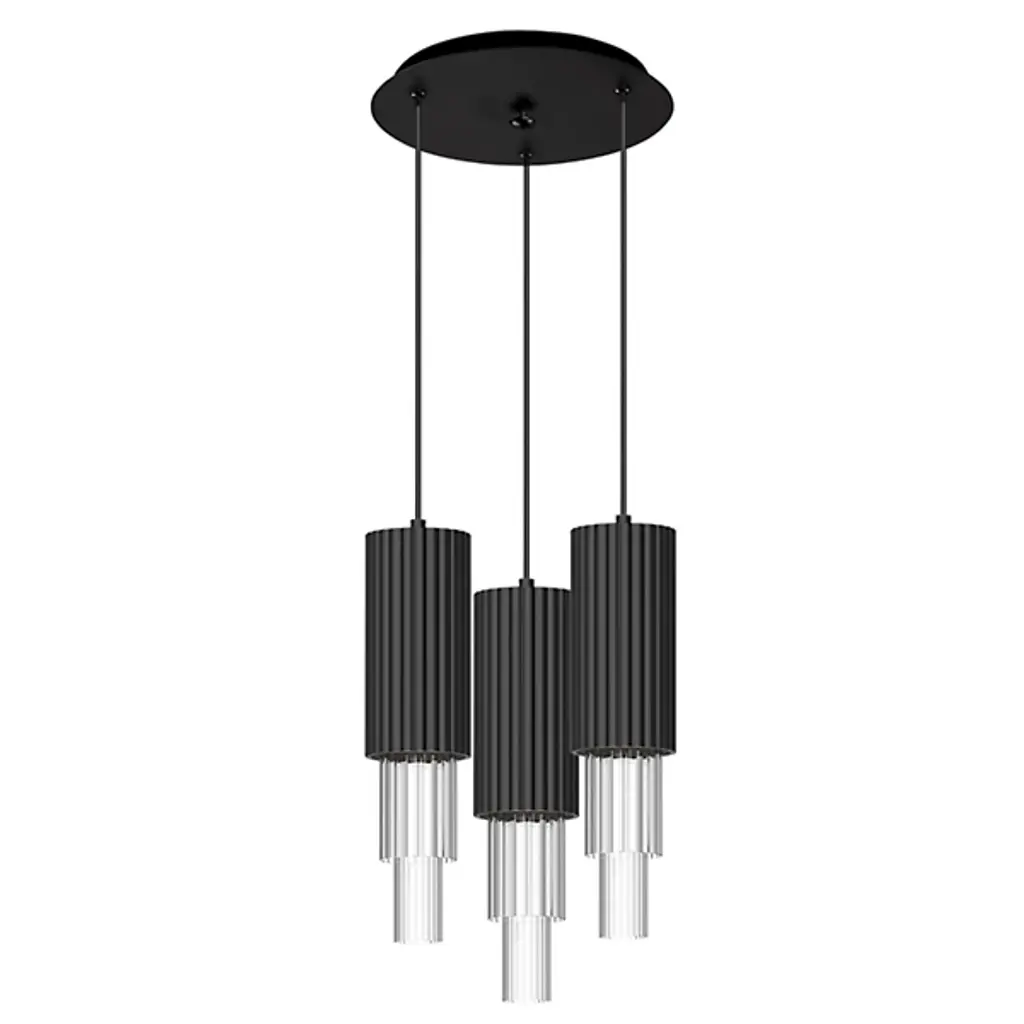 The Bordeaux LED Multi-Light Pendant from Alora Mood draws on the elegance of Art Deco, reinterpreted with a modern sensibility. Designed by Kuzco NYC Studio, this arrangement features layered, clear, ribbed glass shades that float from slender cables, each paired with textured metal accents for added refinement. A durable steel ceiling mount and shade structure construction balances Parisian inspiration with contemporary clarity, bringing lively atmosphere to indoor settings. Integrated LEDs cast a 3000K glow through the layered glass, highlighting the ridged details while providing efficient ambiance.
