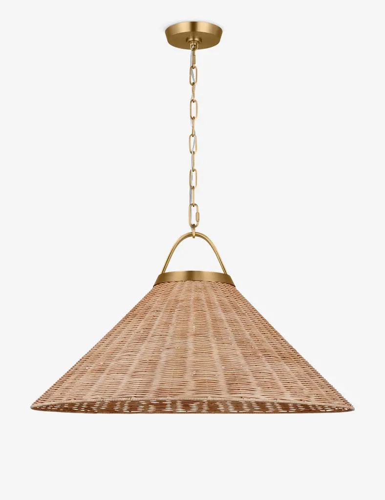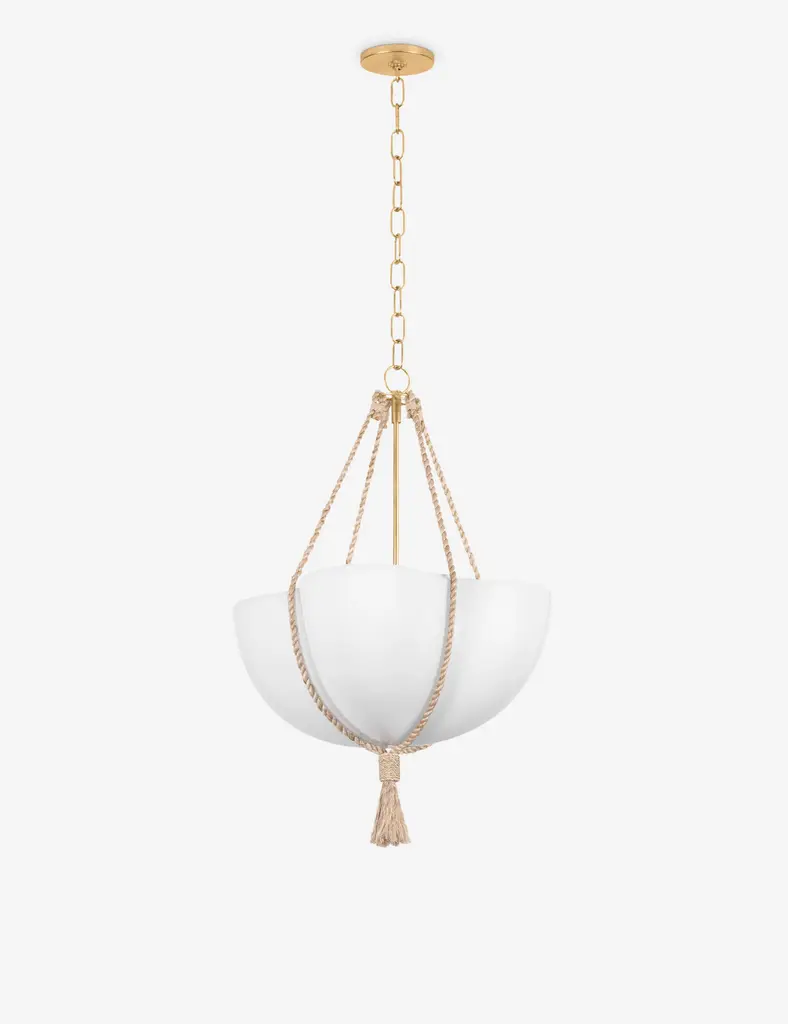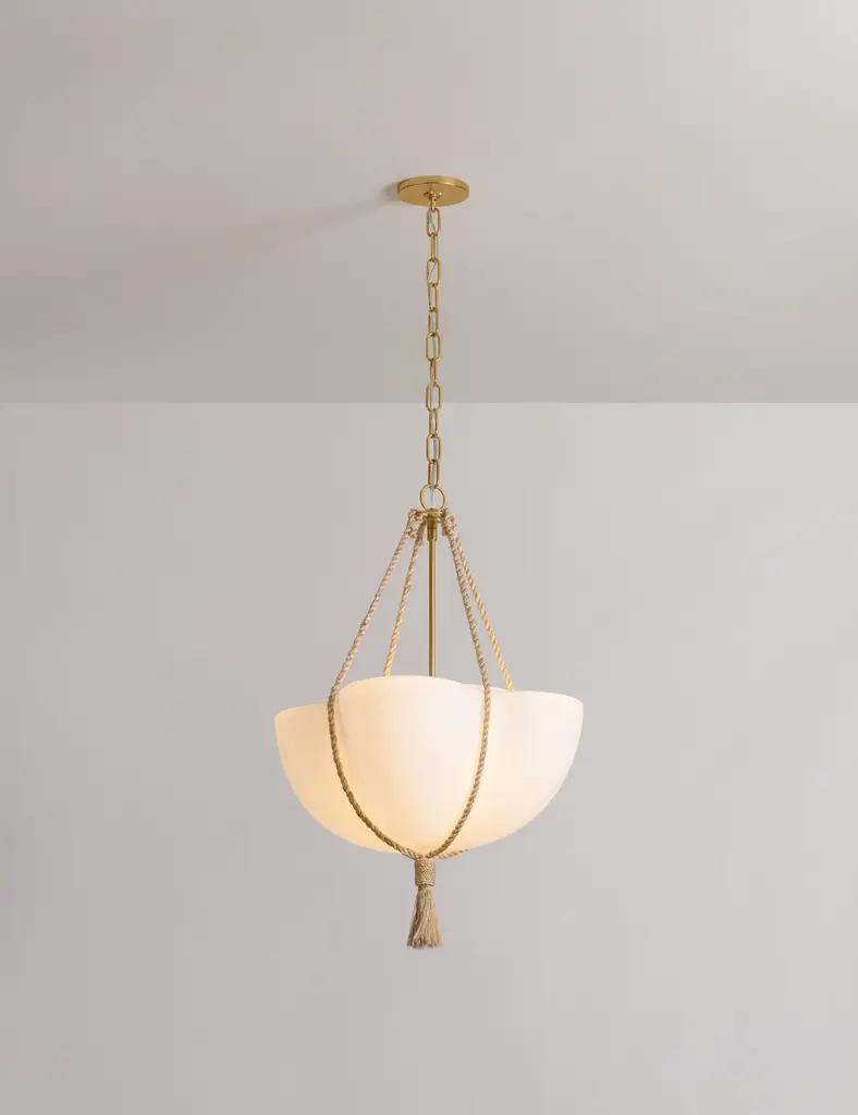 With its chic sling design, the Bosaro pendant offers effortless elegance overhead. The matte glass shade is shaped by four large scallops and suspended with a braided rope that ends in a thick tassel. This pendant light brings rich texture and warm detail to dining rooms, reading corners, or intimate lounges.