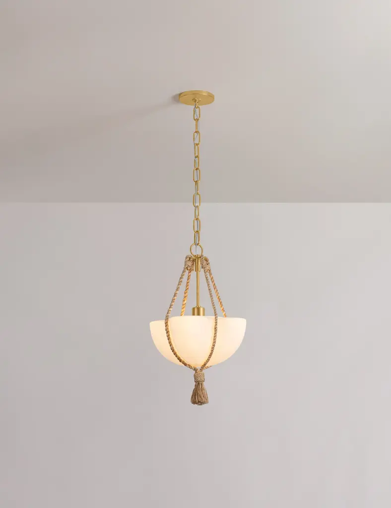 With its chic sling design, the Bosaro pendant offers effortless elegance overhead. The matte glass shade is shaped by four large scallops and suspended with a braided rope that ends in a thick tassel. This pendant light brings rich texture and warm detail to dining rooms, reading corners, or intimate lounges.
