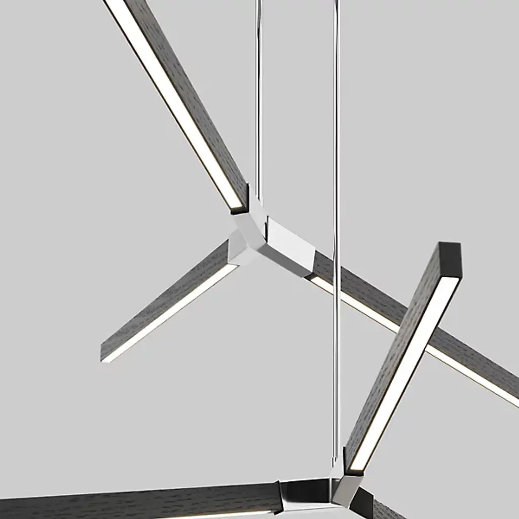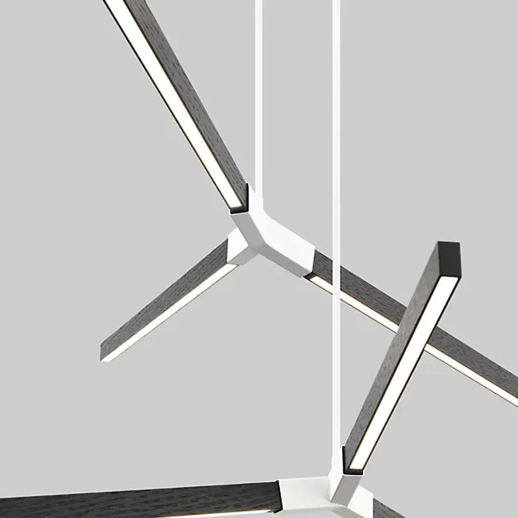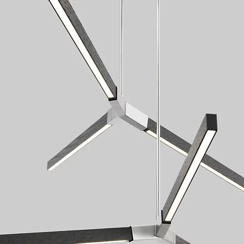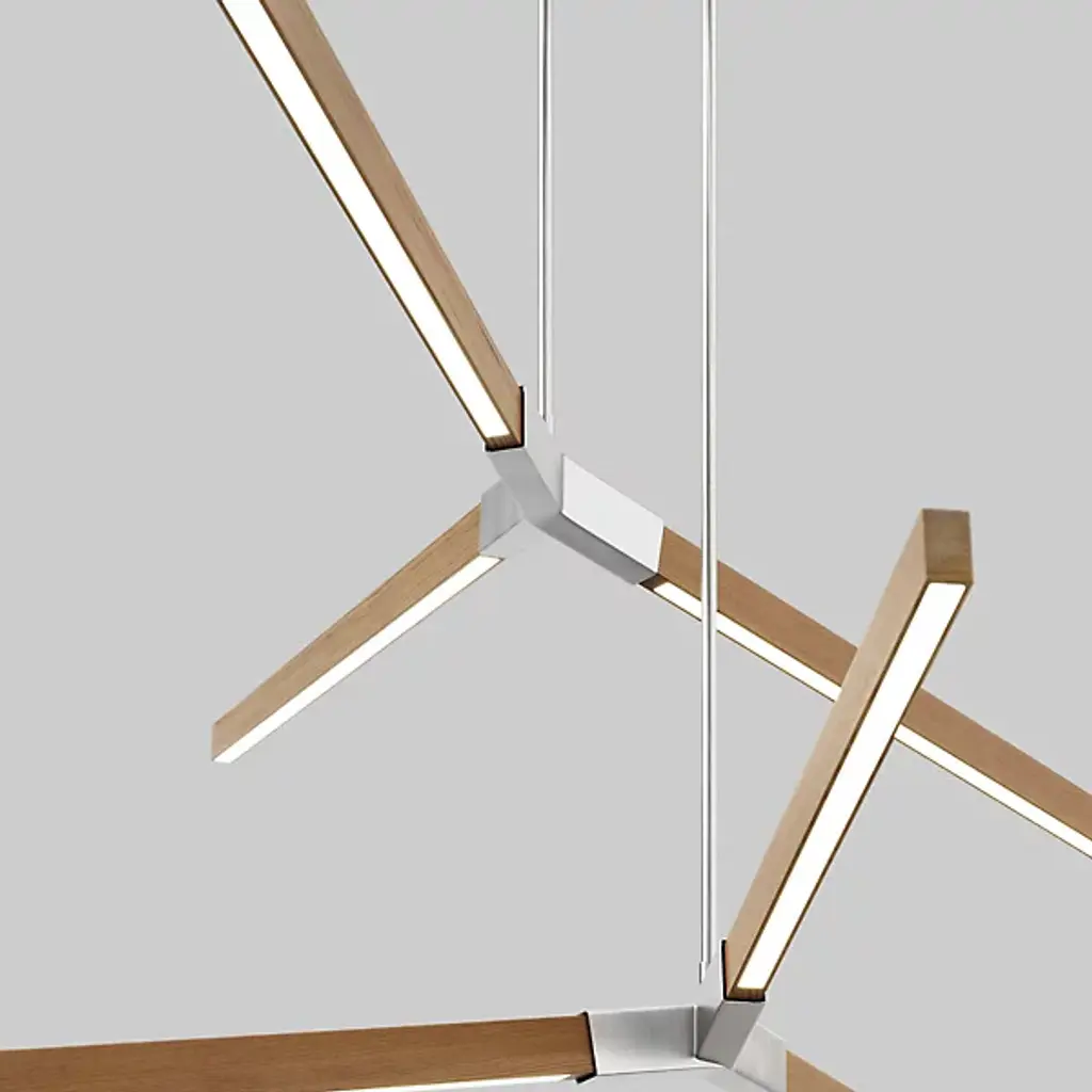 The Bough LED Multi Pendant Light from Stickbulb presents expressive appeal and architectural intricacy to its surroundings. A tasteful example of the love of architecture, modular design, and sustainable practices that spring from the heart of Stickbulb, three slim stems descend from a single canopy, each stem ending at different heights in three blocky metal collars that transmit wood housings for integrated LEDs at arresting angles. The lamping is at once expressive and energy efficient, while the wood grain of each light housing contrasts well with the robust metal at its center.