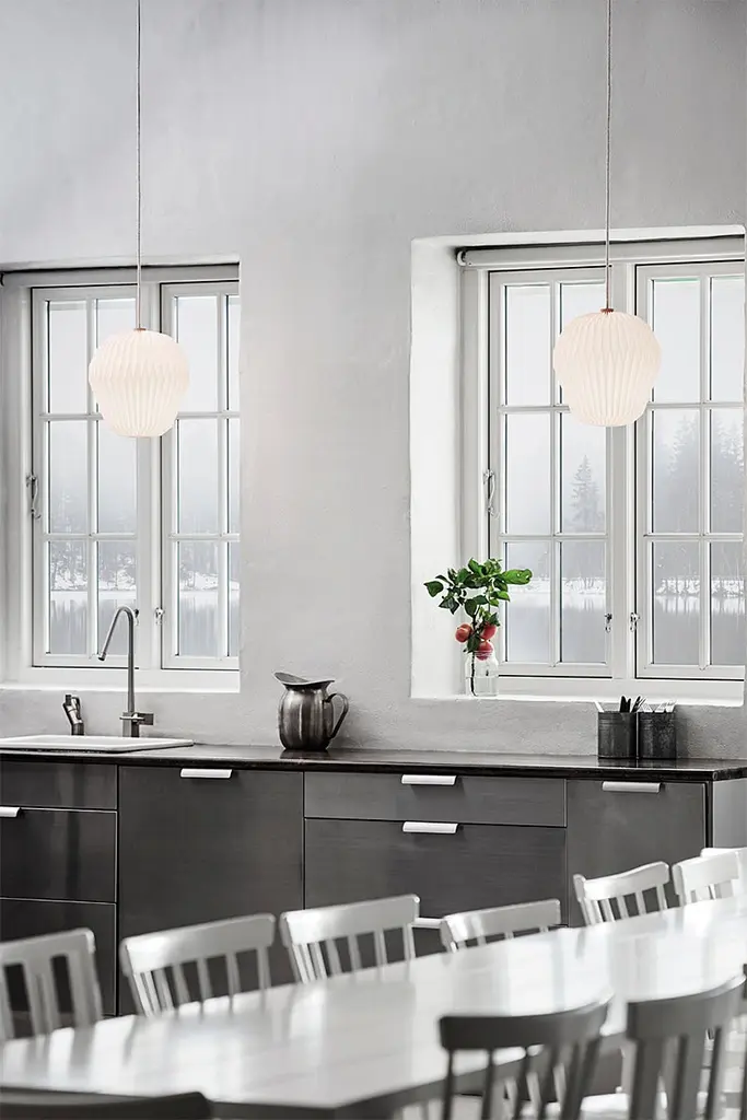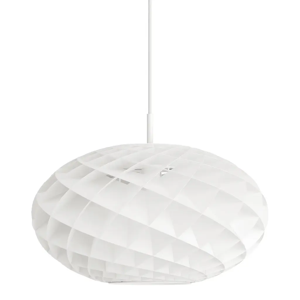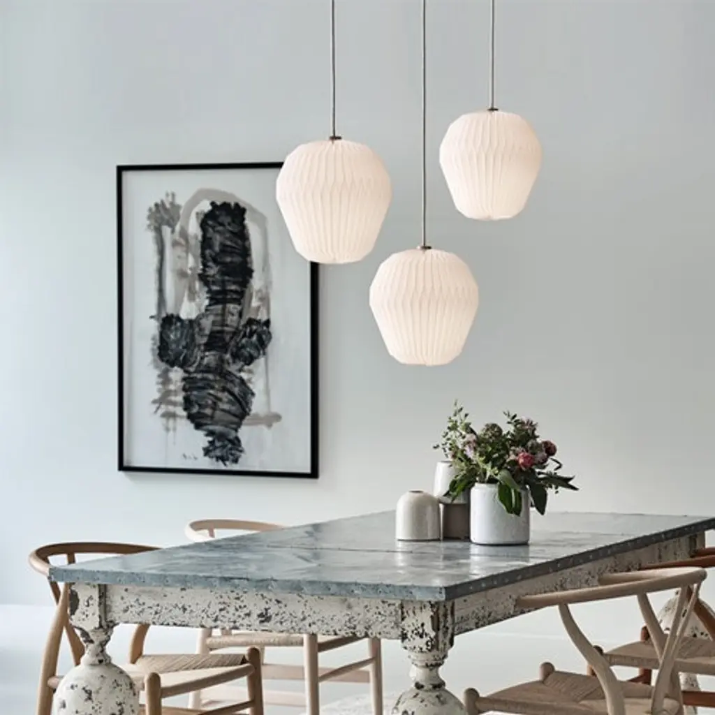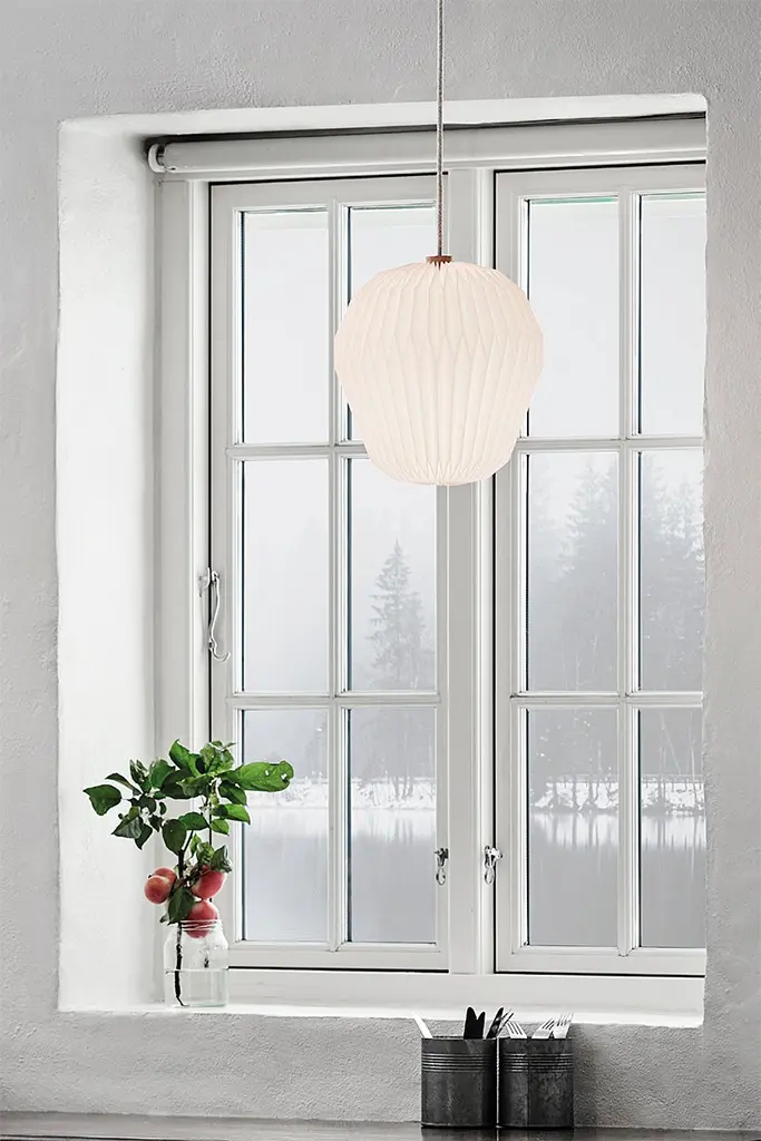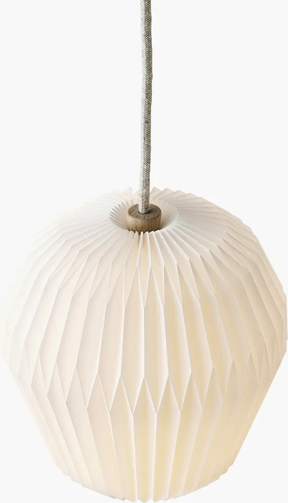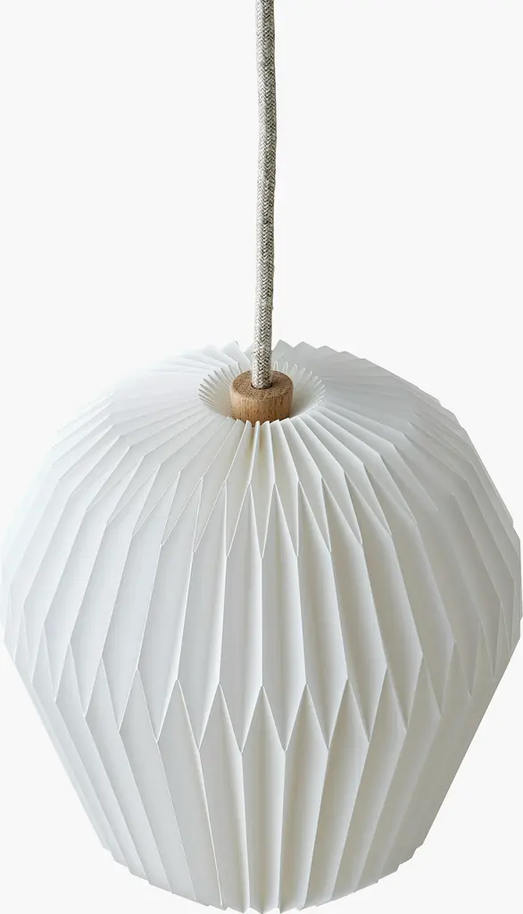 The Bouquet Pendant (2019) captures designer Sinja Svarrer Damkjær's moment of inspiration - watching Italian flower vendors bundle tulips at a market. Suspended from a braided linen cord, the precisely folded paper shade mimics the flower's soft curves and is brilliant on or off with its exquisite craftsmanship and oak detailing. Like the natural forms that inspired it, Bouquet embodies delicate structure and organic grace. Bulb (not included): E27. Made in Denmark.