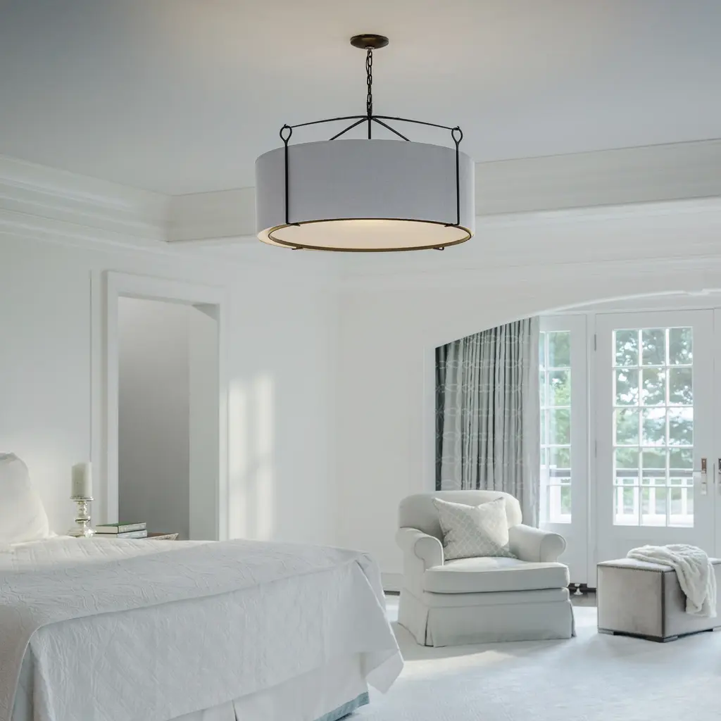 Traditional loop and hook forms meld with modern-day craftsmanship to create the timeless design of the Bow Pendant. Handmade by Hubbardton Forge's skilled artisans, the Bow Large Pendant features soft delicate lines that perfectly juxtapose the sturdy metal fashioning them. A drum-style fabric shade nestled within the metal form completes the softened appearance with a slightly curved glass diffuser housed underneath. Experience the simple style and versatility that a Bow Pendant can bring to your own living area.Hubbardton Forge lighting is handcrafted in Vermont, USA by highly skilled artisans. Every lamp is made-to-order and handmade using environmentally friendly metal forging techniques. Powder coatings and aqueous metal cleaning are used in the production of every lamp.Shown in Dark Smoke finish with Flax shade