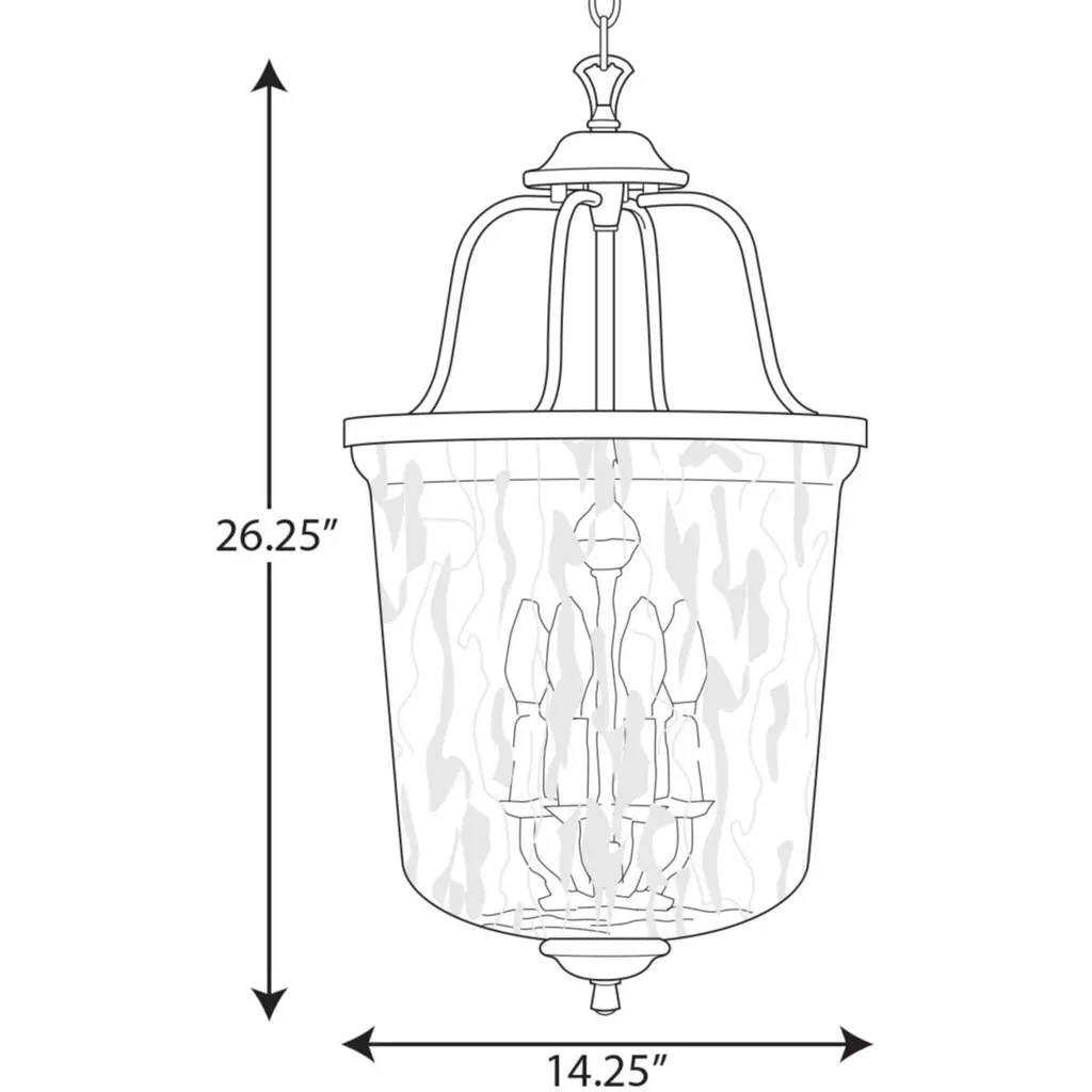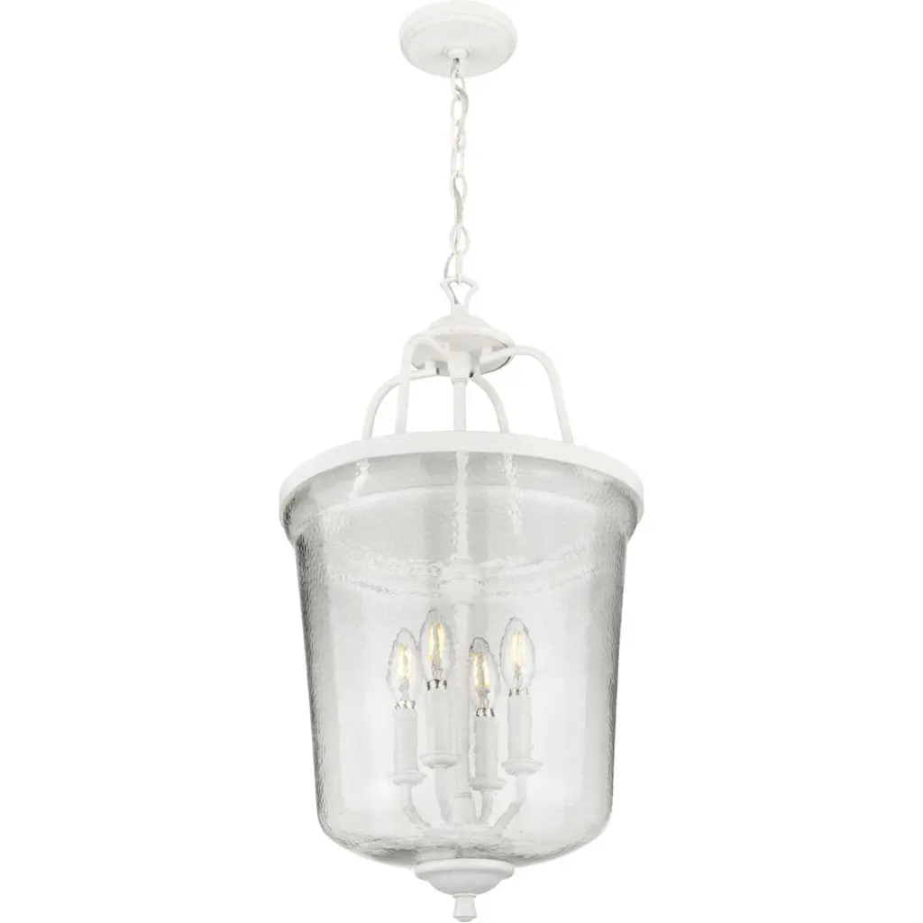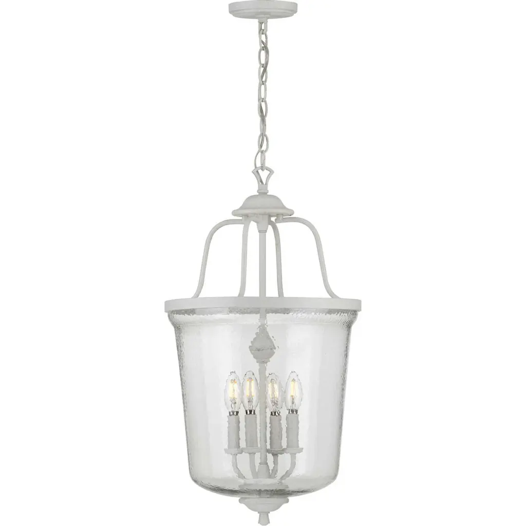 Beautiful lighting will appeal to both your classic taste and your artistic spirit with the Bowman Collection Four-Light Cottage White Foyer Pendant. Wandering eyes will focus on the clear, chiseled glass shade that encircles four elegant light sources gathering quietly at the light fixture's center. Handsome, cottage white light bases with sophisticated curved arms originate from a decorative white knob that embellishes the outer bottom of the textured glass shade.