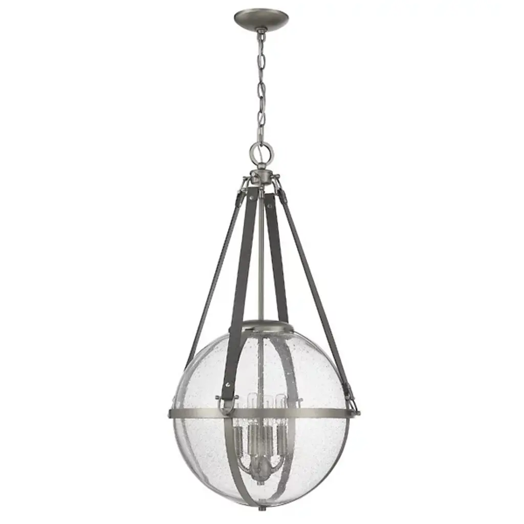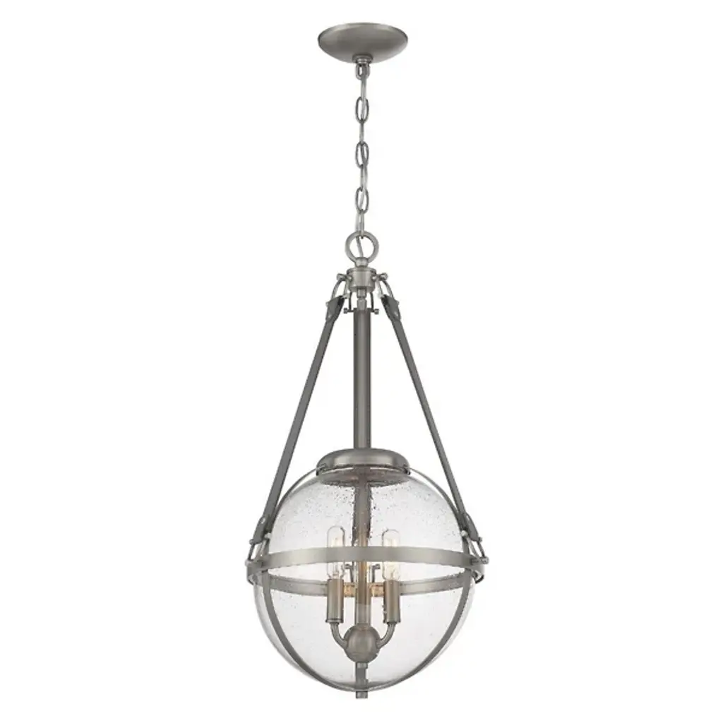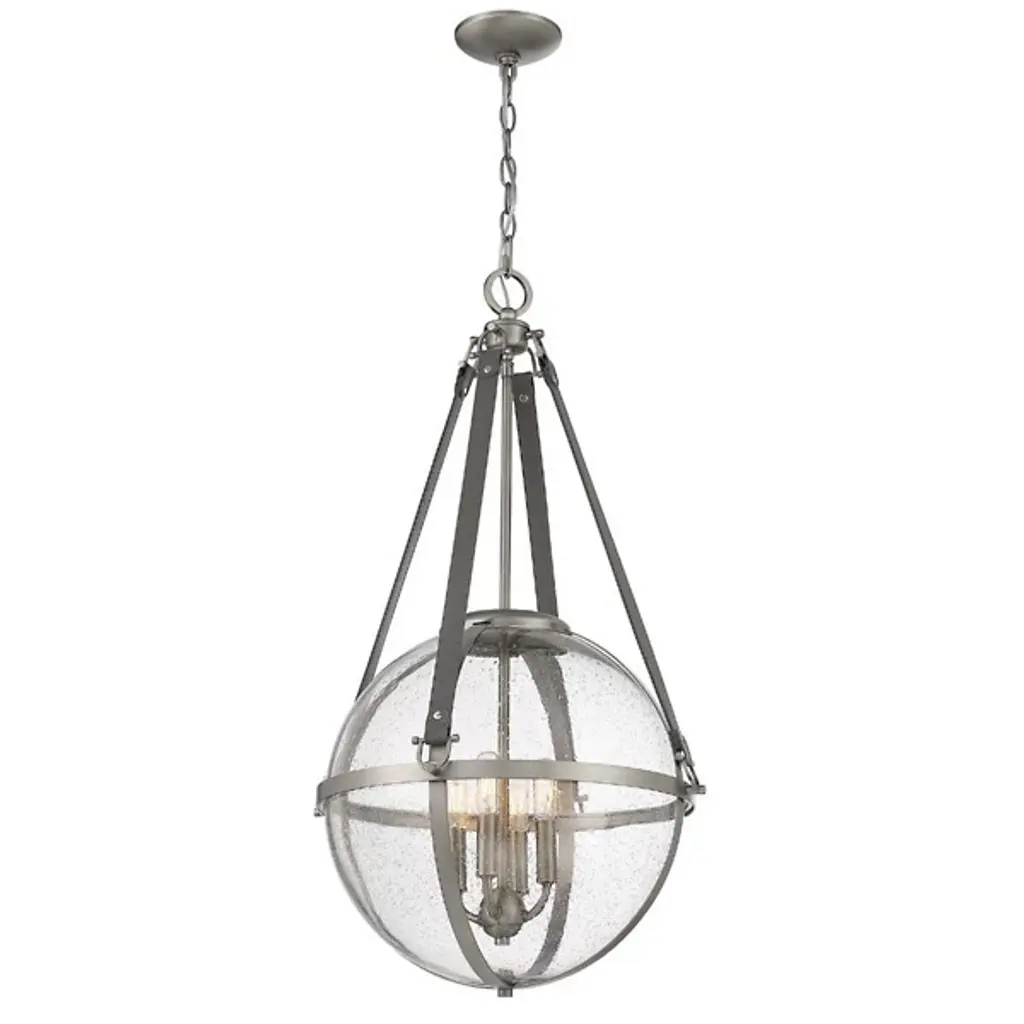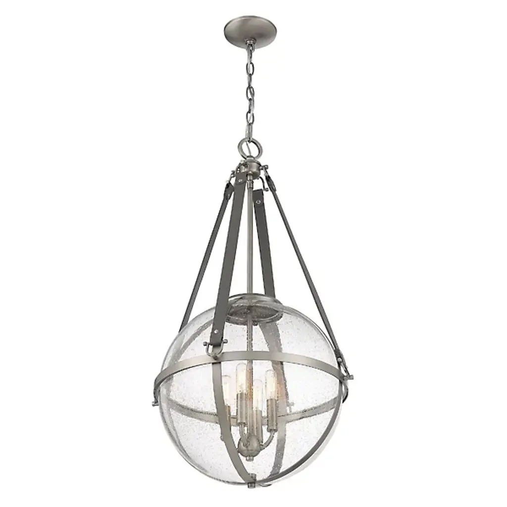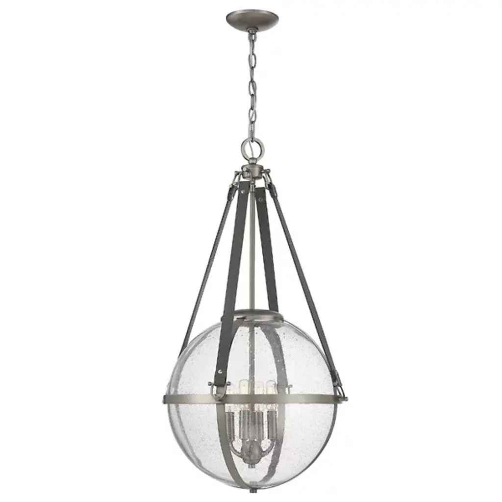 Furnish your room with inventive style when you take home the Bozeman Pendant by Savoy House. A large Seeded Glass Globe is the resting place of an elegant candelabra. Extending from this furnishment is a collection of lightbulbs bolstered by cylindrical casings. Luminous light projects throughout the amply-sized globe and into your environment. The pendant and its components are held in place by a ceiling canopy secured to a downrod which boasts reliable straps on either side.