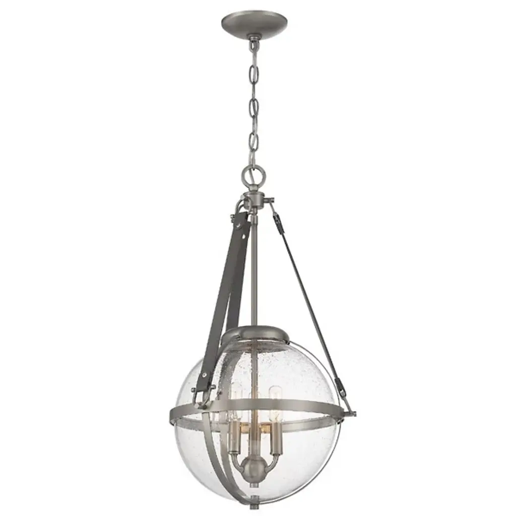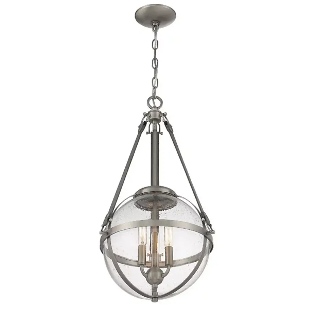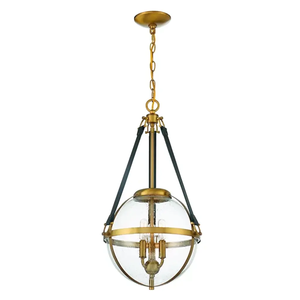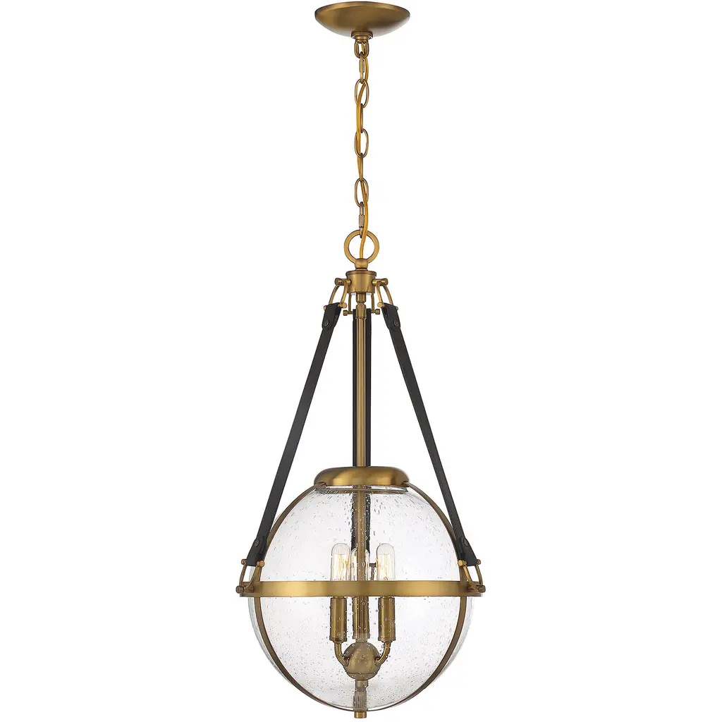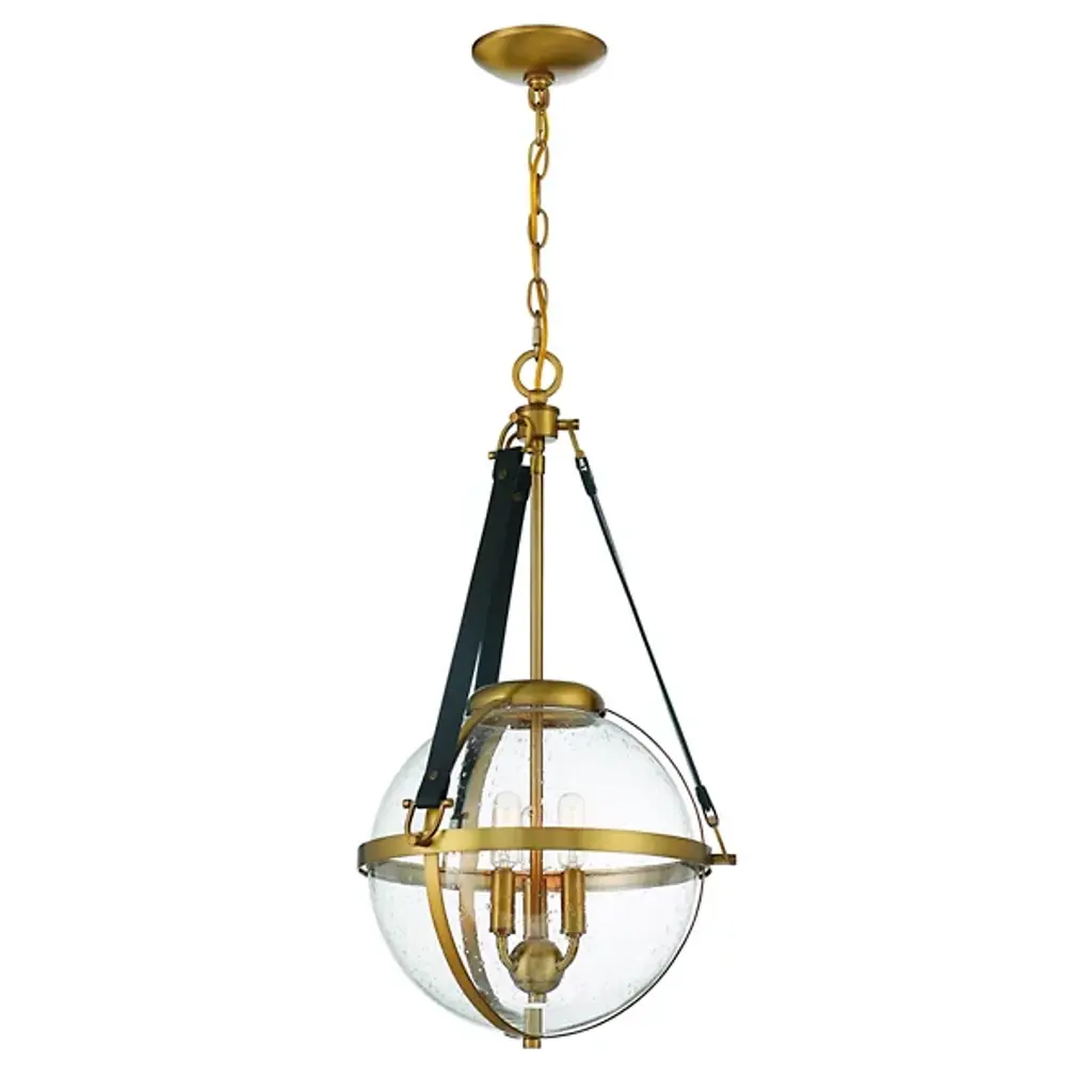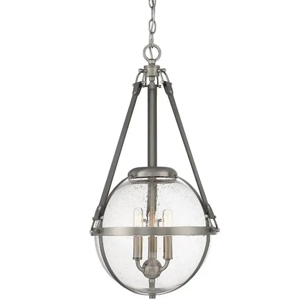Furnish your room with inventive style when you take home the Bozeman Pendant by Savoy House. A large Seeded Glass Globe is the resting place of an elegant candelabra. Extending from this furnishment is a collection of lightbulbs bolstered by cylindrical casings. Luminous light projects throughout the amply-sized globe and into your environment. The pendant and its components are held in place by a ceiling canopy secured to a downrod which boasts reliable straps on either side.