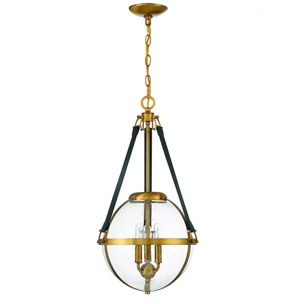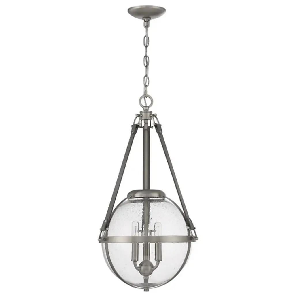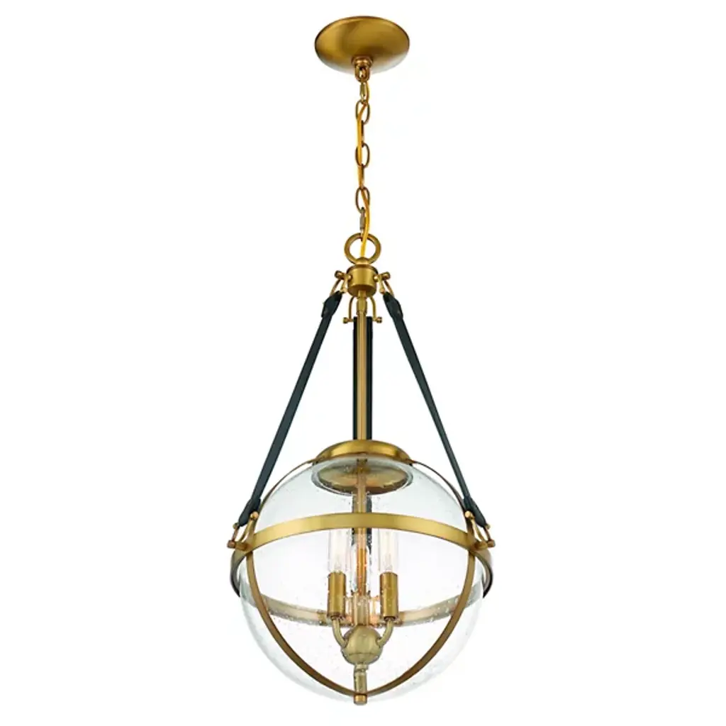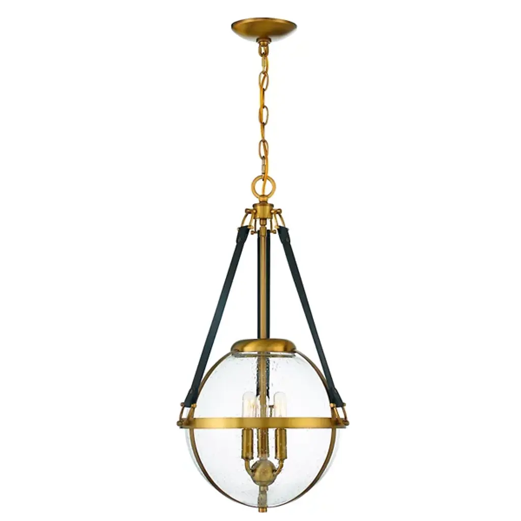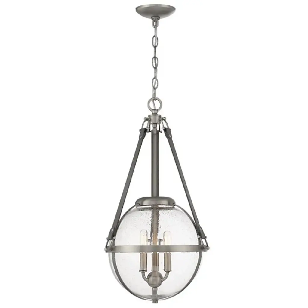 Furnish your room with inventive style when you take home the Bozeman Pendant by Savoy House. A large Seeded Glass Globe is the resting place of an elegant candelabra. Extending from this furnishment is a collection of lightbulbs bolstered by cylindrical casings. Luminous light projects throughout the amply-sized globe and into your environment. The pendant and its components are held in place by a ceiling canopy secured to a downrod which boasts reliable straps on either side.