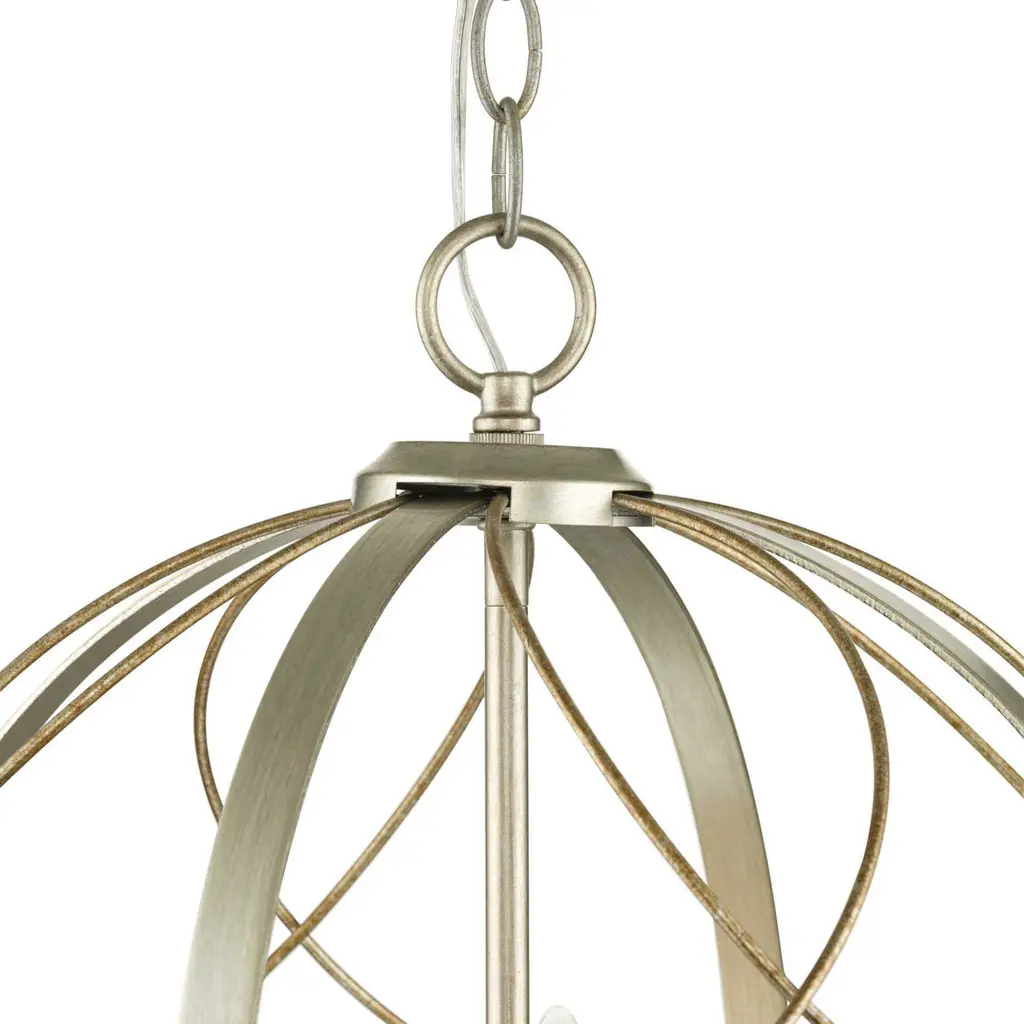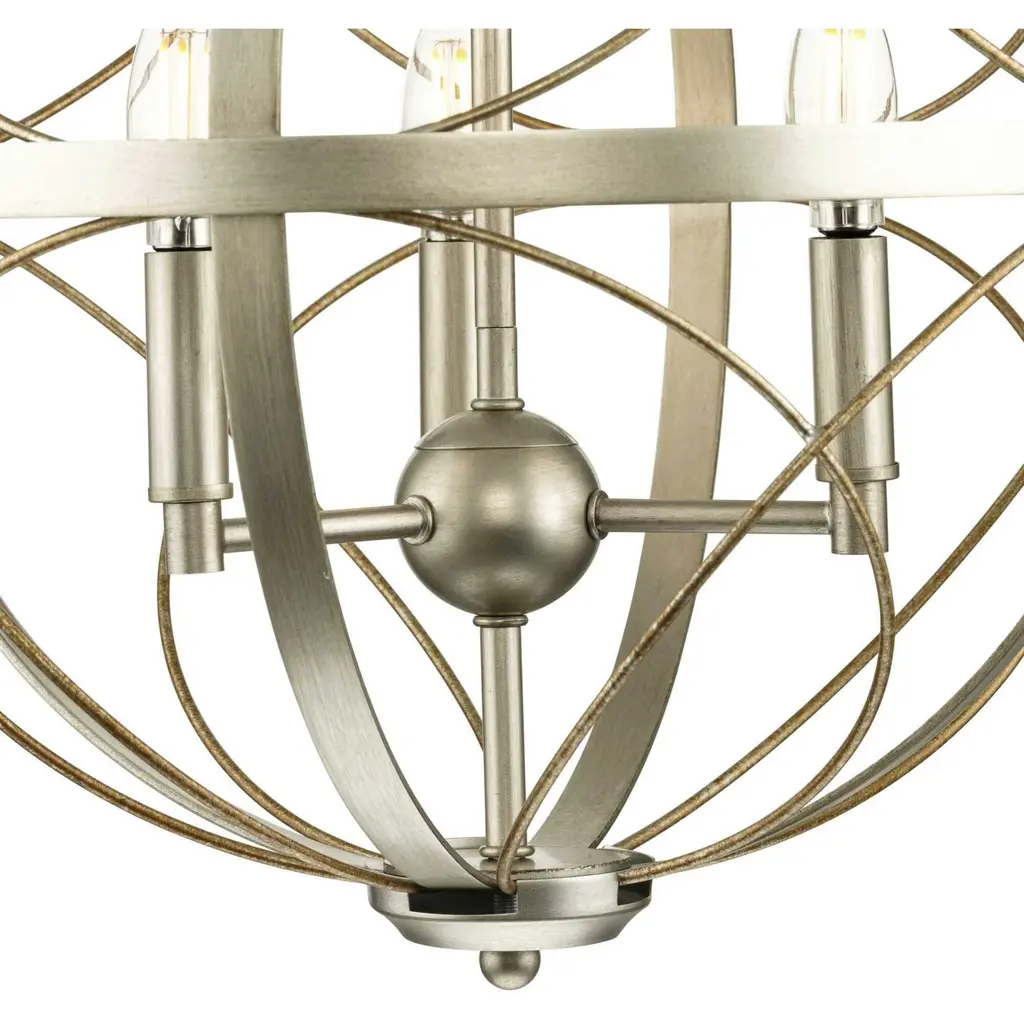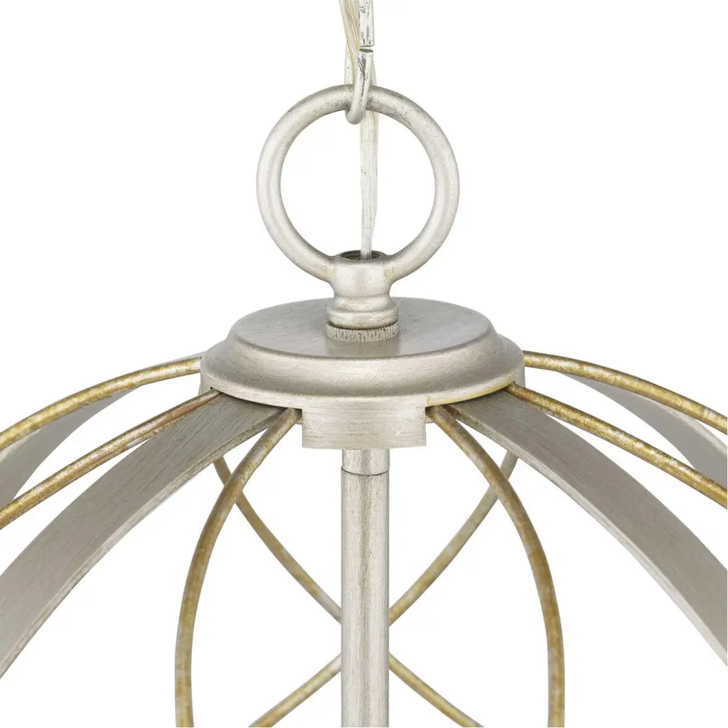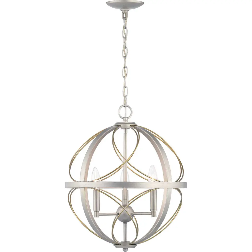An airy artful pendant, Brandywine’s silhouette features an interlocking sphere with decorative details. The elegant frame highlights a juxtaposition of bold accents and delicate, hand gilded wire accents, finished in a Silver Ridge finish. Capturing a timeless look, this three-light pendant is idea for Farmhouse or Transitional interior settings.
