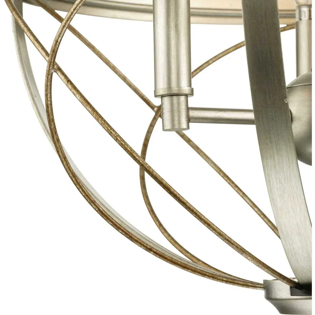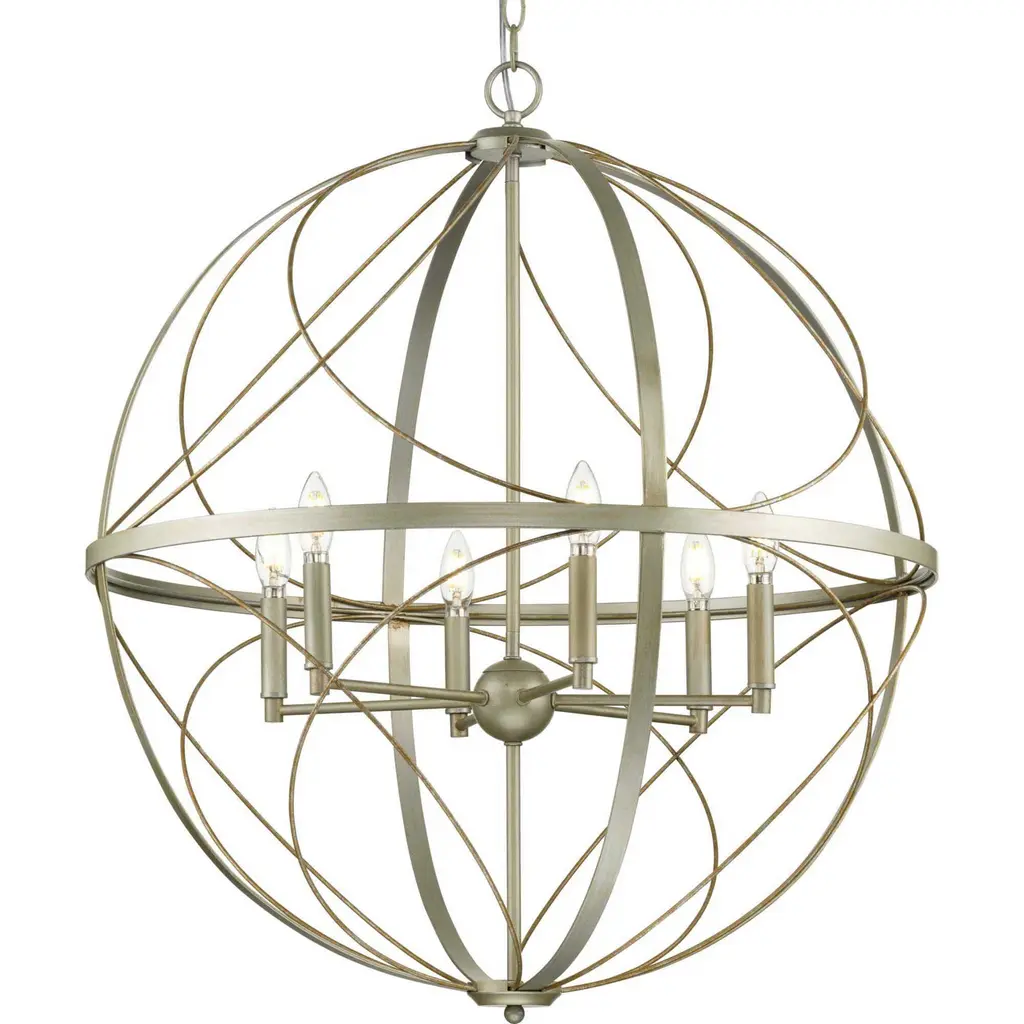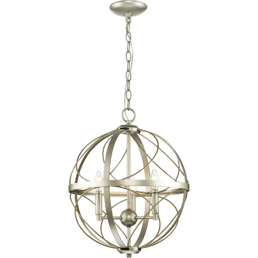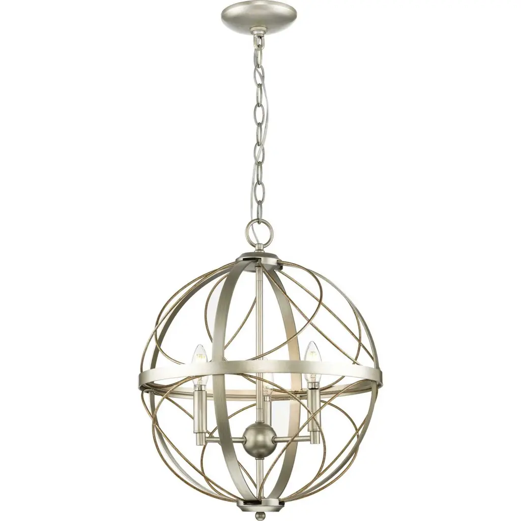 An airy artful pendant, Brandywine’s silhouette features an interlocking sphere with decorative details. The elegant frame highlights a juxtaposition of bold accents and delicate, hand gilded wire accents, finished in a Silver Ridge finish. Capturing a timeless look, this three-light pendant is idea for Farmhouse or Transitional interior settings.