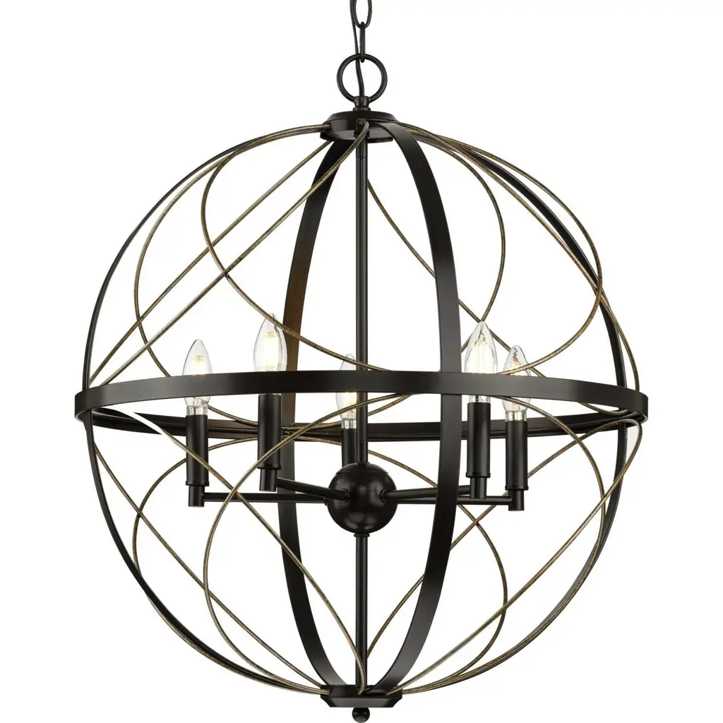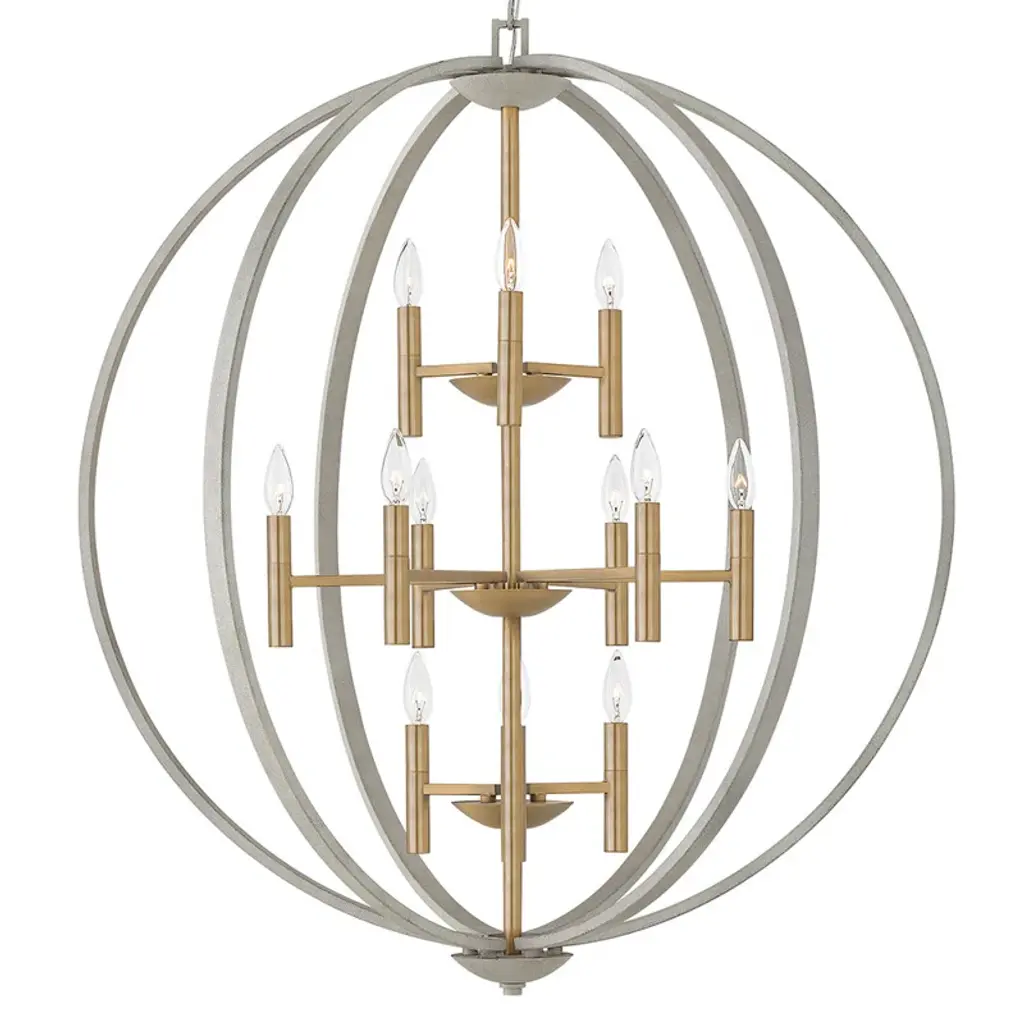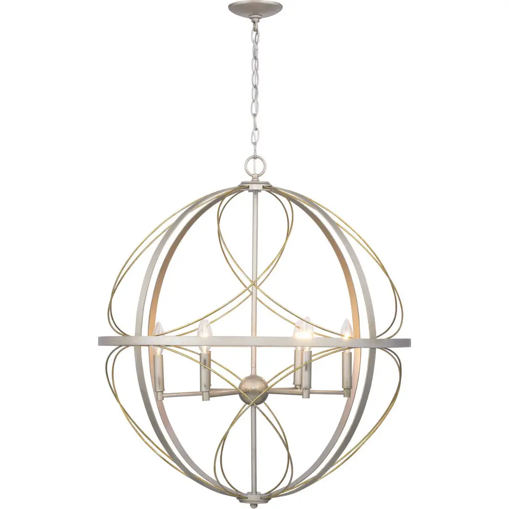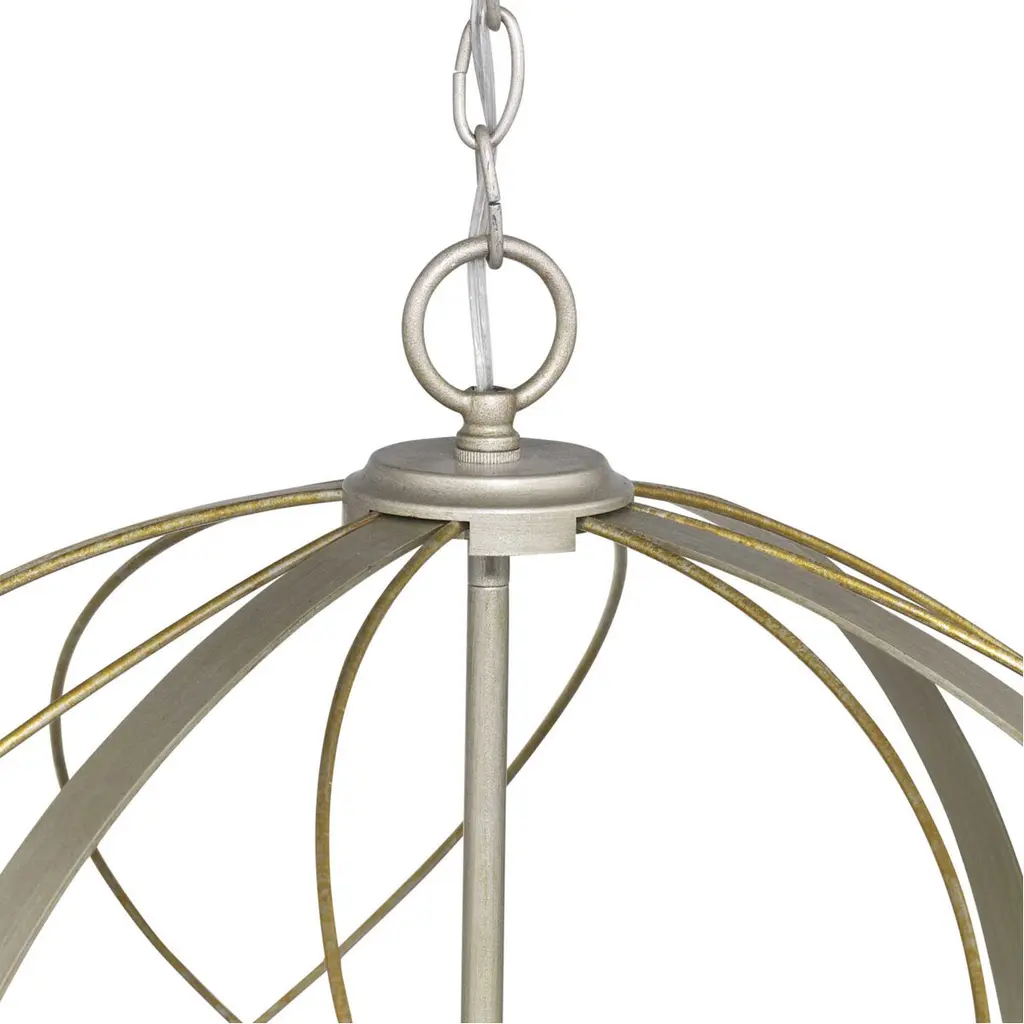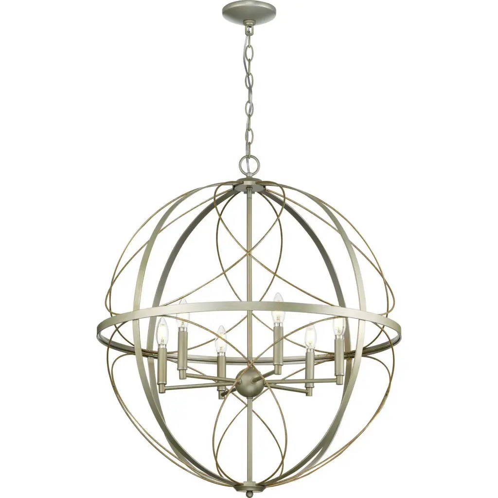 An airy artful pendant, Brandywine’s silhouette features an interlocking sphere with decorative details. The elegant frame highlights a juxtaposition of bold accents and delicate, hand gilded wire accents, finished in a Silver Ridge finish. Capturing a timeless look, this six-light pendant is idea for Farmhouse or Transitional interior settings.