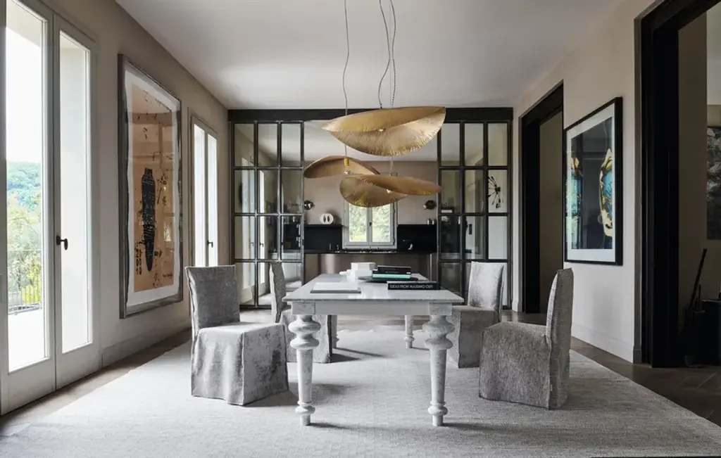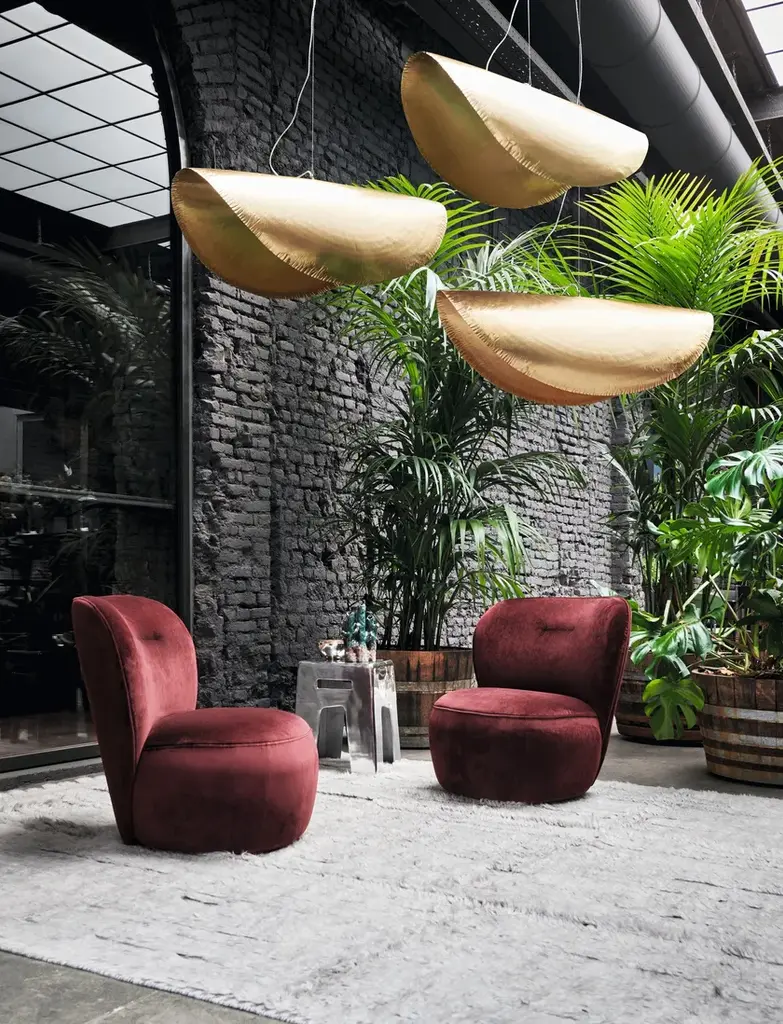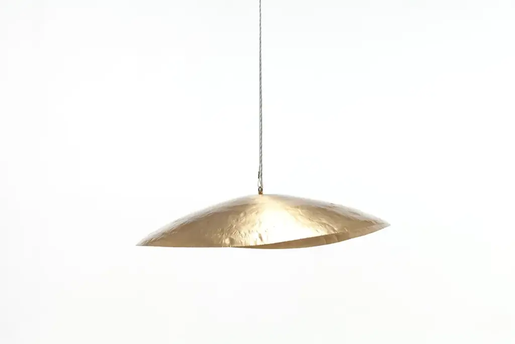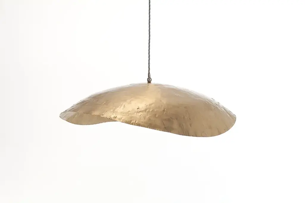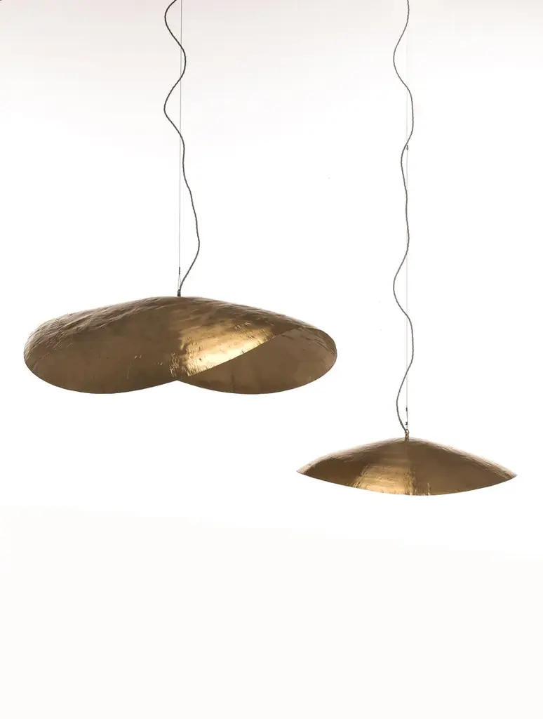 Brass 95/96 is the suspension lamp in hammered matte brass. Max. power 18 W, 220 Volt, bulb holder E 27, bulb not included.With a strong decorative impact, the Brass lamp family exploits the ductility of brass and its ability to embellish interiors with warm and golden light reflections. Suspension lamps have a delicate shape of great visual appeal: a light brass disc with a slight curvature in the smaller version or very accentuated in the larger one that floats in the air reflecting light poetically and suggestively. They can be used individually or combined with each other for an even more suggestive and cinematographic effect. Given the total craftsmanship of the product, it is possible that small stains may appear over time due to oxidation of the brass. These stains are therefore not defects but a characteristic of the material. Small superficial marks, scratches, creases etc. are caused by the hand-hammering process on the brass, so they are characteristic of the manufacturing process.With a strong decorative impact, the Brass collection combines the ductility of brass with its ability to embellish any interior thanks to its luminous reflections. The pendant lamps have a light shape of great visual appeal: a light brass disk that floats in the air reflecting the light in a poetic and suggestive way. The collection is also completed by a series of small tables and coffee tables with a sculptural image and with the top in a brass or aluminium version, for warm and golden or cold and silver reflections. The Brass collection strongly connotes any environment underlining the eclectic spirit of the brand.