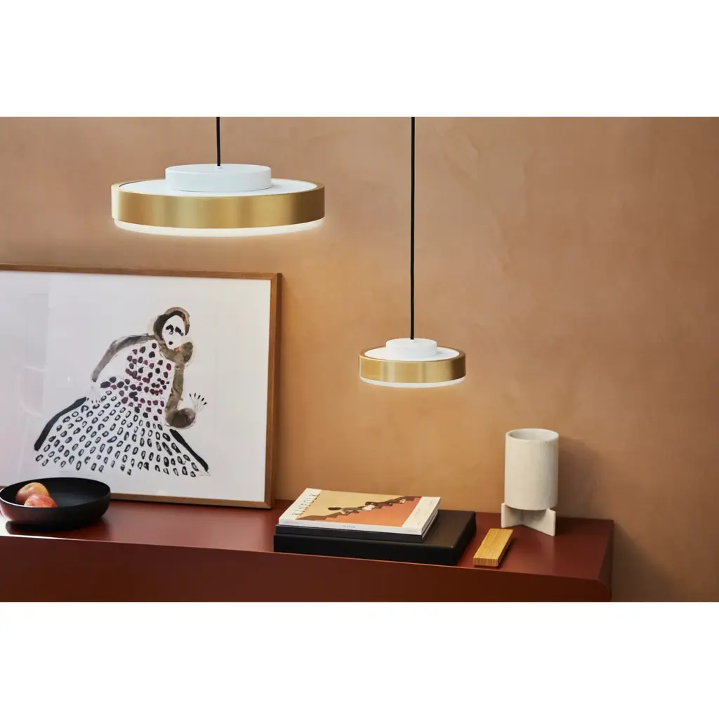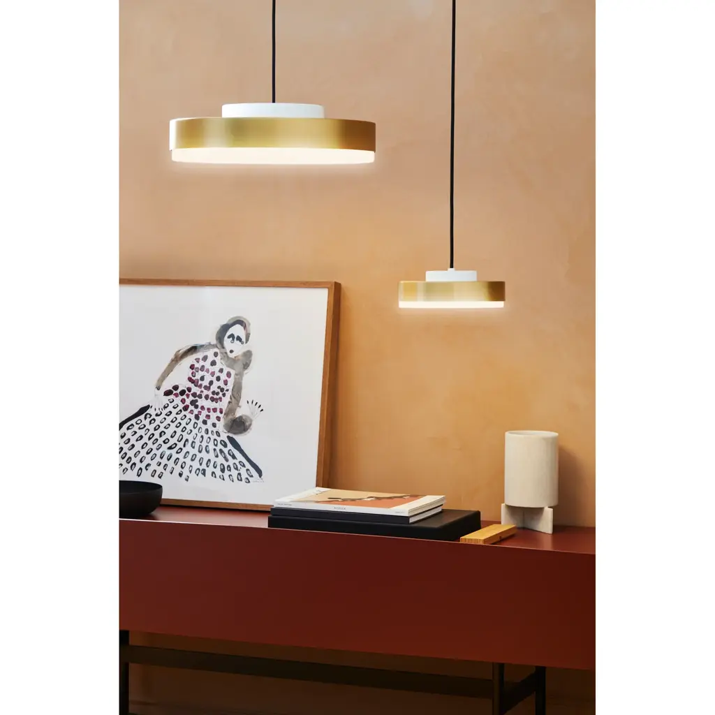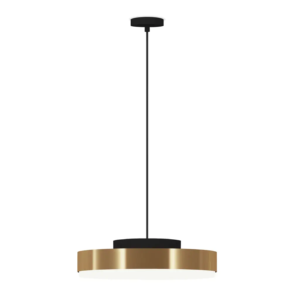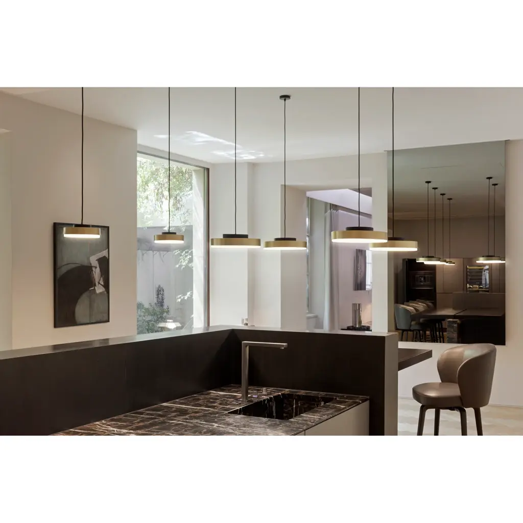 Introducing the Brass Framed Pendant Lamp by Contardi Discus. Available in suspension, applique, and ceiling options, this minimalist range showcases a sophisticated and contemporary design. With interlocking metal discs and a semi-polished brass band, this lamp adds a touch of luxury to any space. Illuminate your home with style.