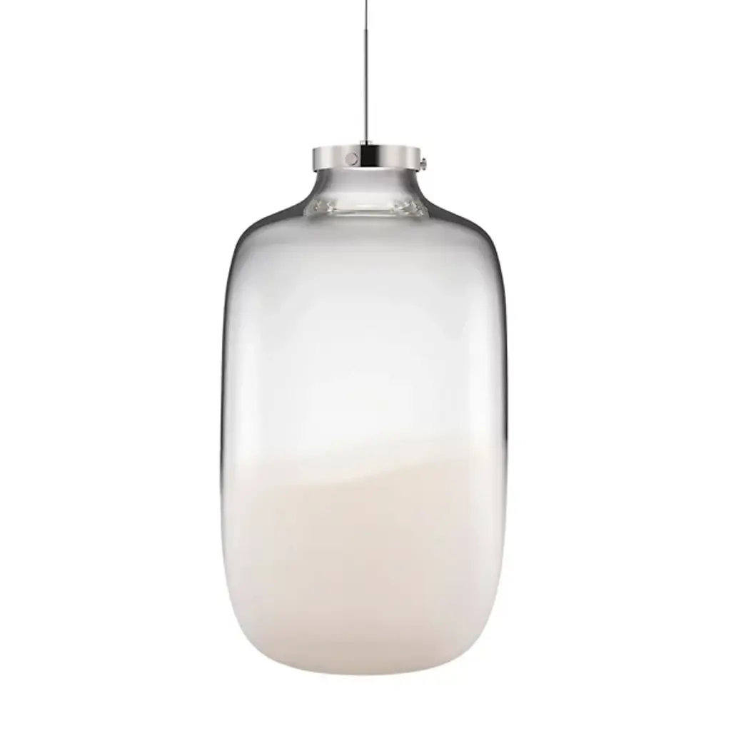 Present lasting and elegant illumination to interiors with the Brava Tall Pendant from Niche. This Jeremy Pyles design is inspired by a sunrise through fog and is retained from above by a low-profile canopy and a single slender cable. The cable supports a round metal ring housing studded with small knobs that hold a tall, rounded shade of Opaline and Crystal Ombra glass around the lamping, creating an organic gradient that shifts from a milky lower surface to a clearer upper surface, broadcasting a memorable, layered light to the sides.