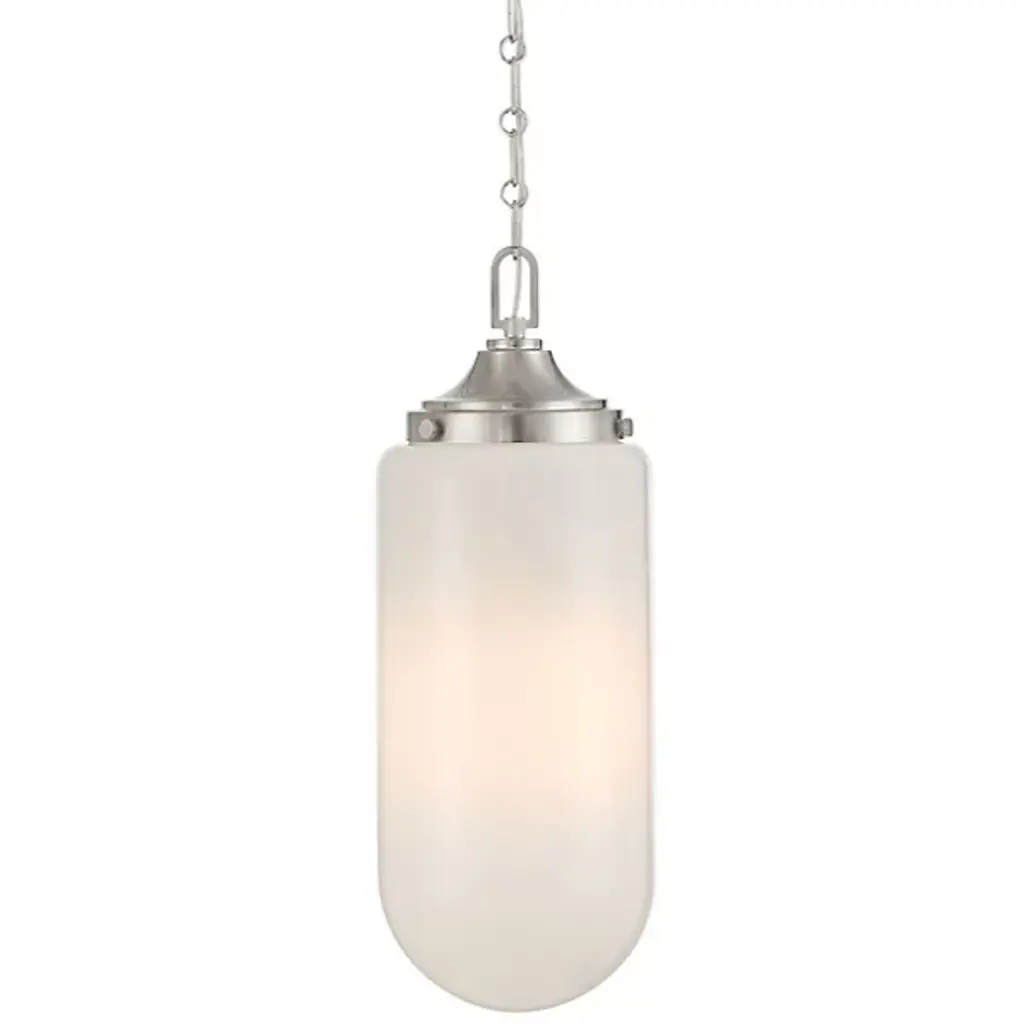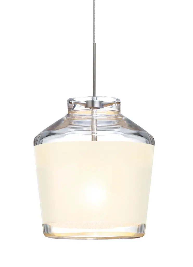 Present lasting and elegant illumination to interiors with the Brava Tall Pendant from Niche. This Jeremy Pyles design is inspired by a sunrise through fog and is retained from above by a low-profile canopy and a single slender cable. The cable supports a round metal ring housing studded with small knobs that hold a tall, rounded shade of Opaline and Crystal Ombra glass around the lamping, creating an organic gradient that shifts from a milky lower surface to a clearer upper surface, broadcasting a memorable, layered light to the sides.