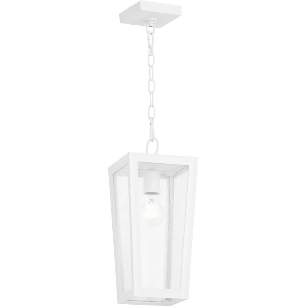 The Bravo outdoor series is a collection of wet-listed LED fixtures constructed of coastal-grade materials. A sleek, geometric shape gives the Bravo family a mid-century modern tilt. These fixtures feature one medium base light source enclosed within four clear-seeded glass panes. This edition, a pendant lantern, sports a matching chain and canopy in a sharp white finish.