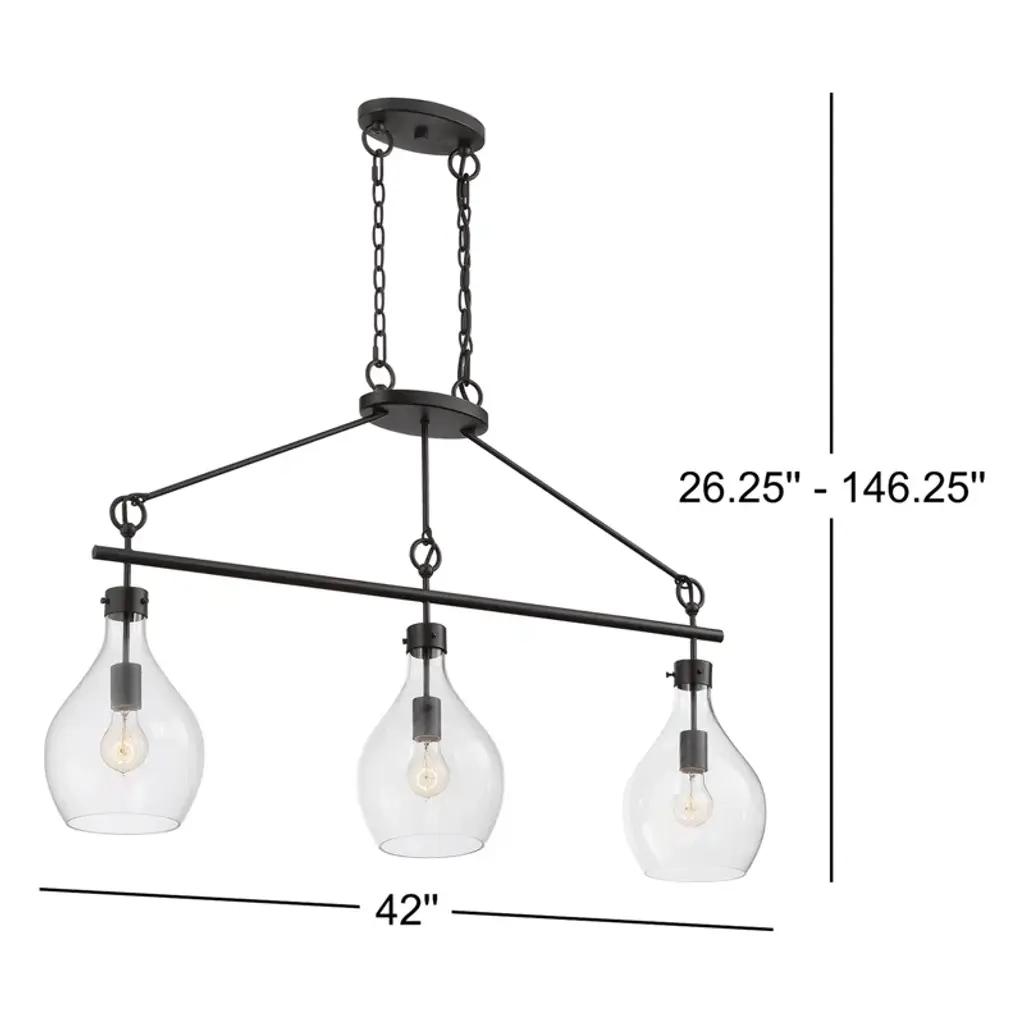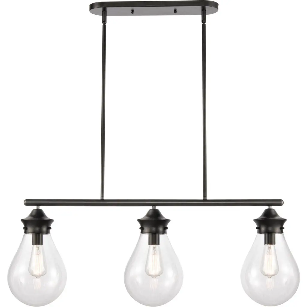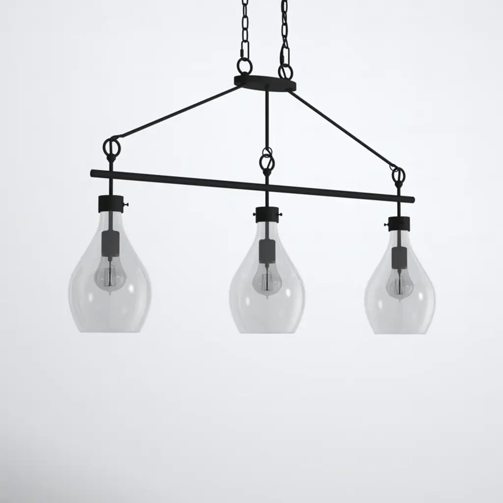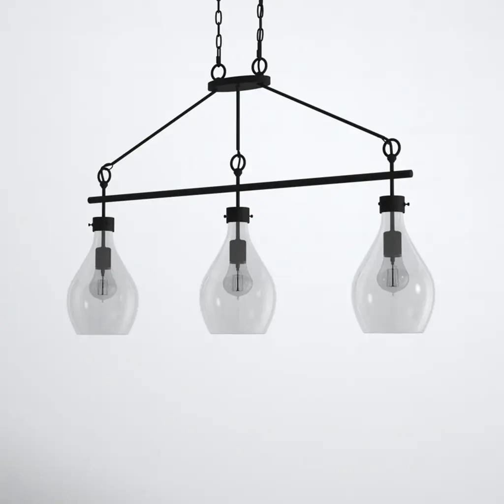 This 3-light teardrop pendant is just right for illuminating your kitchen counter, whether you're hosting cocktail parties or supervising homework hours. It's crafted from metal in an industrial-inspired, linear silhouette with three shapely glass teardrop shades. This pendant light fills any space with plenty of ambient lighting from three standard bulbs up to 60W each (sold separately). Plus, it's dimmable, so you can set just the right ambience for any occasion. This fixture hangs from an adjustable-height chain that's compatible with sloped ceilings, so it's a sure fit for your home.