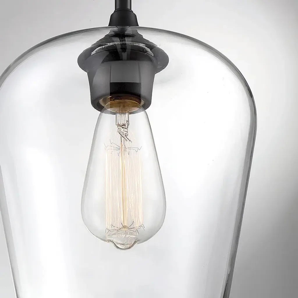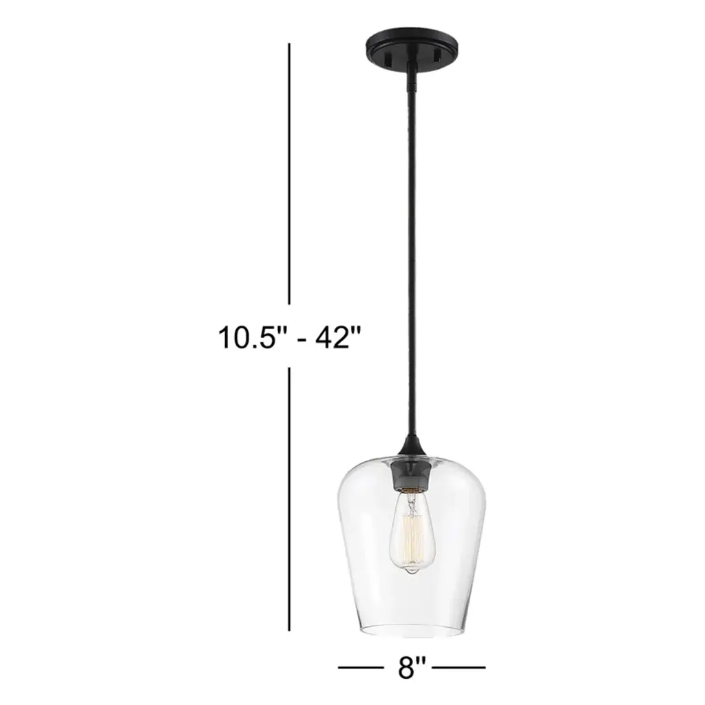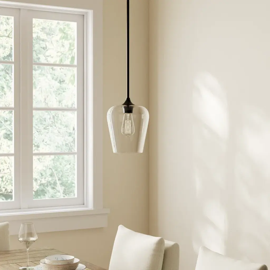 Illuminate your living space with this 1-light bell pendant that shows off a sleek, minimalist design. Made from steel with a matte black finish, it has a clear glass shade that reflects the glow from a single bulb (sold separately). We love that it's compatible with dimmer switches to move you effortlessly from day to night. Held aloft by a height-adjustable rod, this pendant light also includes a sloped-ceiling adapter.