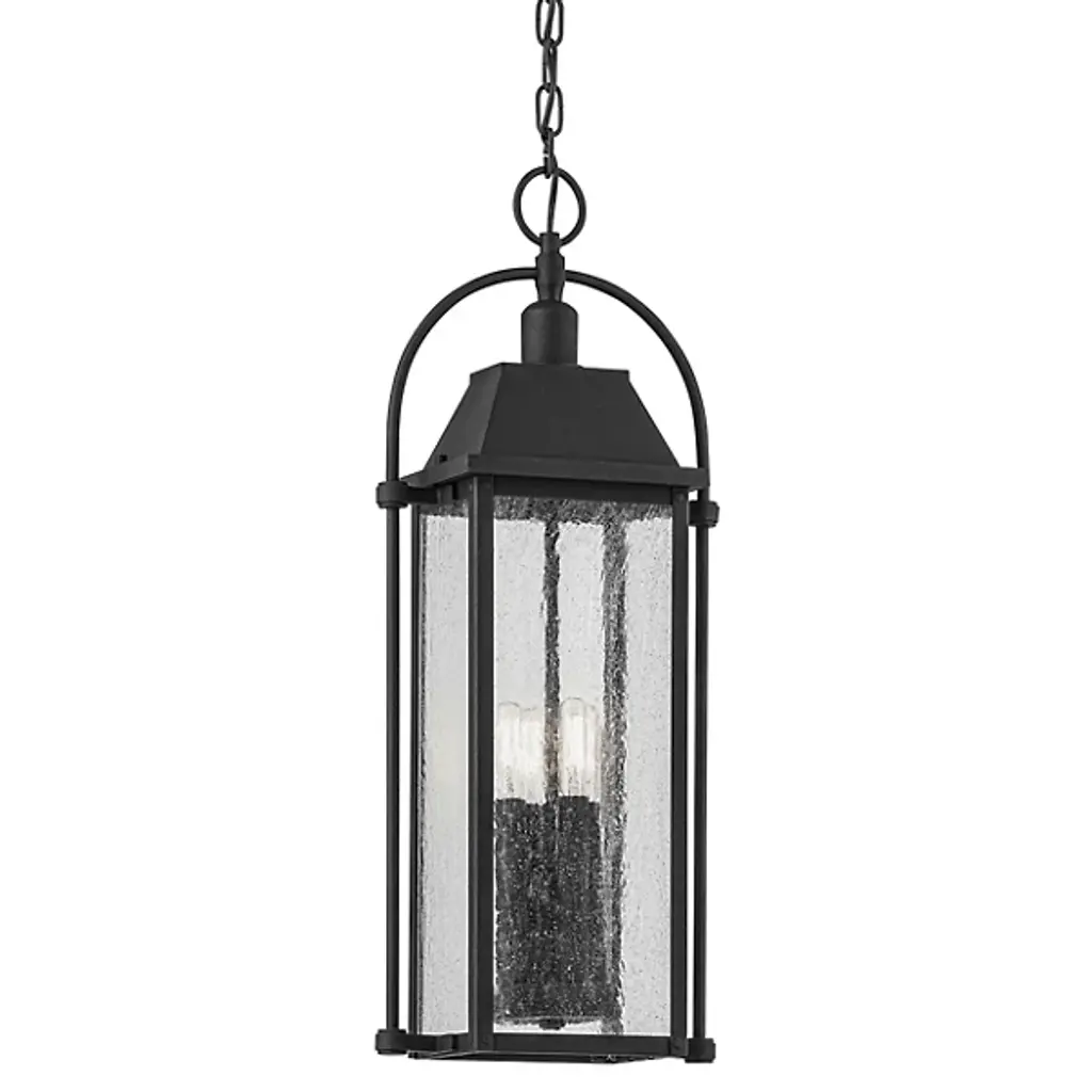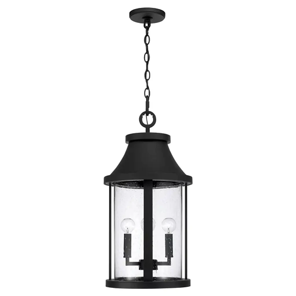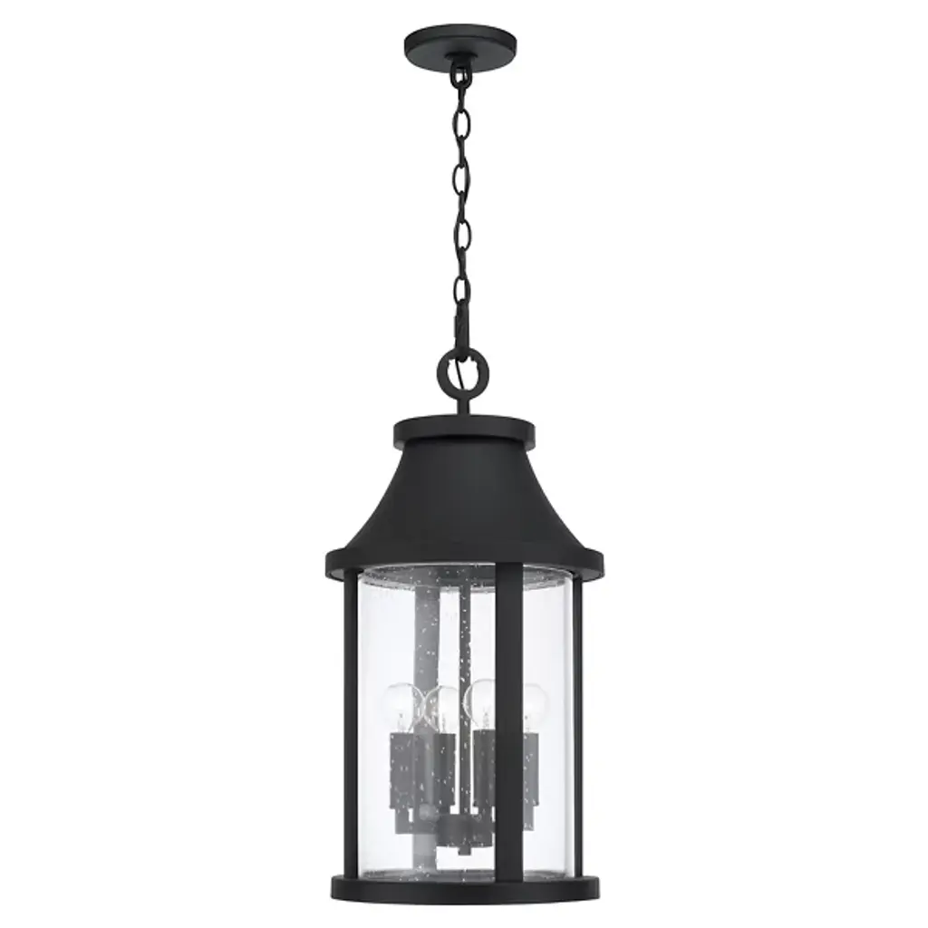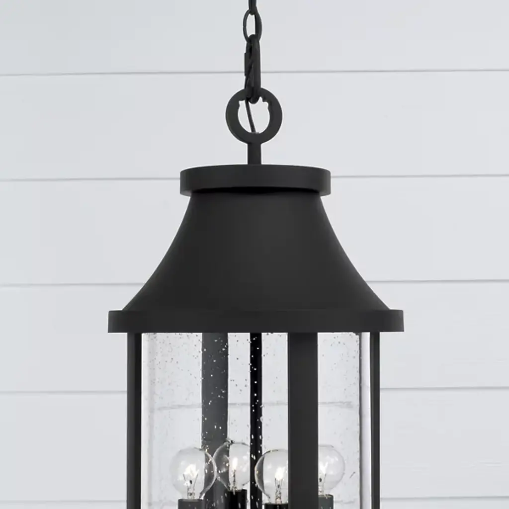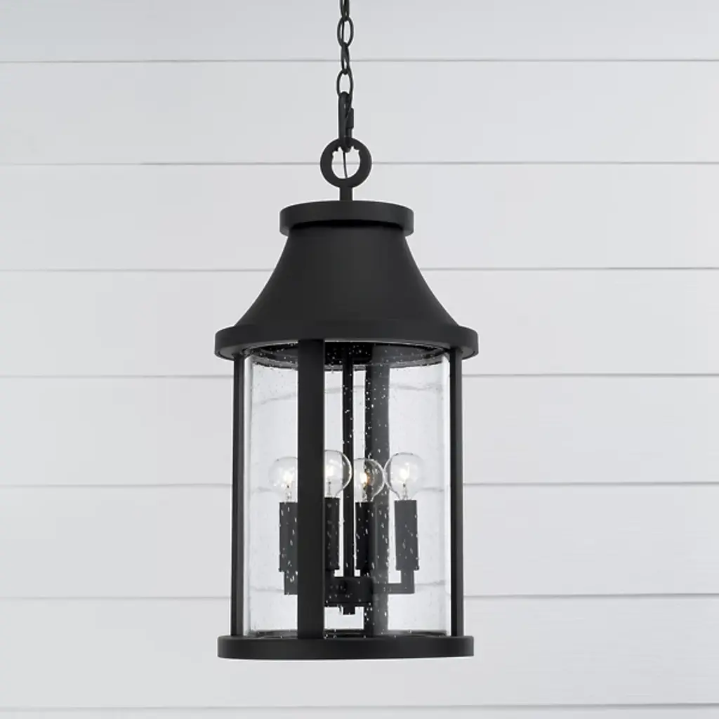 The Bridge Outdoor Lantern Pendant from Capital Lighting evokes memories of vintage street lamps, while clean lines add a contemporary twist. Seeded glass panels are perfect for creating an appealing mood on your porch or patio. The curved cap and distinctive ring detail add visual interest, elevating this piece from a simple fixture to outdoor art. Part of the Rain or Shine Series, this lantern effortlessly enhances entryways, covered decks, or garden pathways.