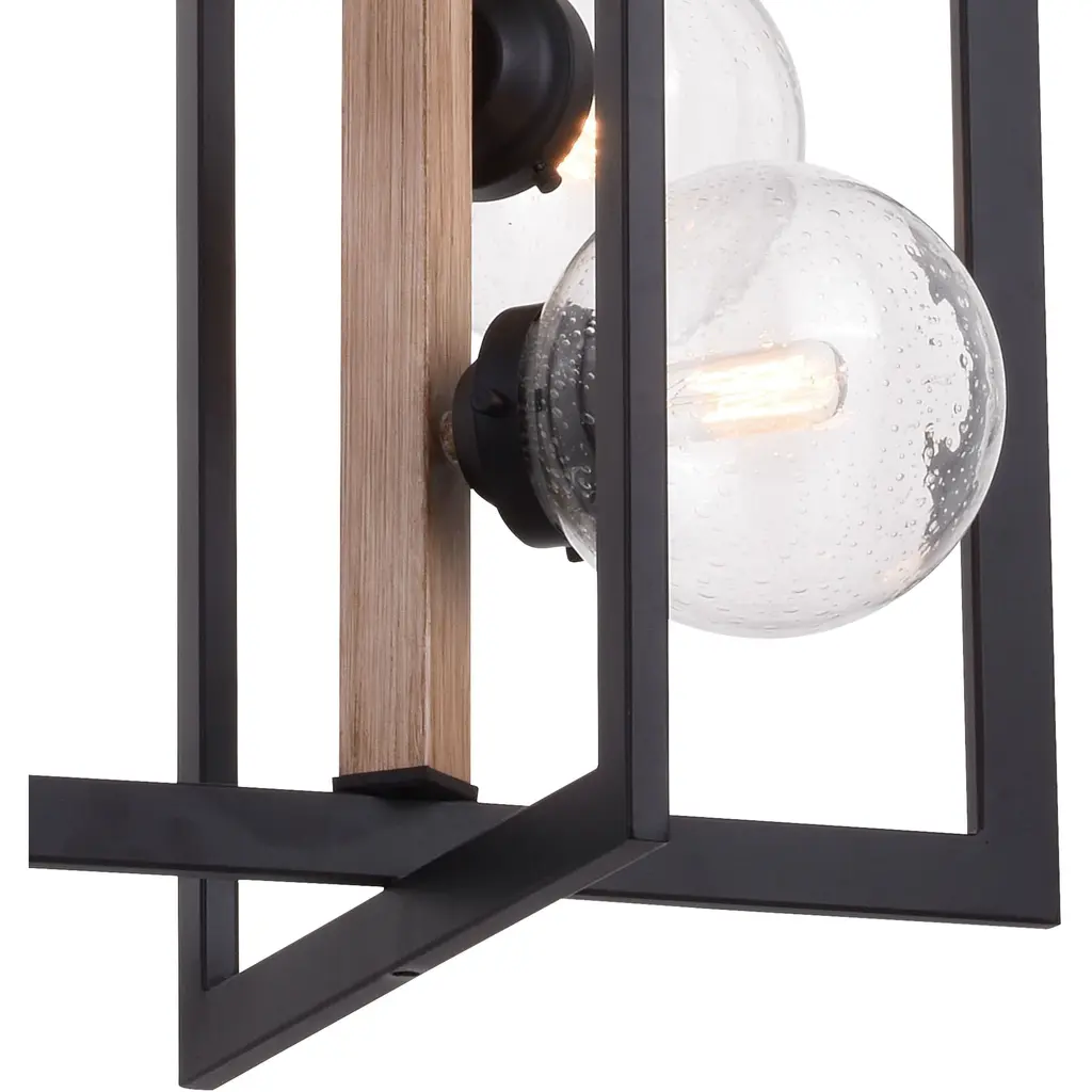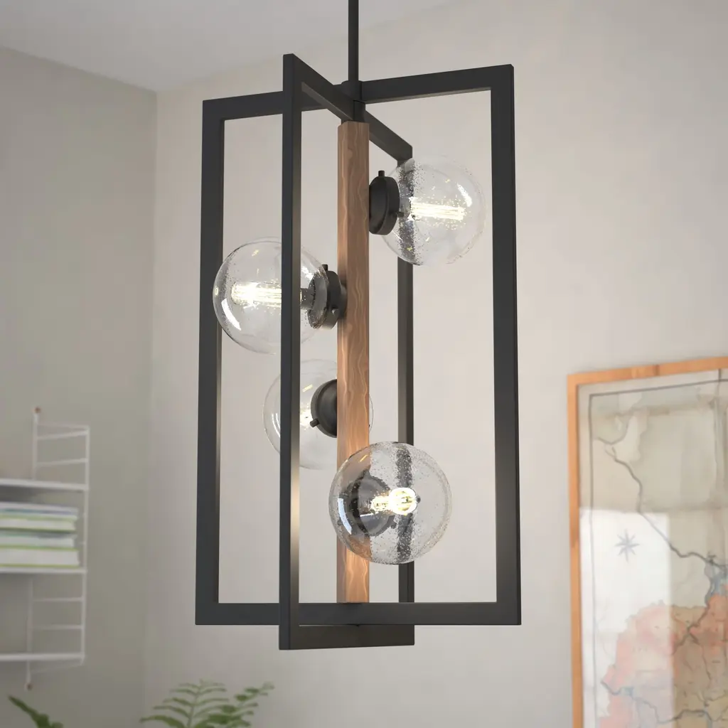 The Bridgeview collection of pendant lights was developed with design elements of rustic, industrial and mid-century modern decor-perfect for today's on-trend spaces. The clean straight lines of this linear chandelier frame the clear seeded glass globes which are artfully arranged along the wood-toned central support. This versatile hanging ceiling light is suitable for many spaces in your home ideal for kitchen island lighting, dining room, bedroom, foyer, entryway, living room, and more.