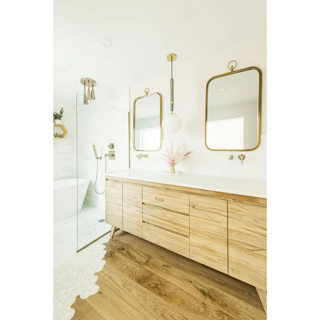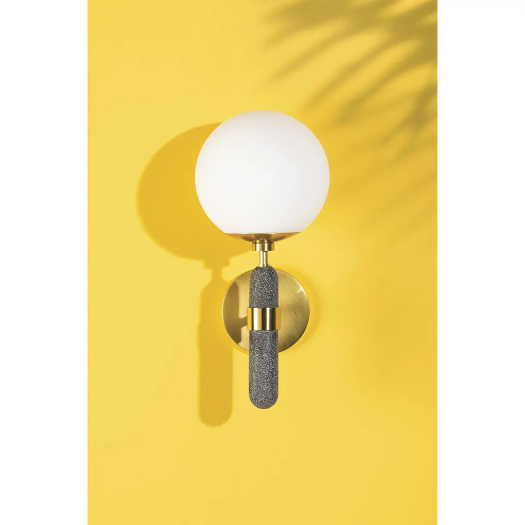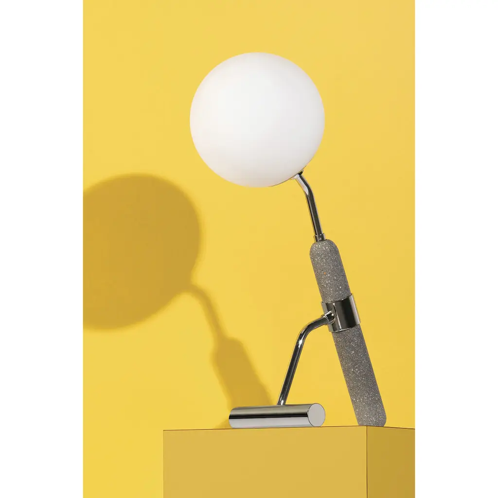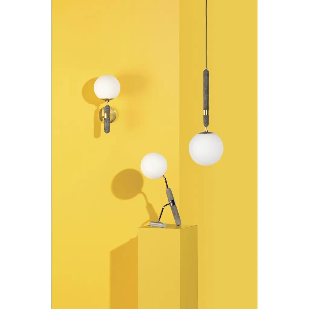 Brielle brings concrete to the party. Grey and a bit rough with heterogeneous flecks, the material introduces instant textural intrigue to a space. Classic white shades and metal cuffs around the cylindrical body contrast the concrete and give it an elegant, contemporary feel.