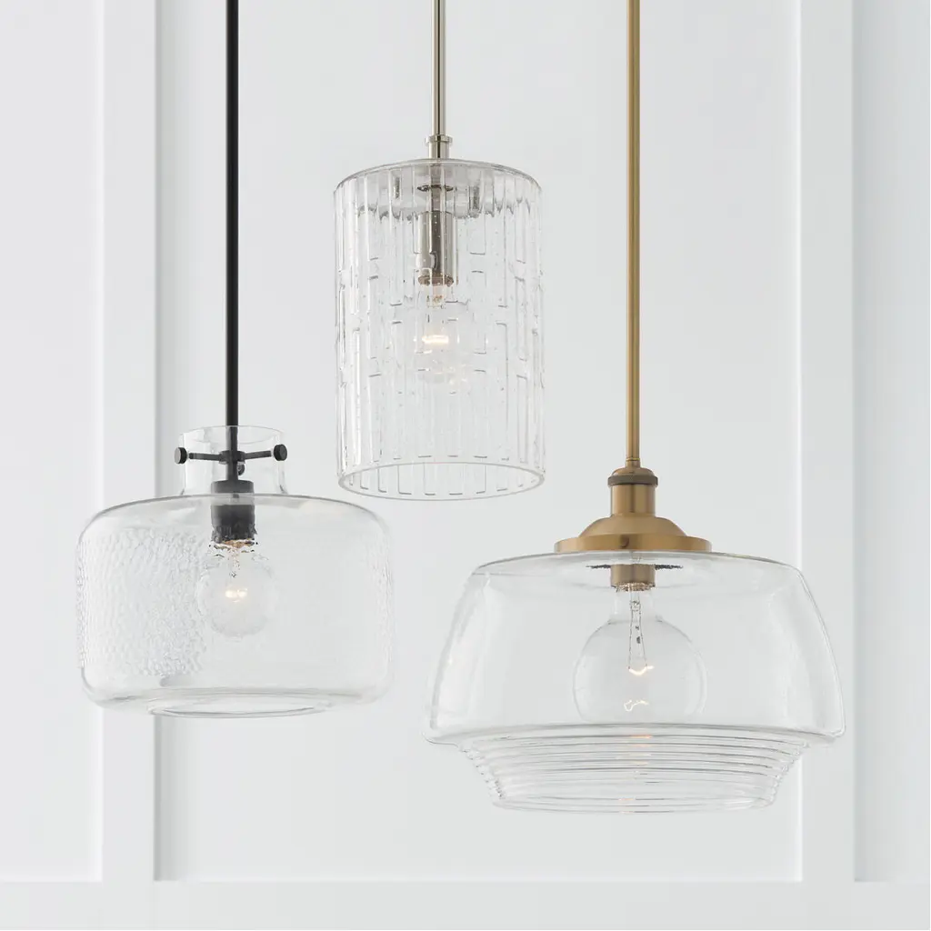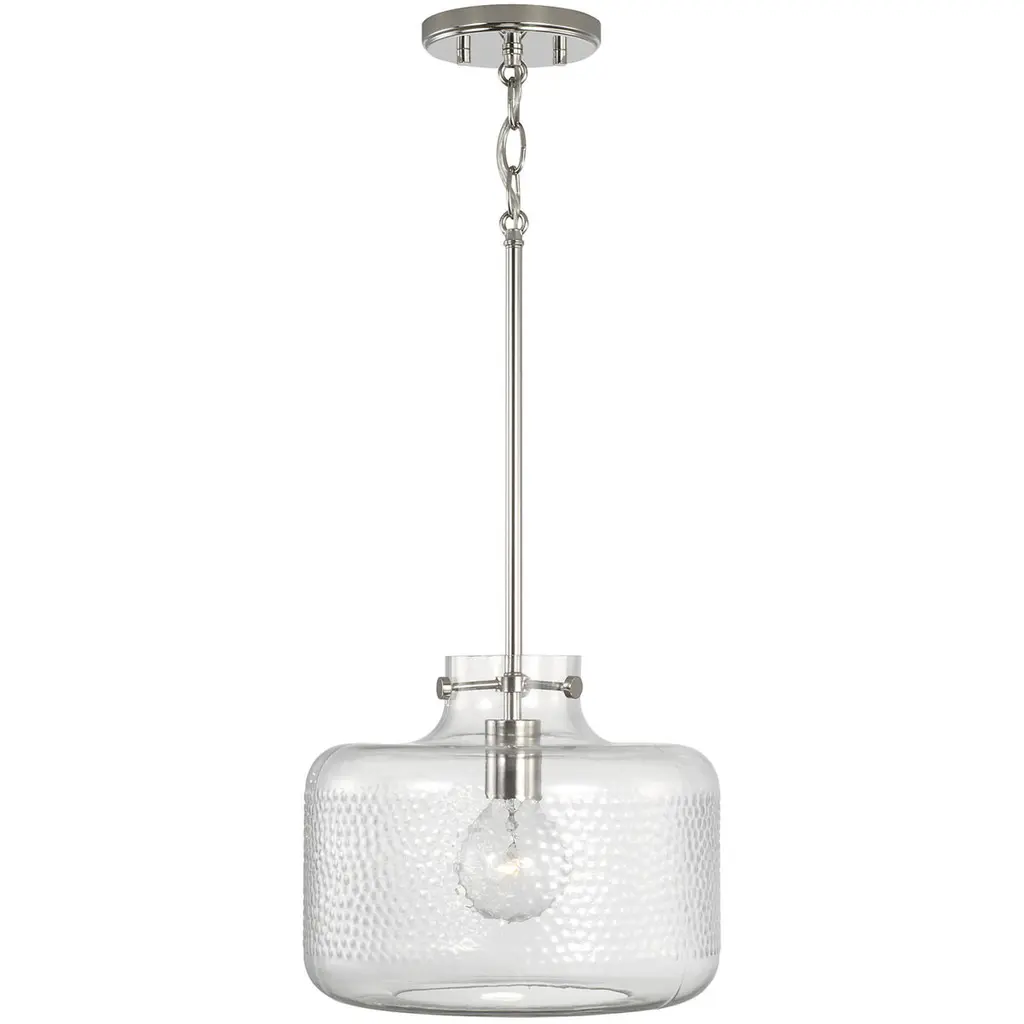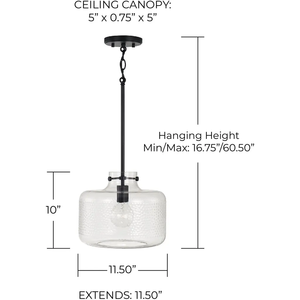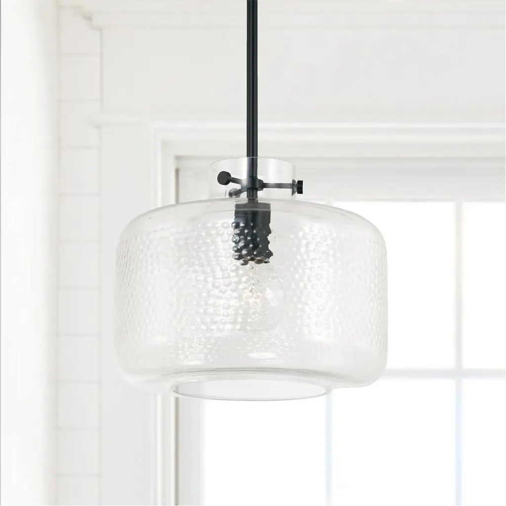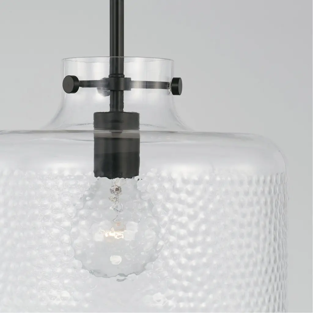 The unique pebble detailing of the glass cloche on the 1-Light Pendant in Matte Black gives an artisan touch to the classic silhouette.