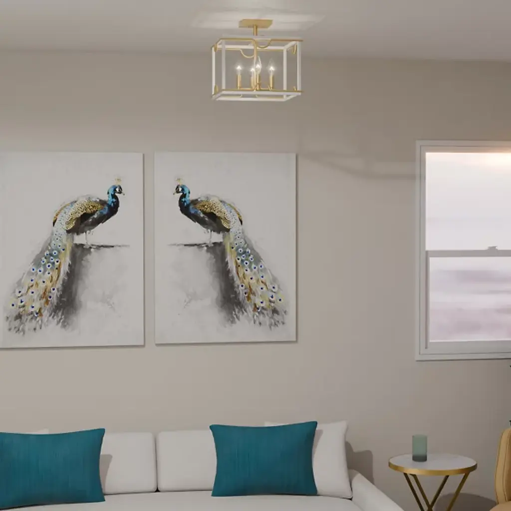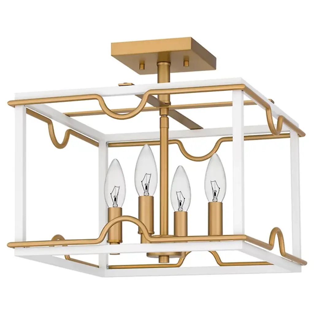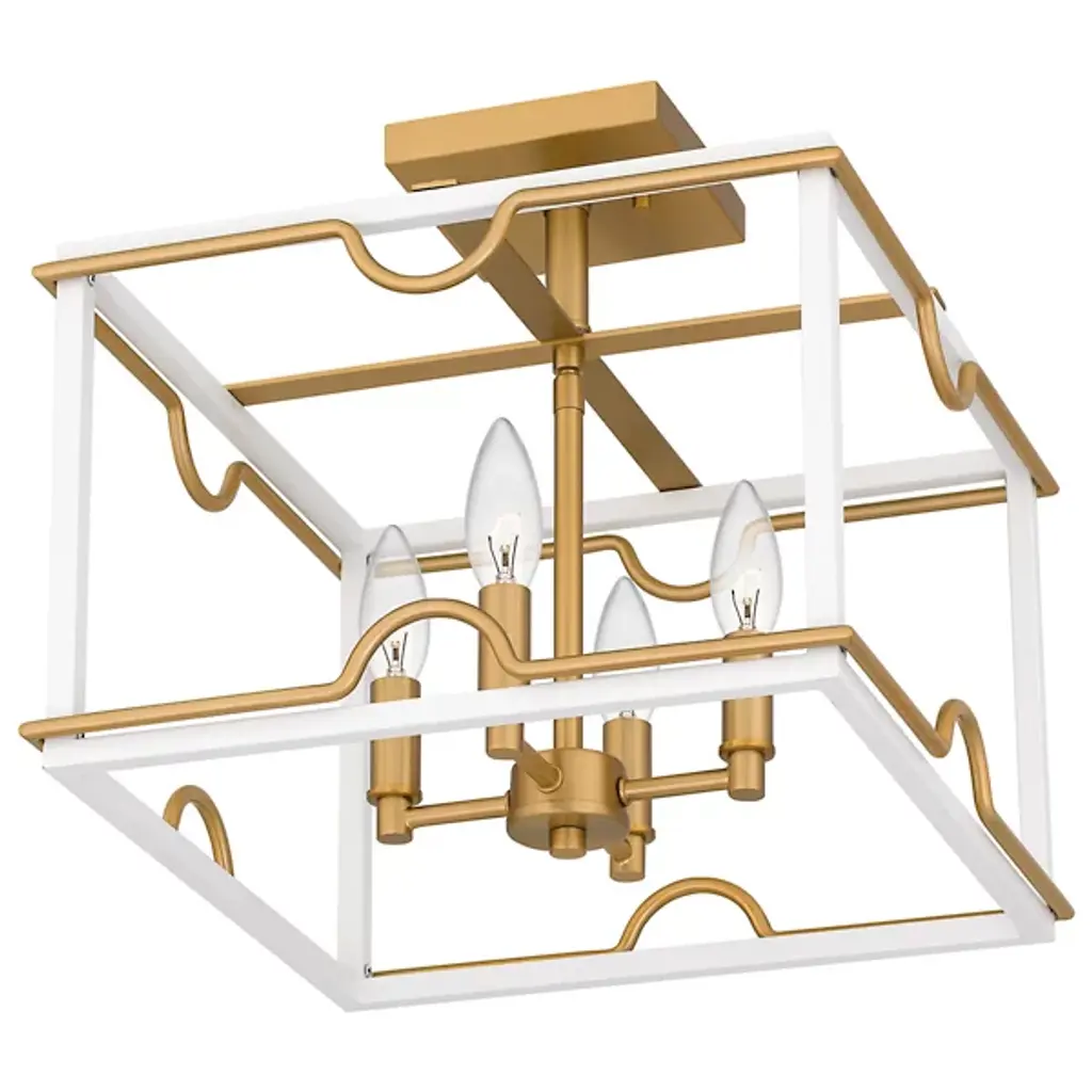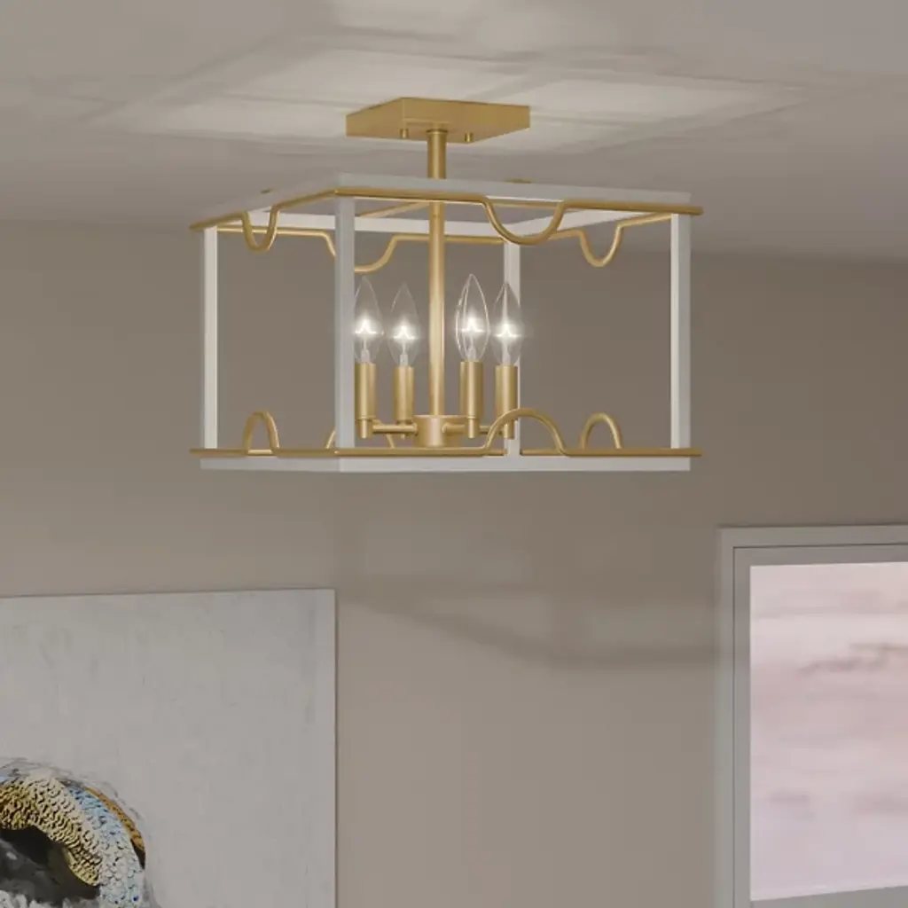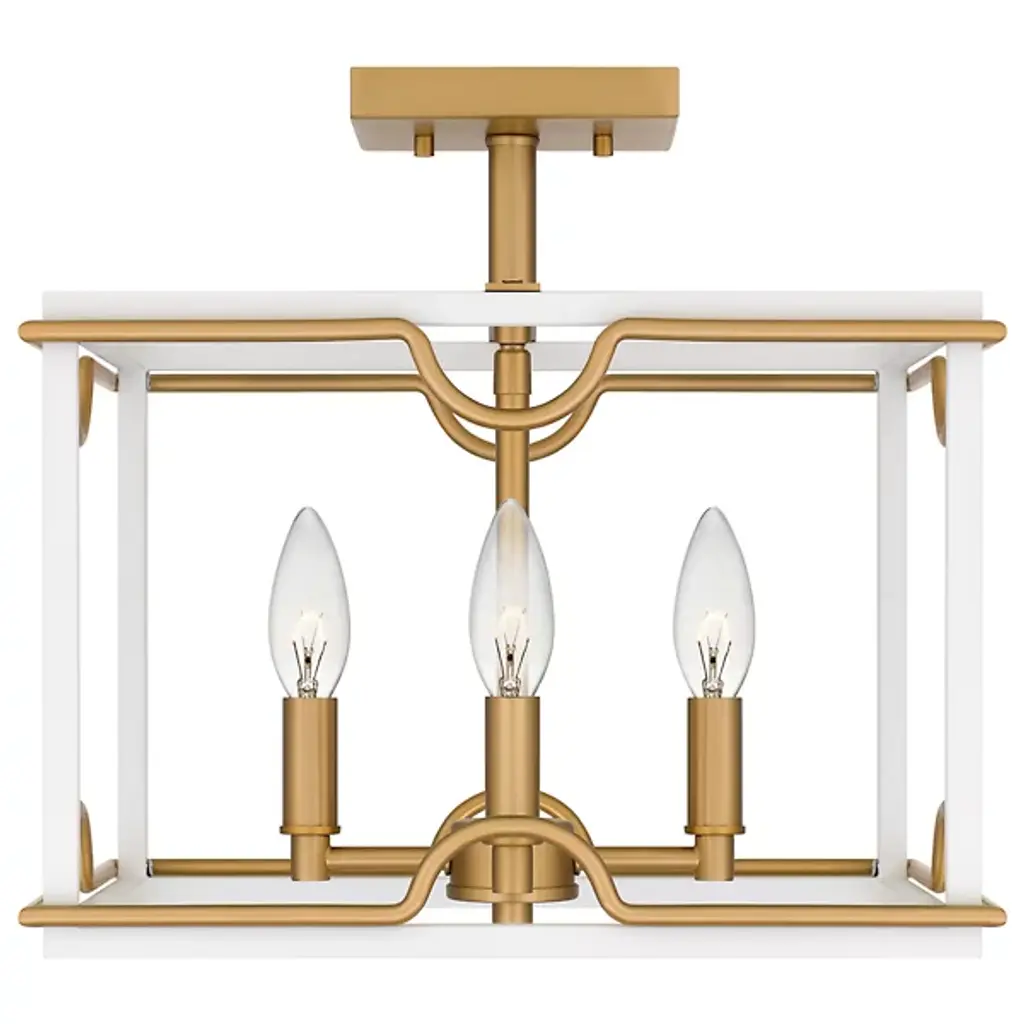 The Brinkman Semi-Flushmount from Quoizel blends weathered accents and transitional aesthetics. Brinkman brings a touch of elegance to your space. Crafted with precision from durable steel, its curved lines seamlessly pair with the straight lines of the silhouette, creating a captivating geometric layering effect that adds depth and dimension. This exquisite fixture is illuminated by efficient LEDs, supported by cylindrical encasements for a candelabra presentation. The ambient glow creates a warm and inviting atmosphere.