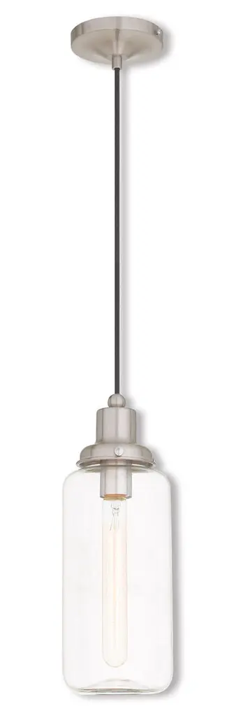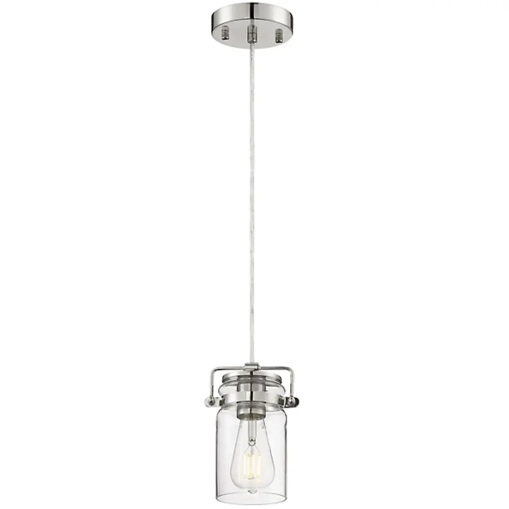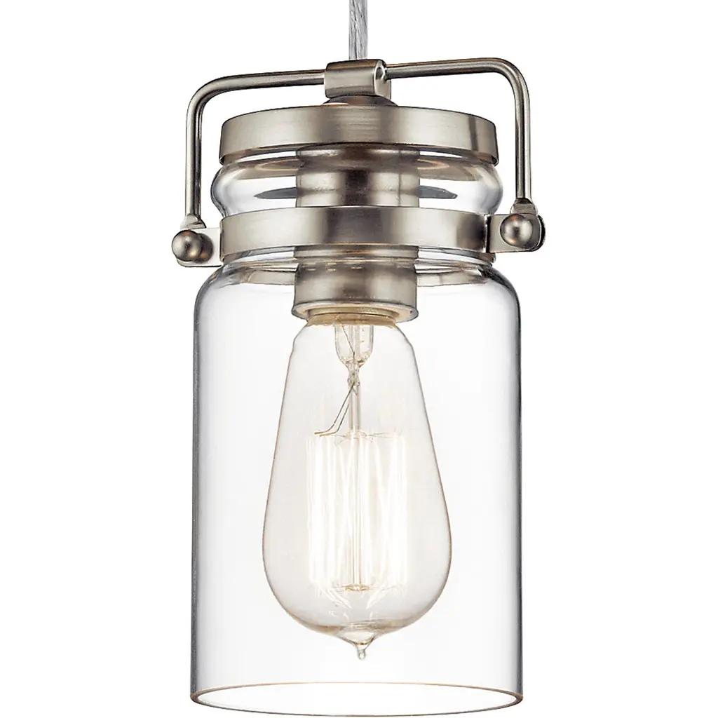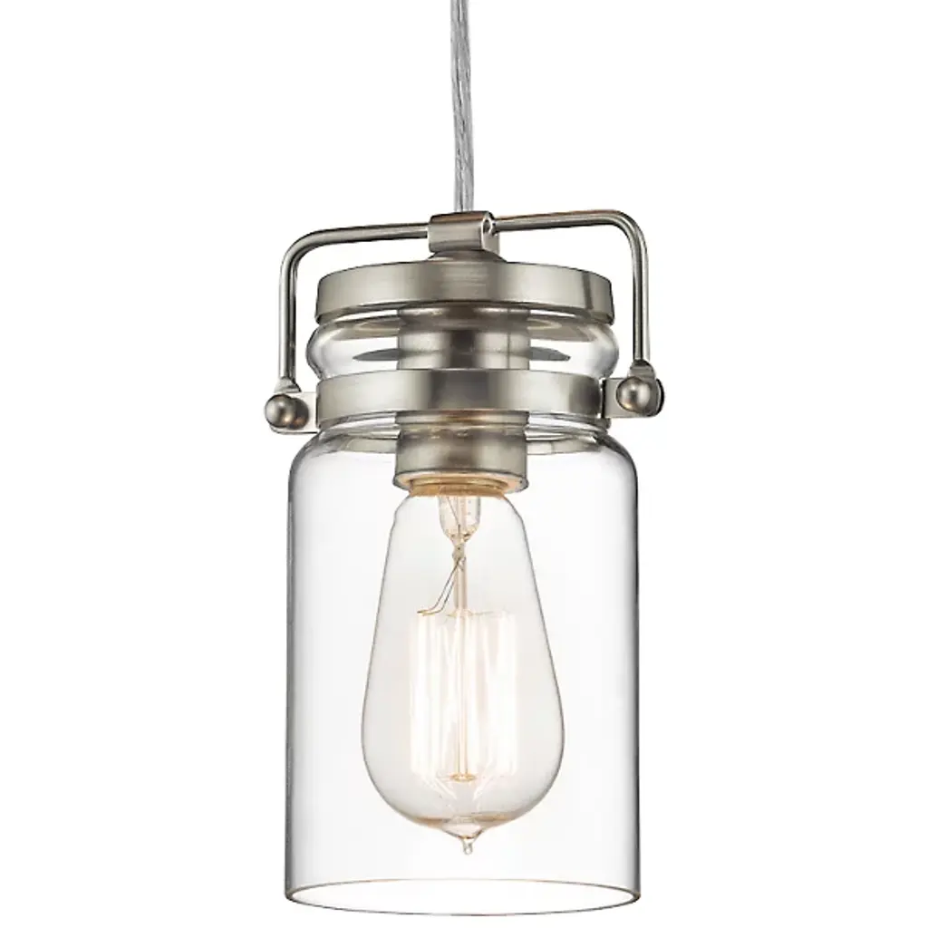 Brinley(TM) 7.75in. 1 light mini pendant features a modern vintage look with its Brushed Nickel finish and clear glass. Inspired by mason jars, the Brinley(TM) mini pendant works in several aesthetic environments, including modern vintage and transitional.