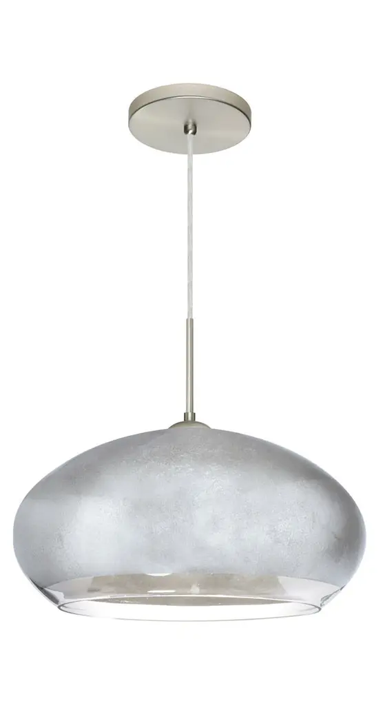 The Brio 14 is a wide yet compact handcrafted glass, softly radiused to fit gracefully into contemporary spaces. Our Silver Foil glass is sparkling and metallic. Distressed metal foil is applied to the inner surface of a glossy clear blown glass. This décor is full of textured and depth, however the outer surface of the glass is smooth. When lit the glass comes to life, as the distressed foil allows glimpses of light to pass through. This blown glass is handcrafted by a skilled artisan, utilizing century-old techniques passed down from generation to generation. Each piece of this décor has its own artistic nature that can be individually appreciated. The cord pendant fixture is equipped with a 10' SVT cordset and an low profile flat monopoint canopy. These stylish and functional luminaries are offered in a beautiful Satin Nickel finish.