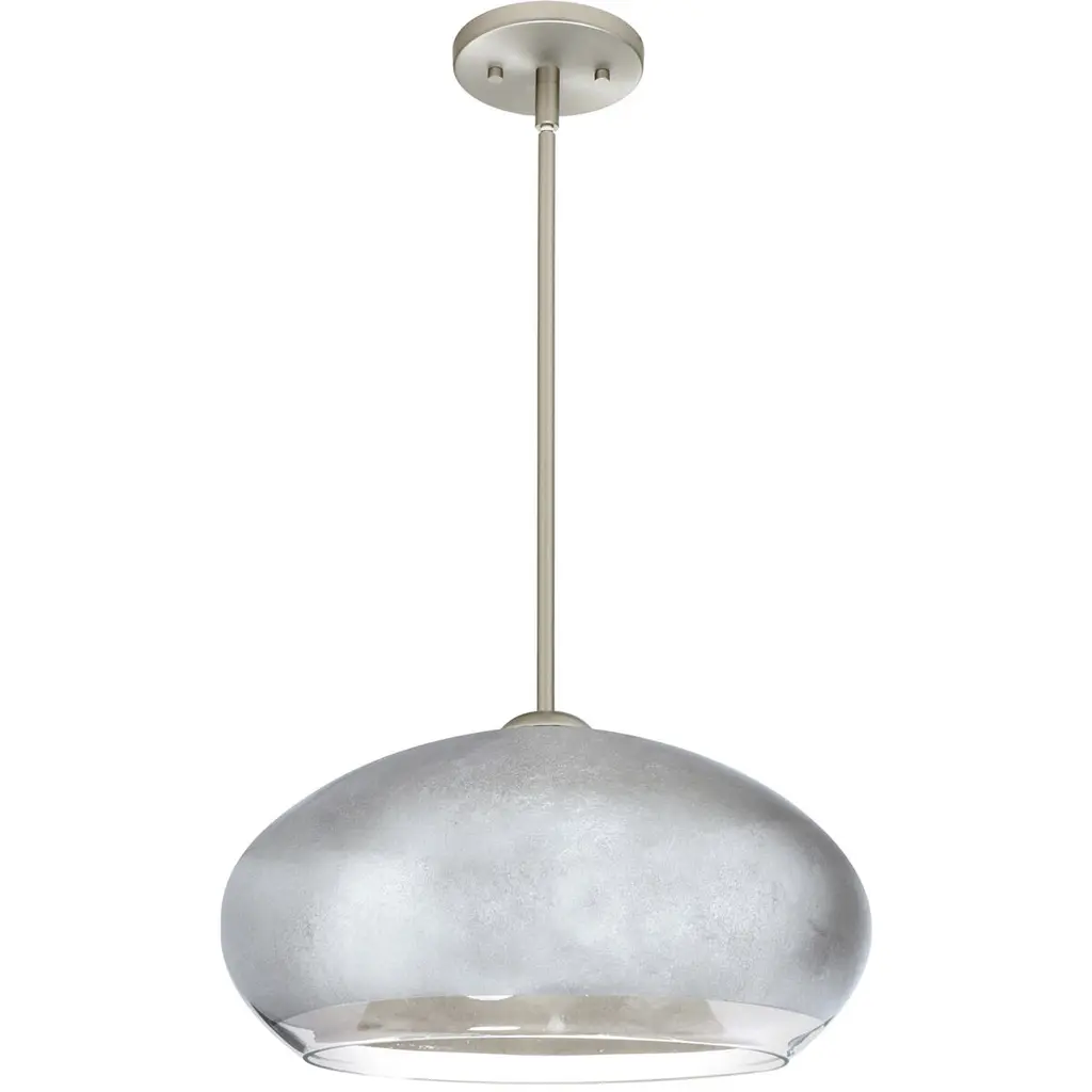 The Brio 14 is a wide yet compact handcrafted glass, softly radiused to fit gracefully into contemporary spaces. Our Silver Foil glass is sparkling and metallic. Distressed metal foil is applied to the inner surface of a glossy clear blown glass. This décor is full of textured and depth, however the outer surface of the glass is smooth. When lit the glass comes to life, as the distressed foil allows glimpses of light to pass through. This blown glass is handcrafted by a skilled artisan, utilizing century-old techniques passed down from generation to generation. Each piece of this décor has its own artistic nature that can be individually appreciated. The stem pendant fixture is equipped with an adjustable telescoping section, 4 connectable stem sections (3", 6", 12", and 18") and low Profile flat monopoint canopy. These stylish and functional luminaries are offered in a beautiful Satin Nickel finish.