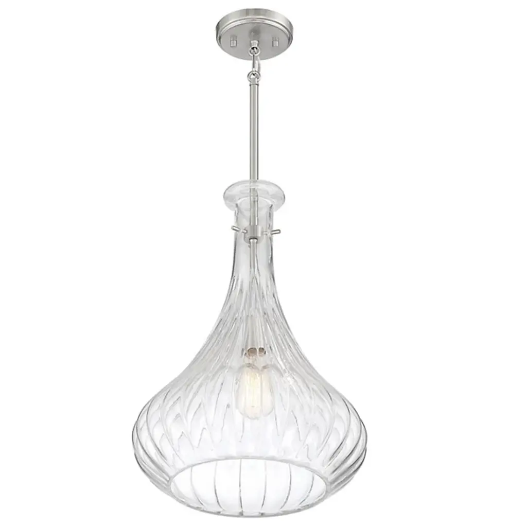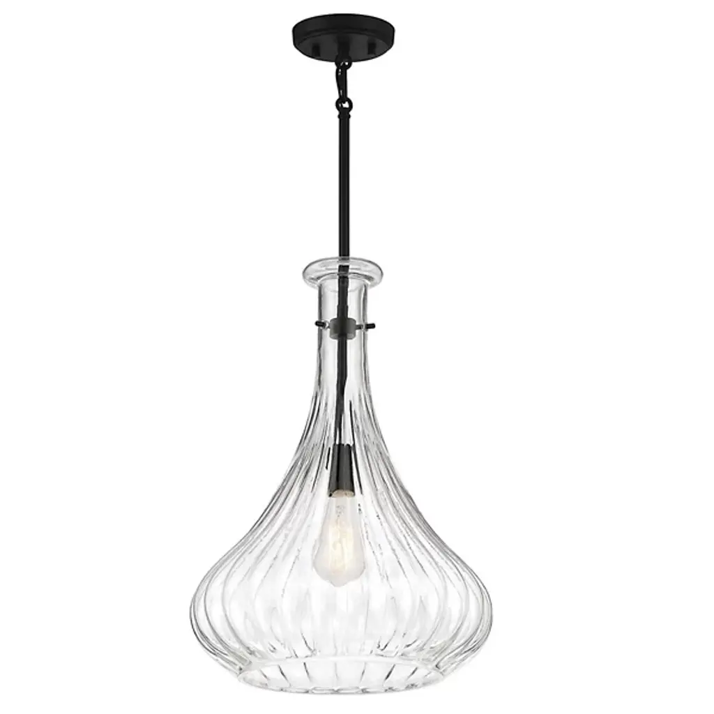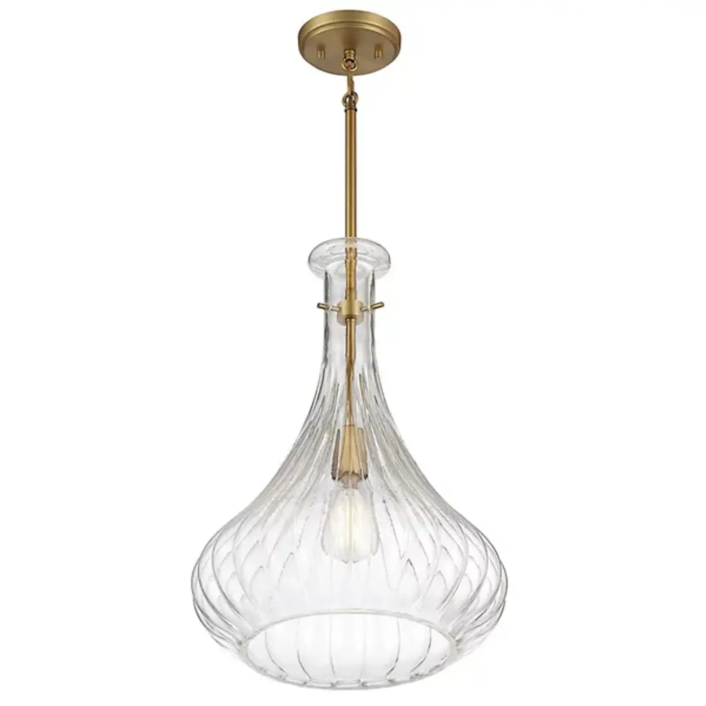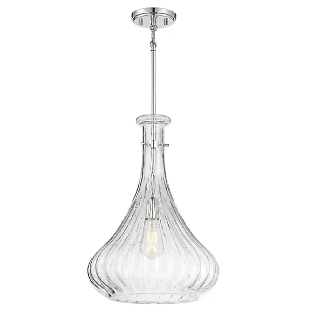 The Bristo Pendant by Savoy House is a beautiful design that adds a bright touch to surroundings. A blown glass shade with a ribbed texture has a fluted neck and a soft, rounded body that allows the single light source within to filter evenly throughout its form. Supported by a single downrod and round canopy, the shapely silhouette of this design adds a decorative touch to the spaces it illuminates.