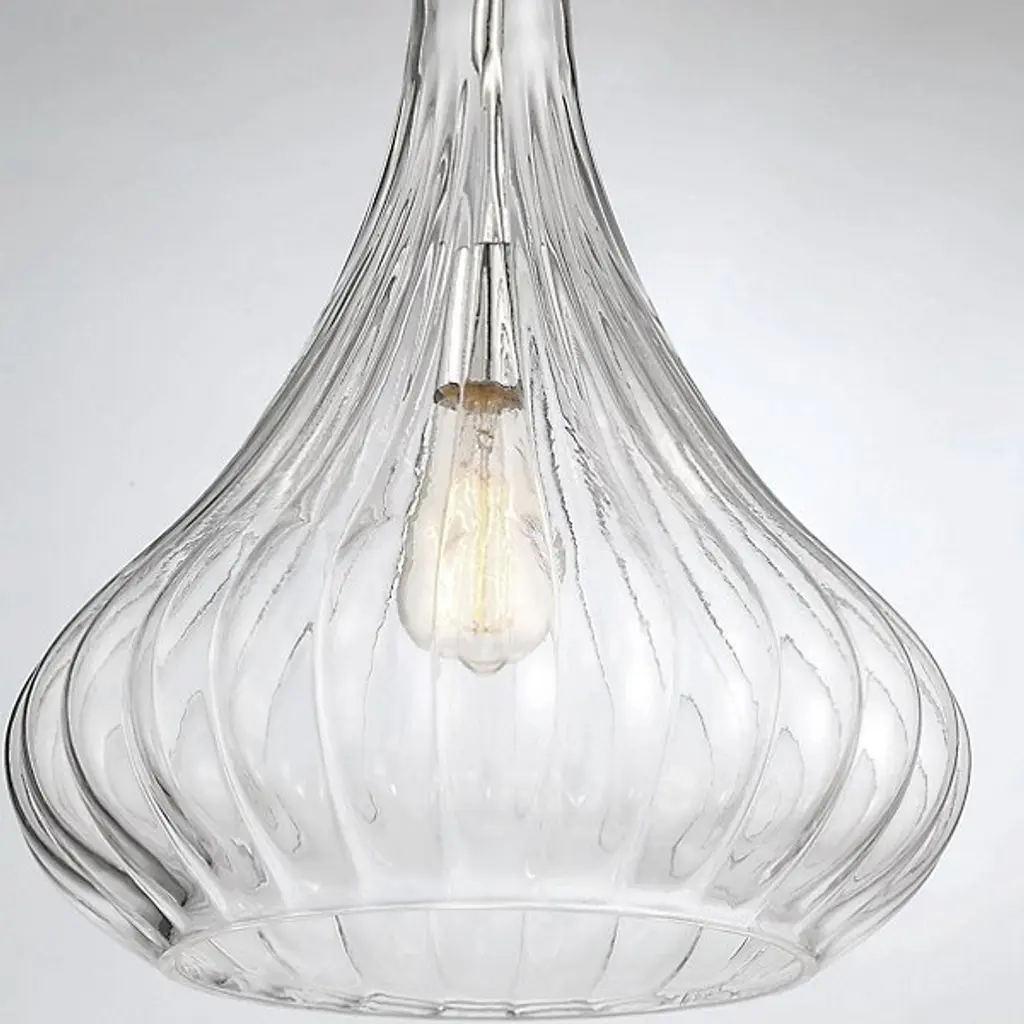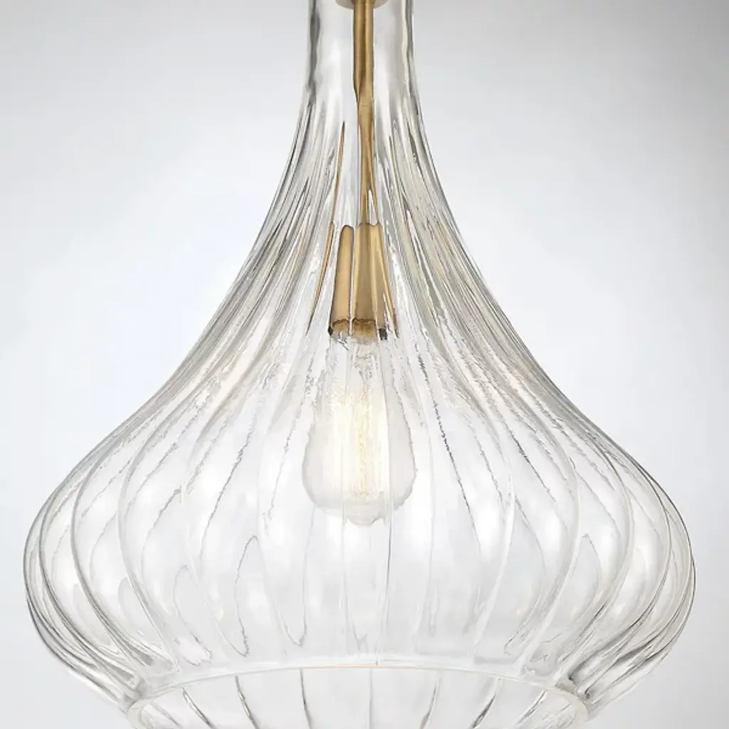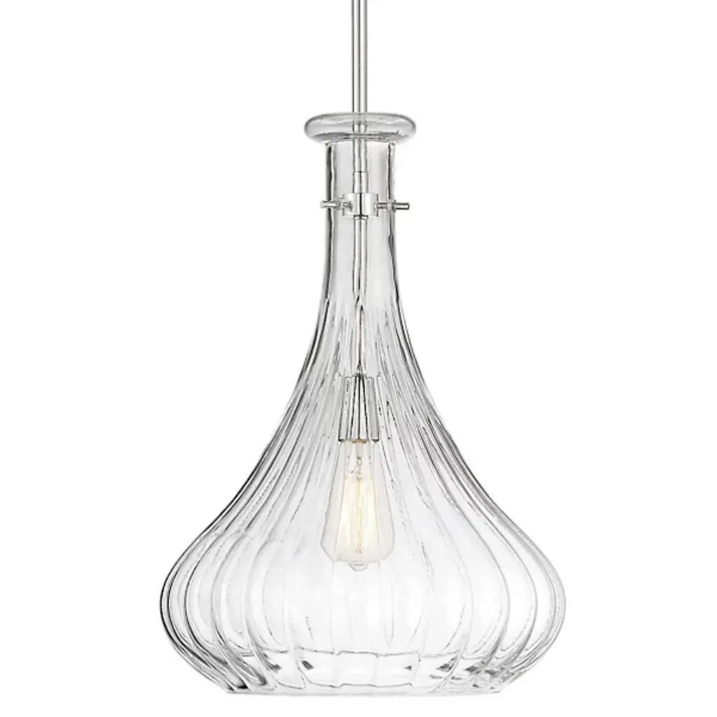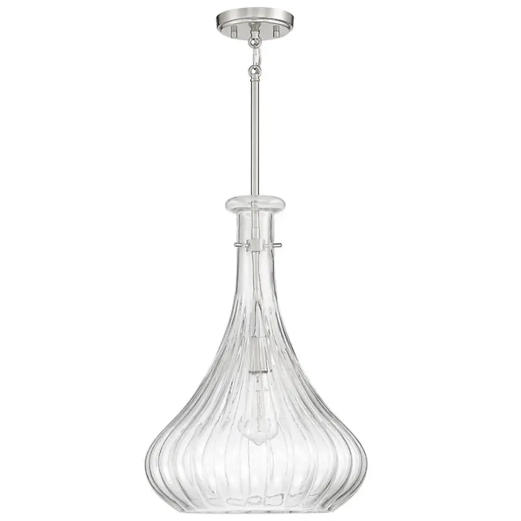 The Bristo Pendant by Savoy House is a beautiful design that adds a bright touch to surroundings. A blown glass shade with a ribbed texture has a fluted neck and a soft, rounded body that allows the single light source within to filter evenly throughout its form. Supported by a single downrod and round canopy, the shapely silhouette of this design adds a decorative touch to the spaces it illuminates.