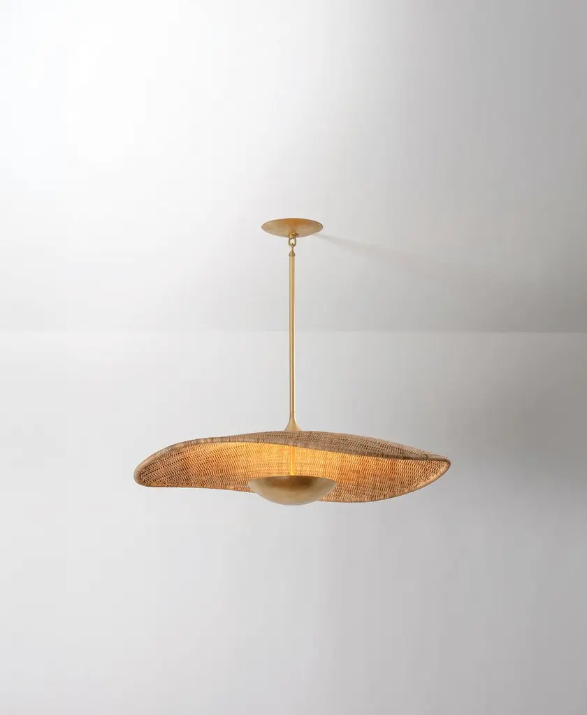 A dialogue between form and material, this nature-inspired design undulates with charm. The interplay of woven rattan and fluid metalwork creates a dynamic and airy suspension overhead. The detailed craftwork and textural finish present a distinctive, organic look. Illuminated by LED, this product is available in two pendant sizes. *Due to the one-of-a-kind nature of the medium, exact colors and patterns may vary slightly from the image shown.