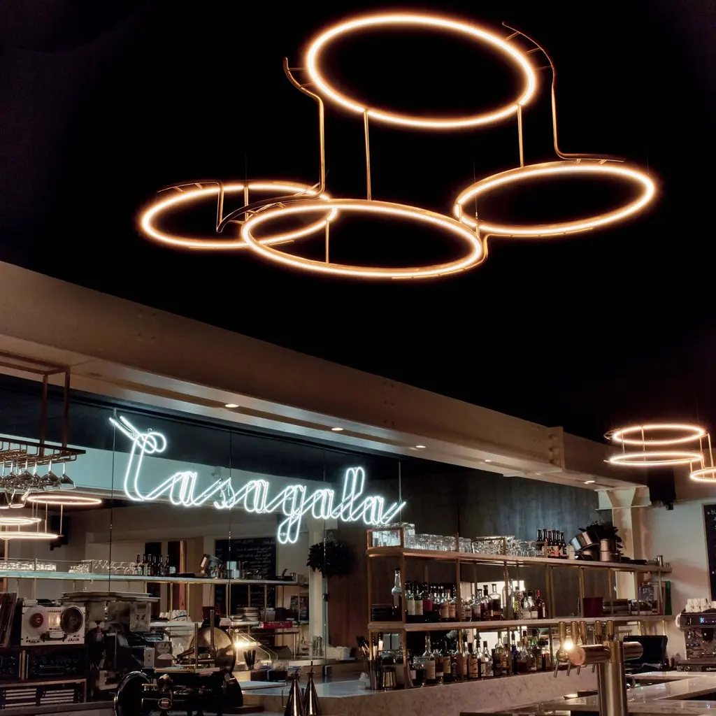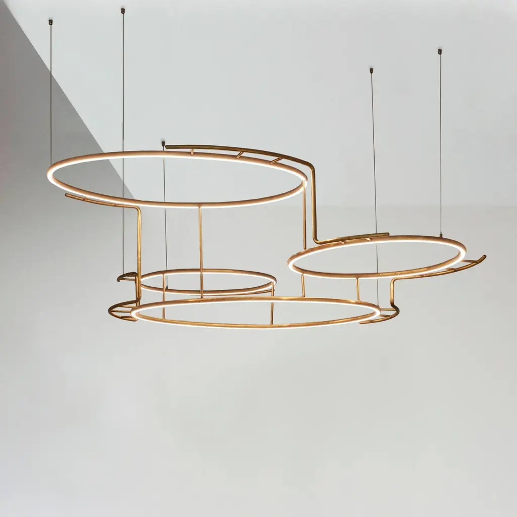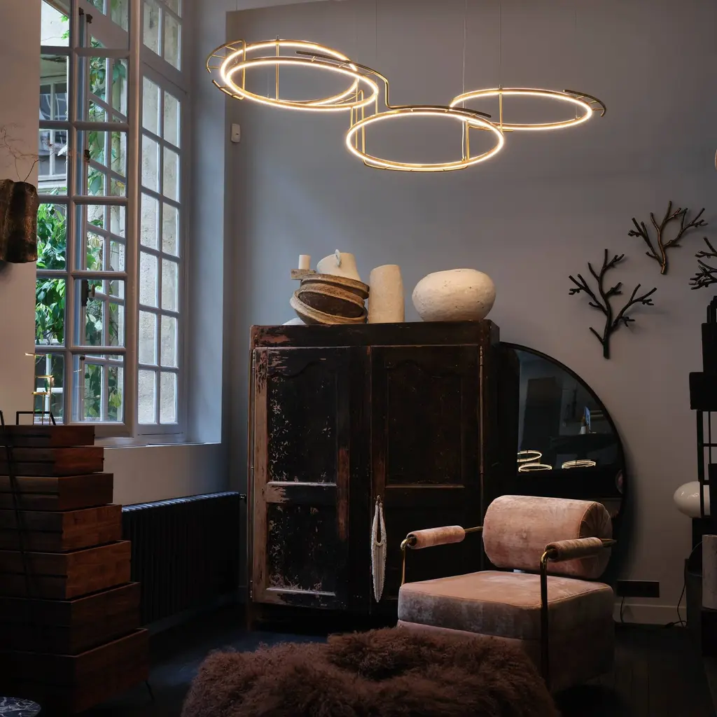 French design emminence Éric de Dormael creates a multi-level suspended light sculpture for DCW Éditions Paris with a fluid interplay of varied rounded forms. Rendered in natural brass, the looping structure is powered by an integrated LED to create a subtle interplay of light and shadow, with reflections that dance off the surrounding walls.