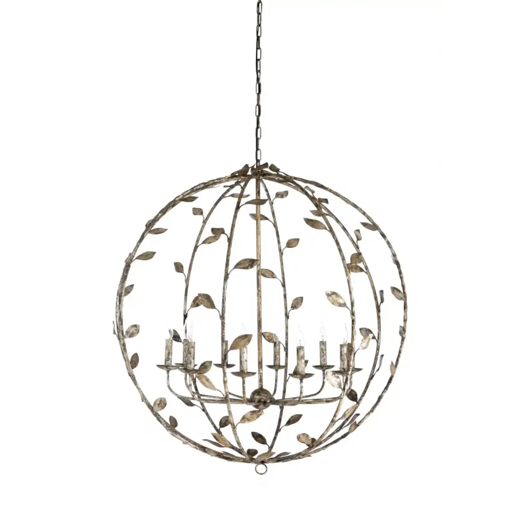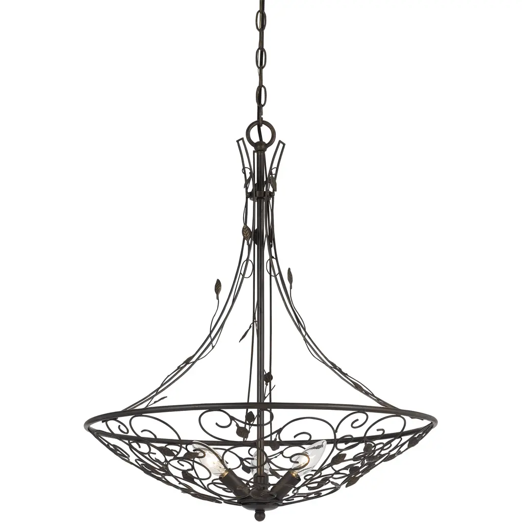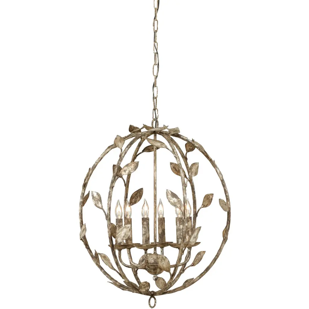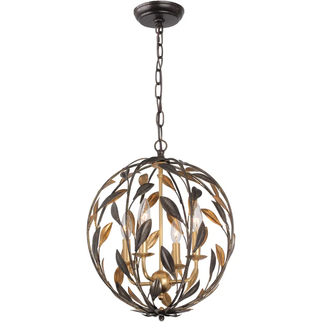 Give your home décor a warm, natural energy with the Broche Pendant by Crystorama. Its spherical, open framework features an ingenious blend of English Bronze and Antique Gold that has been sculpted into branches and leaves. This structure surrounds an inner candelabra which adds a sense of refinement to the organic design as well as a robust ambient light that is pleasant and useful.