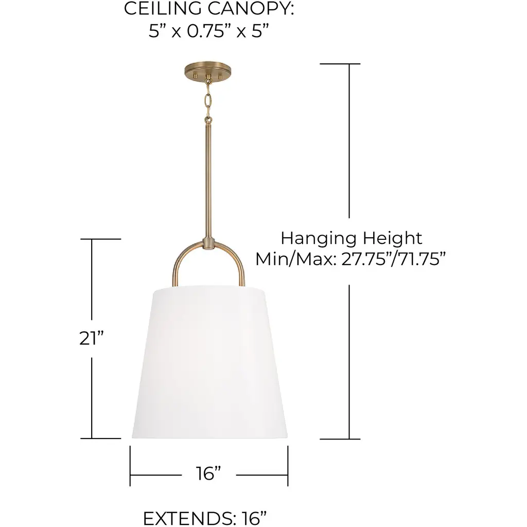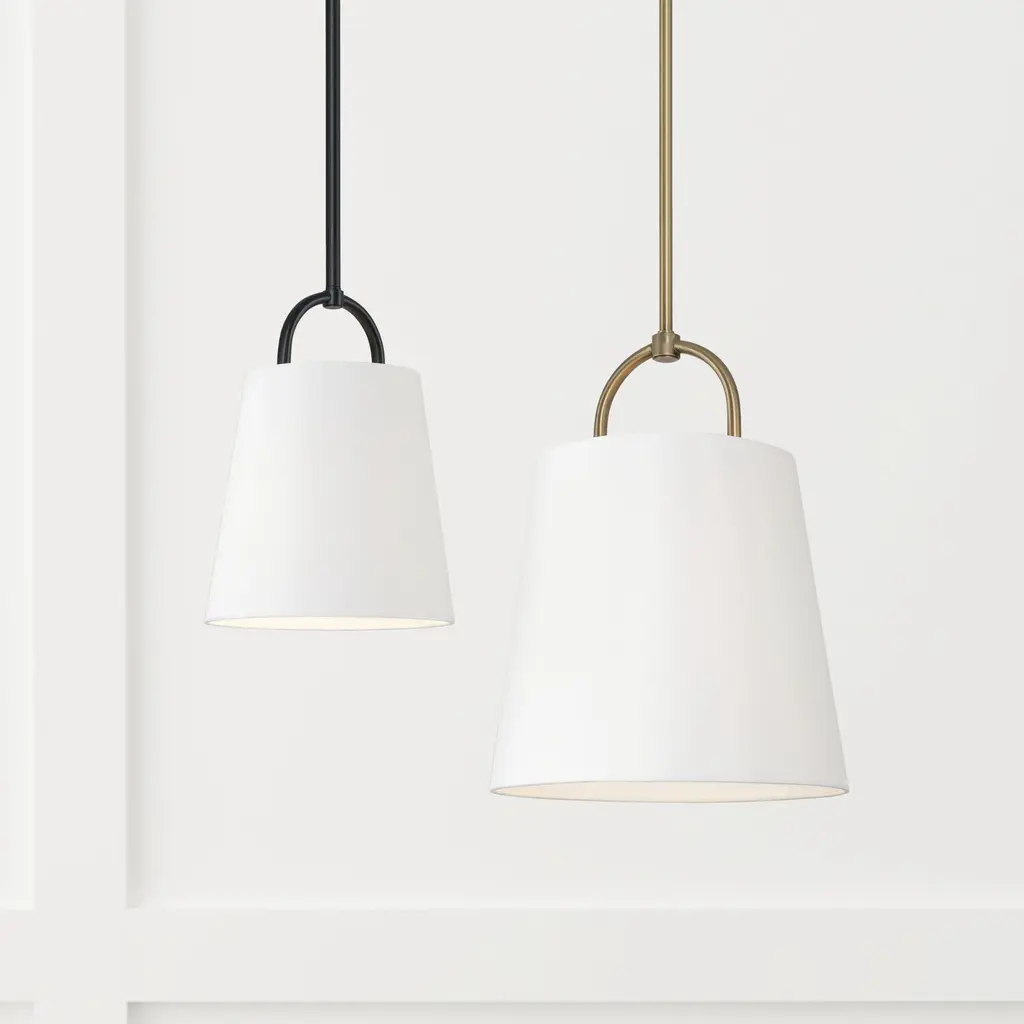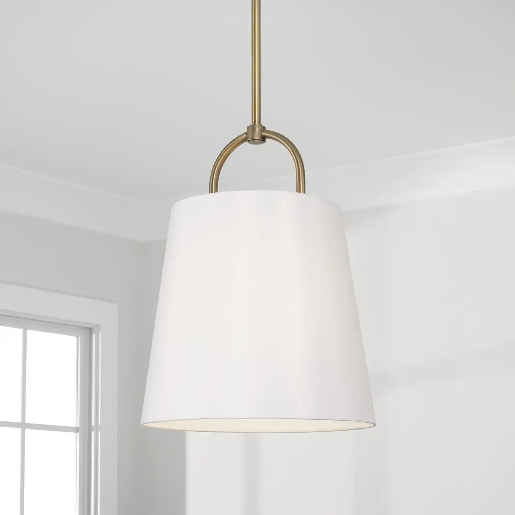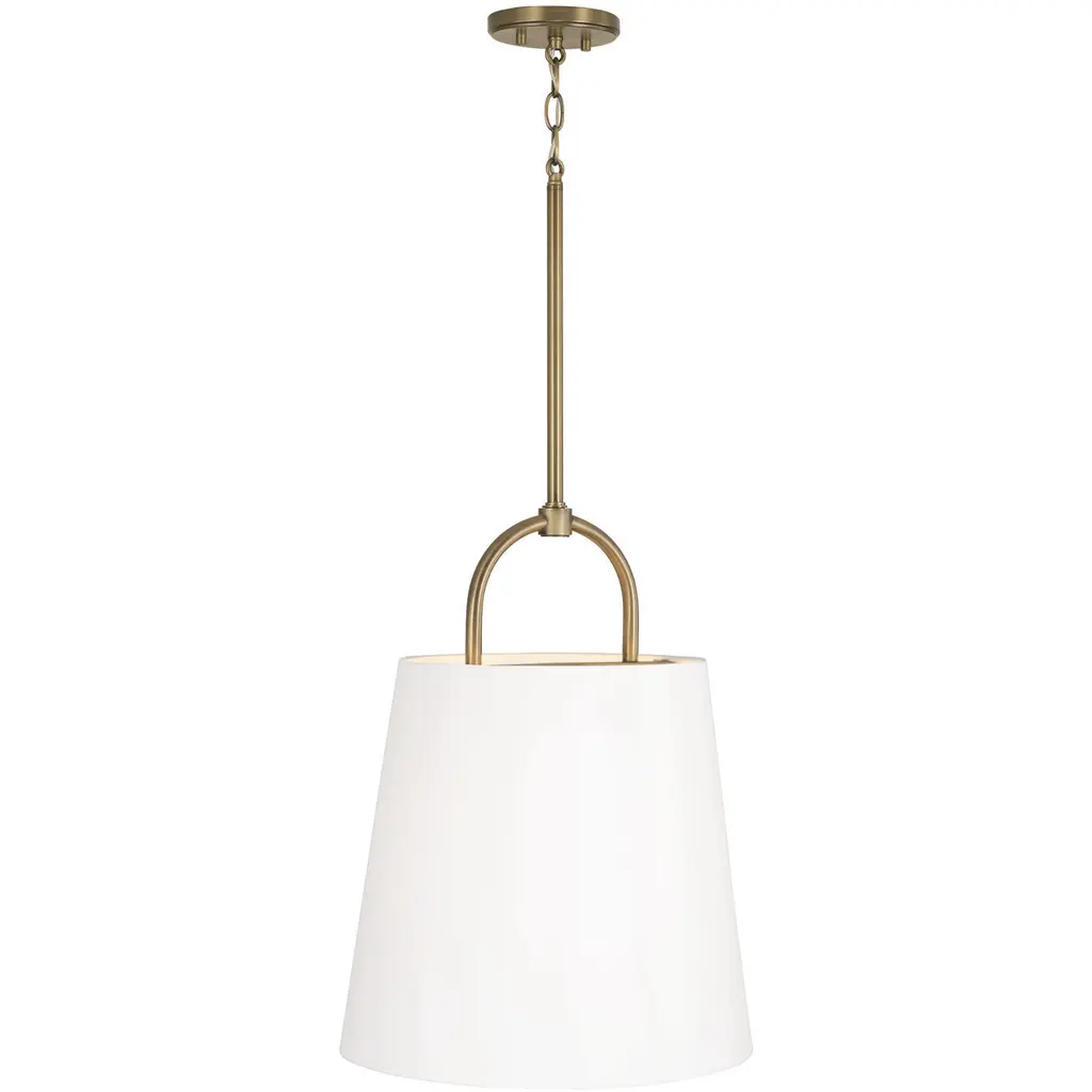 Embodying true minimalist form, the Brody Medium Pendant brings sleek, simplified style. The Aged Brass finish enhances the classic look of the white fabric shade to deliver sophisticated, less-is-more design. The open arched top meets again just below the shade to form a single socket, creating this unique look while balancing the pendant's light source.