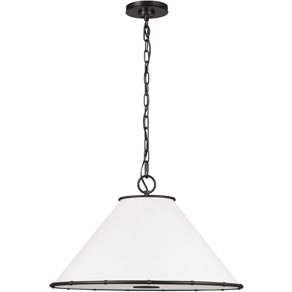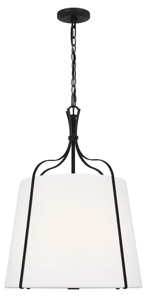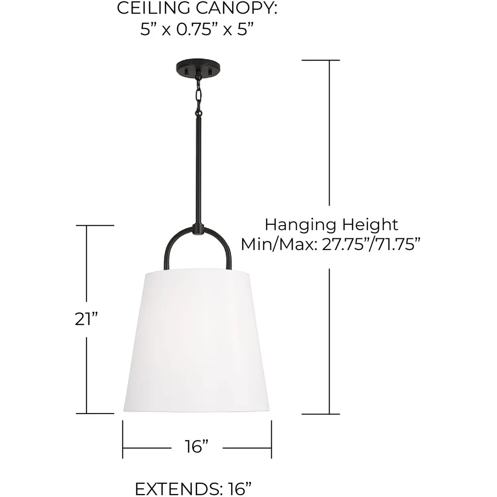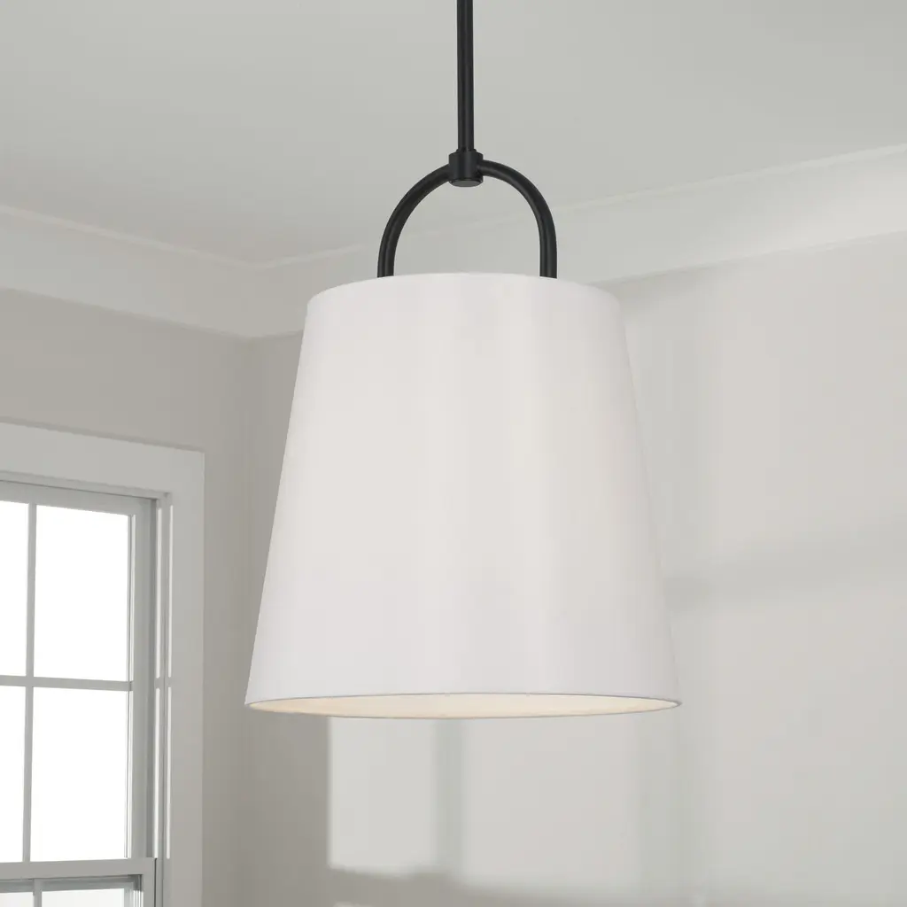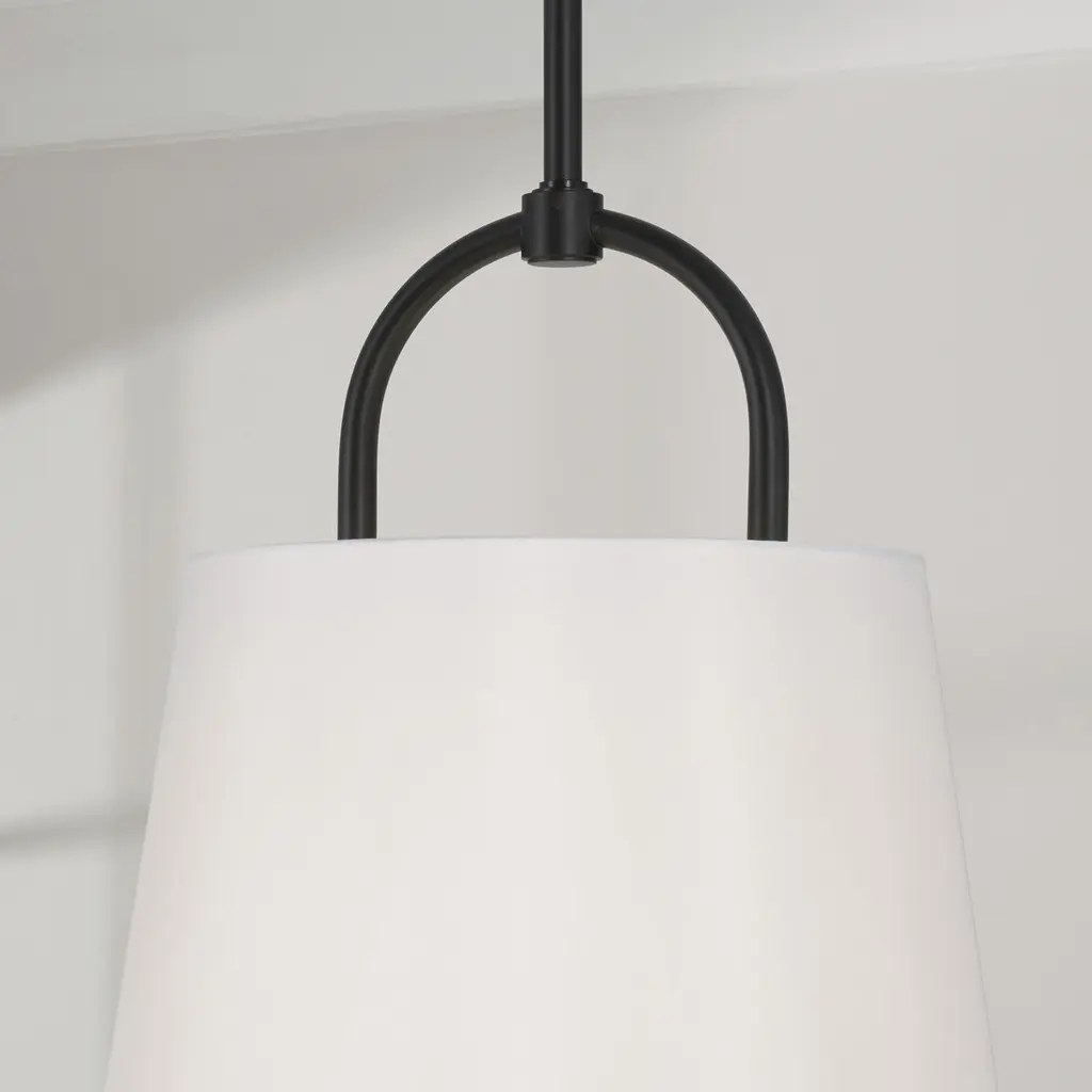 Embodying true minimalist form, the Brody Medium Pendant brings sleek, simplified style. The Matte Black finish enhances the classic look of the white fabric shade to deliver sophisticated, less-is-more design. The open arched top meets again just below the shade to form a single socket, creating this unique look while balancing the pendant's light source.