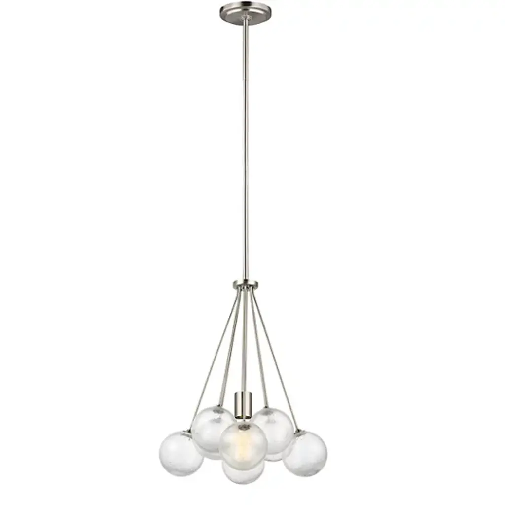 The Bronzeville Small Pendant by Visual Comfort Studio, formerly known as Sea Gull Lighting, is an elegant, mid-century option for your lighting needs. A series of handblown, translucent glass orbs hang from solid metal rods, combining into a singular, sturdy downrod. The orbs encase filament lights, which send out warm and stylish direct lighting. Rated for damp locations and able to be mounted on flat or slanted ceilings, the Bronzeville Pendant is a versatile option for focused lighting in your living spaces.