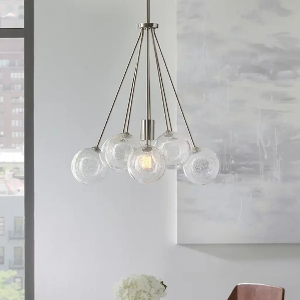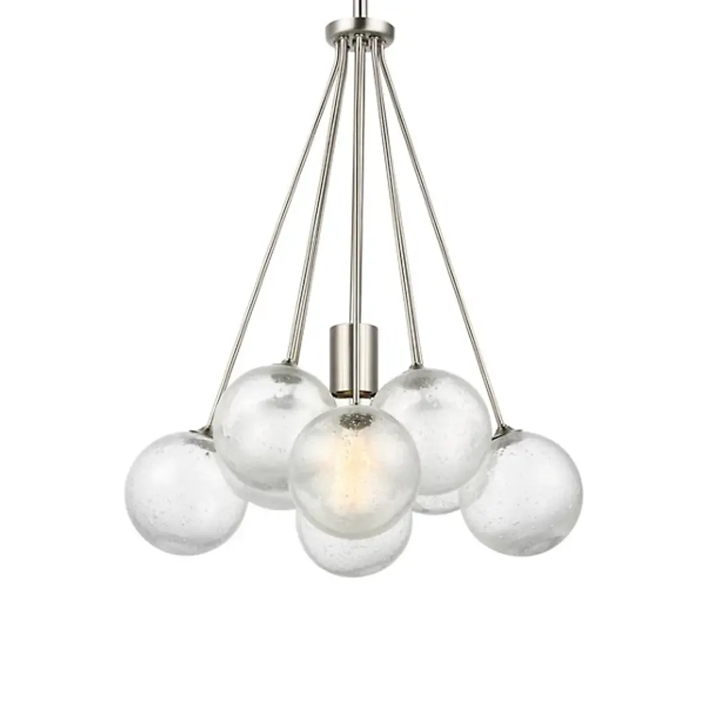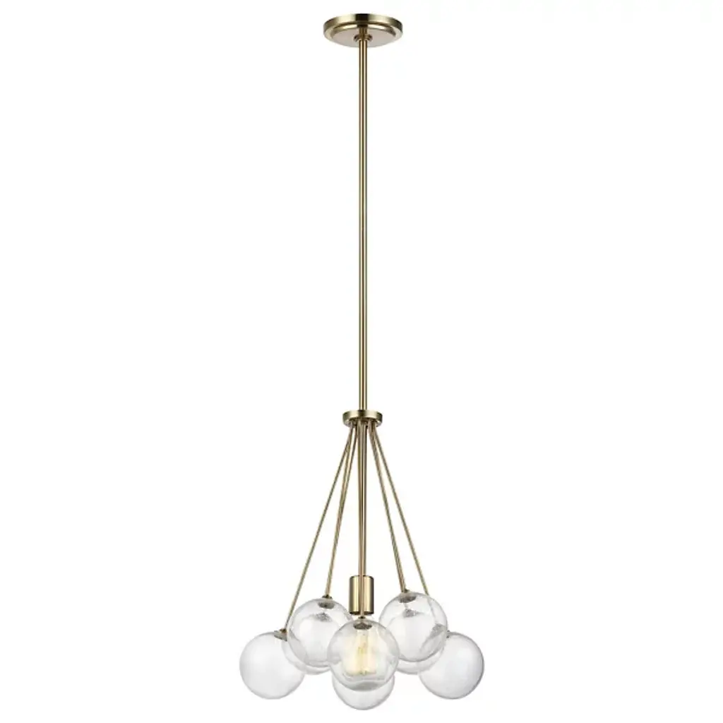 The Bronzeville Small Pendant by Visual Comfort Studio, formerly known as Sea Gull Lighting, is an elegant, mid-century option for your lighting needs. A series of handblown, translucent glass orbs hang from solid metal rods, combining into a singular, sturdy downrod. The orbs encase filament lights, which send out warm and stylish direct lighting. Rated for damp locations and able to be mounted on flat or slanted ceilings, the Bronzeville Pendant is a versatile option for focused lighting in your living spaces.